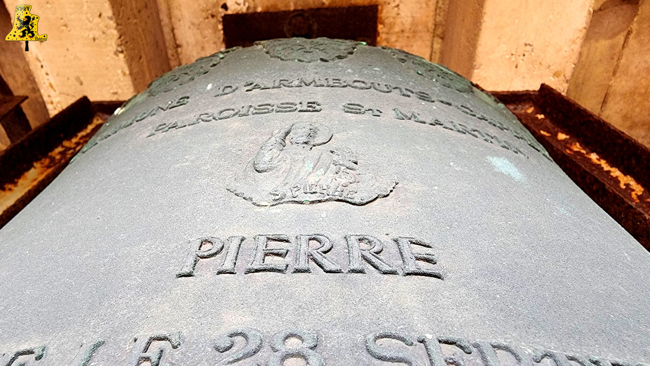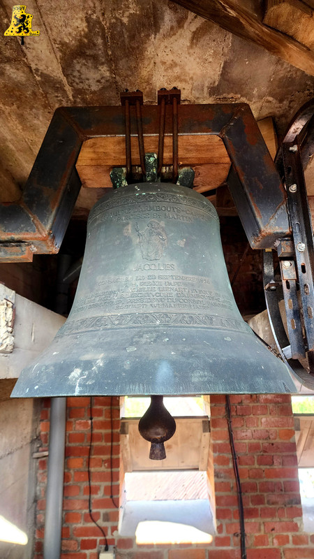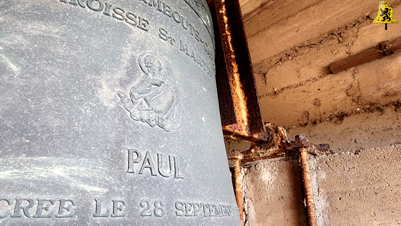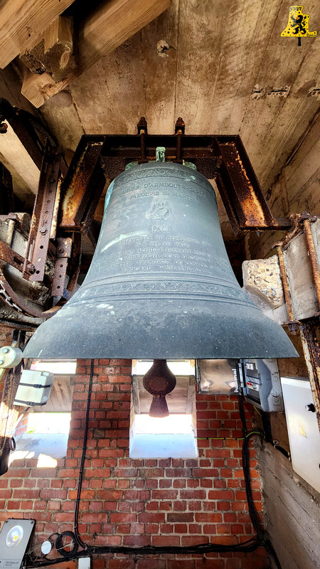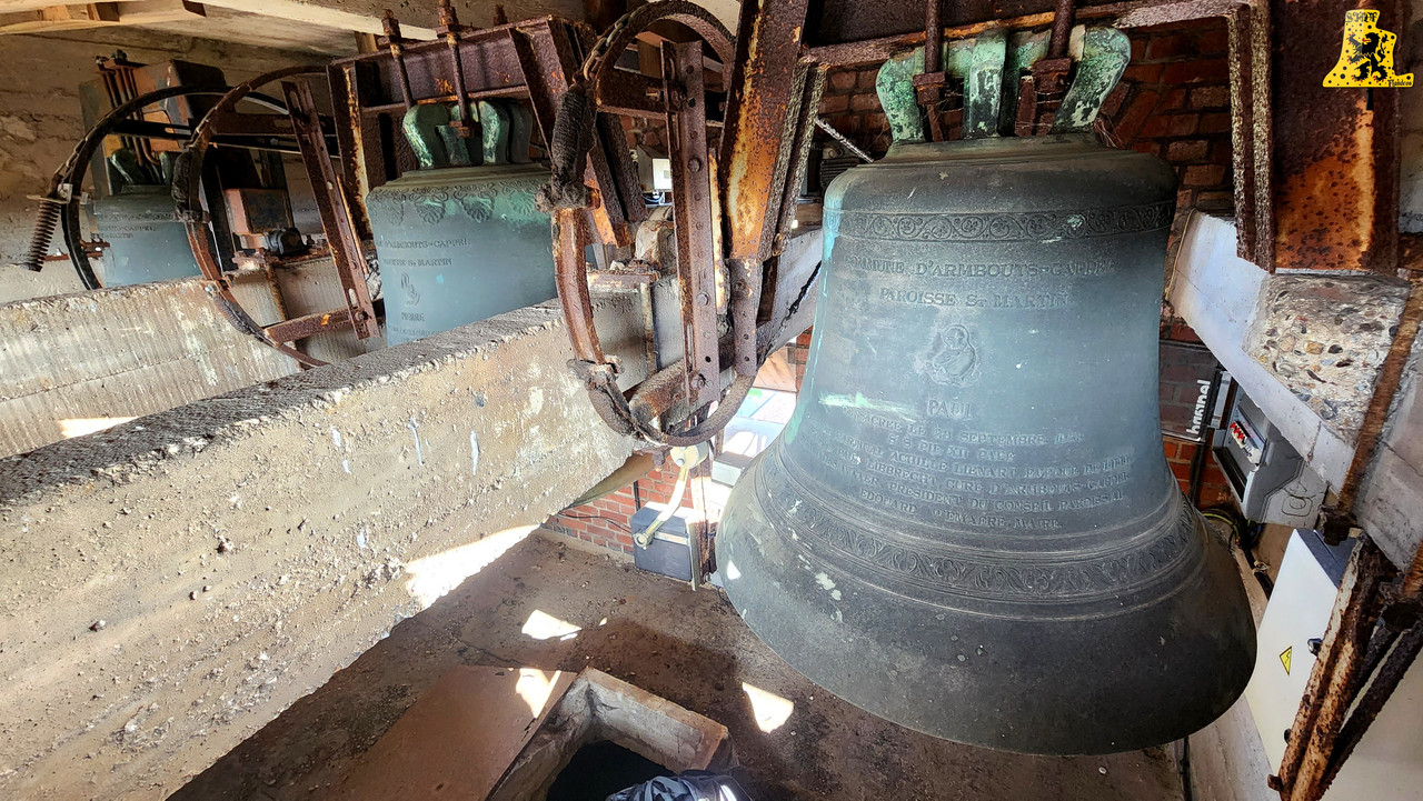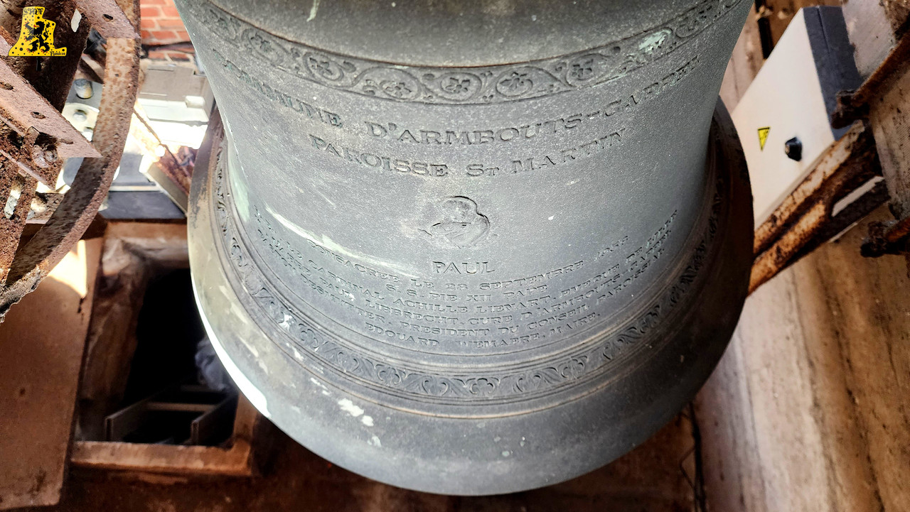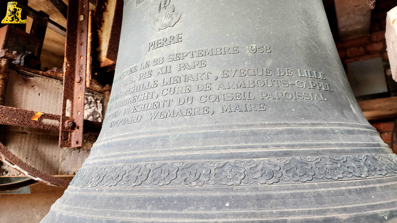 C‘est à Armbouts-Cappel, village de 2 150 habitants, que je vais me rendre, pour vous partager le patrimoine campanaire de la commune. A titre personnel, je suis très heureux de reprendre mes visites en Flandre, après plus d’un an et demi d’absence ici. L‘église de cette charmante commune fut construite en 1 957, à la suite de la destruction durant la 2e guerre mondiale de l’ancienne église du village. Construite avec un style extérieur plutôt moderne, ses dimensions sont relativement modeste, le clocher pointe à environ 20 petits mètres du sol. L‘intérieur n’est pas en reste, et est particulièrement joli. En effet, l’alliance entre bois et Briques se fait à merveille, le mobilier, moderne lui aussi, sublime encore un peu plus cet espace chaleureux. Enfin, il est intéressant de noter, que les vitraux de l’église sont classés, ils sont les œuvres de Jean Bertholle. L‘accès à la chambre des cloches est relativement simple, il nous faudra gravir en tout, 10 mètres avant de pouvoir apercevoir les cloches. Ces cloches se comptent au nombre de 3. Elles reposent toutes sur des poutres en béton armée, le béton armée est un alliage d’éléments tels que du ciment, gravier et sable, qui, en plus de ça, vient s’ajuter de la ferraille. La description sera expresse, puisqu’elles ont toutes été fondue dans les ateliers Paccard d’Annecy-Le-Vieux, le 28 septembre 1 958. La plus grosse des cloches prend le nom de Pierre, son diamètre est de 90 cm, pour un poids de 440 kg. La moyenne, Paul de son prénom, pèse 320 kg, pour un diamètre de 80 cm. Et la plus petite, avec un poids affichant 225 kg, se nomme Jacques. Son diamètre dépasse légèrement les 70 cm. Les cloches sont entretenues, mais l’air marin, bien plus corrosif qu’à l’intérieur des terres, use davantage les équipements des cloches. cependant, le joug de la plus petite des cloches fut changé. Enfin, comme vous avez pu le constater, il manque la chasse du battant de la grosse cloche, vraisemblablement brisé du à la rouille, et, du fait de cet incident, la cloche boîte énormément. En tout cas, ça n’enlève en rien ma grande satisfaction que d’être venue ici, et avec ce joli petit Pater-Noster en La3, Si3 et Do#4, ça met de bonne humeur.