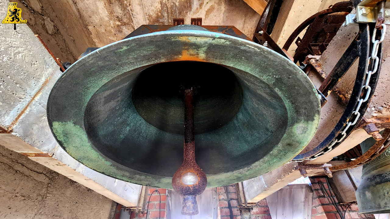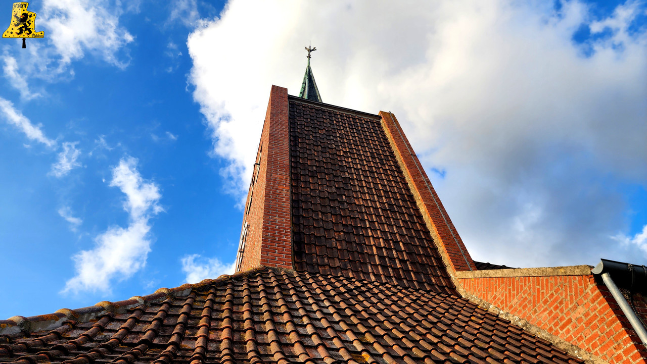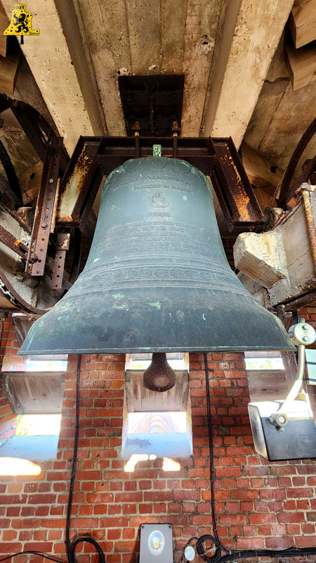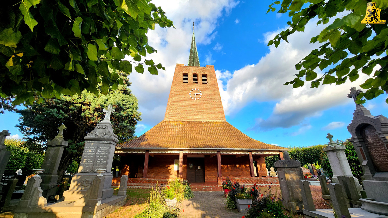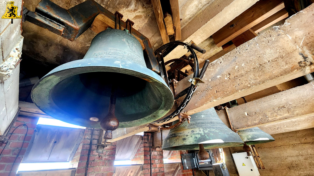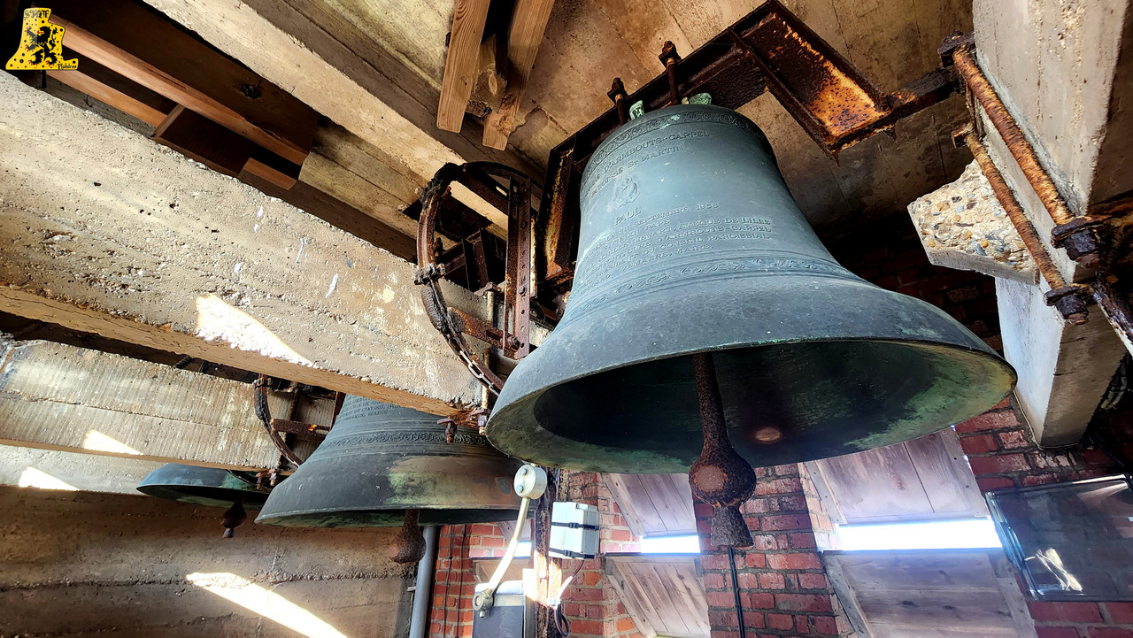 C‘est à Armbouts-Cappel, village de 2 150 habitants, que je vais me rendre, pour vous partager le patrimoine campanaire de la commune. A titre personnel, je suis très heureux de reprendre mes visites en Flandre, après plus d’un an et demi d’absence ici. L‘église de cette charmante commune fut construite en 1 957, à la suite de la destruction durant la 2e guerre mondiale de l’ancienne église du village. Construite avec un style extérieur plutôt moderne, ses dimensions sont relativement modeste, le clocher pointe à environ 20 petits mètres du sol. L‘intérieur n’est pas en reste, et est particulièrement joli. En effet, l’alliance entre bois et Briques se fait à merveille, le mobilier, moderne lui aussi, sublime encore un peu plus cet espace chaleureux. Enfin, il est intéressant de noter, que les vitraux de l’église sont classés, ils sont les œuvres de Jean Bertholle. L‘accès à la chambre des cloches est relativement simple, il nous faudra gravir en tout, 10 mètres avant de pouvoir apercevoir les cloches. Ces cloches se comptent au nombre de 3. Elles reposent toutes sur des poutres en béton armée, le béton armée est un alliage d’éléments tels que du ciment, gravier et sable, qui, en plus de ça, vient s’ajuter de la ferraille. La description sera expresse, puisqu’elles ont toutes été fondue dans les ateliers Paccard d’Annecy-Le-Vieux, le 28 septembre 1 958. La plus grosse des cloches prend le nom de Pierre, son diamètre est de 90 cm, pour un poids de 440 kg. La moyenne, Paul de son prénom, pèse 320 kg, pour un diamètre de 80 cm. Et la plus petite, avec un poids affichant 225 kg, se nomme Jacques. Son diamètre dépasse légèrement les 70 cm. Les cloches sont entretenues, mais l’air marin, bien plus corrosif qu’à l’intérieur des terres, use davantage les équipements des cloches. cependant, le joug de la plus petite des cloches fut changé. Enfin, comme vous avez pu le constater, il manque la chasse du battant de la grosse cloche, vraisemblablement brisé du à la rouille, et, du fait de cet incident, la cloche boîte énormément. En tout cas, ça n’enlève en rien ma grande satisfaction que d’être venue ici, et avec ce joli petit Pater-Noster en La3, Si3 et Do#4, ça met de bonne humeur.