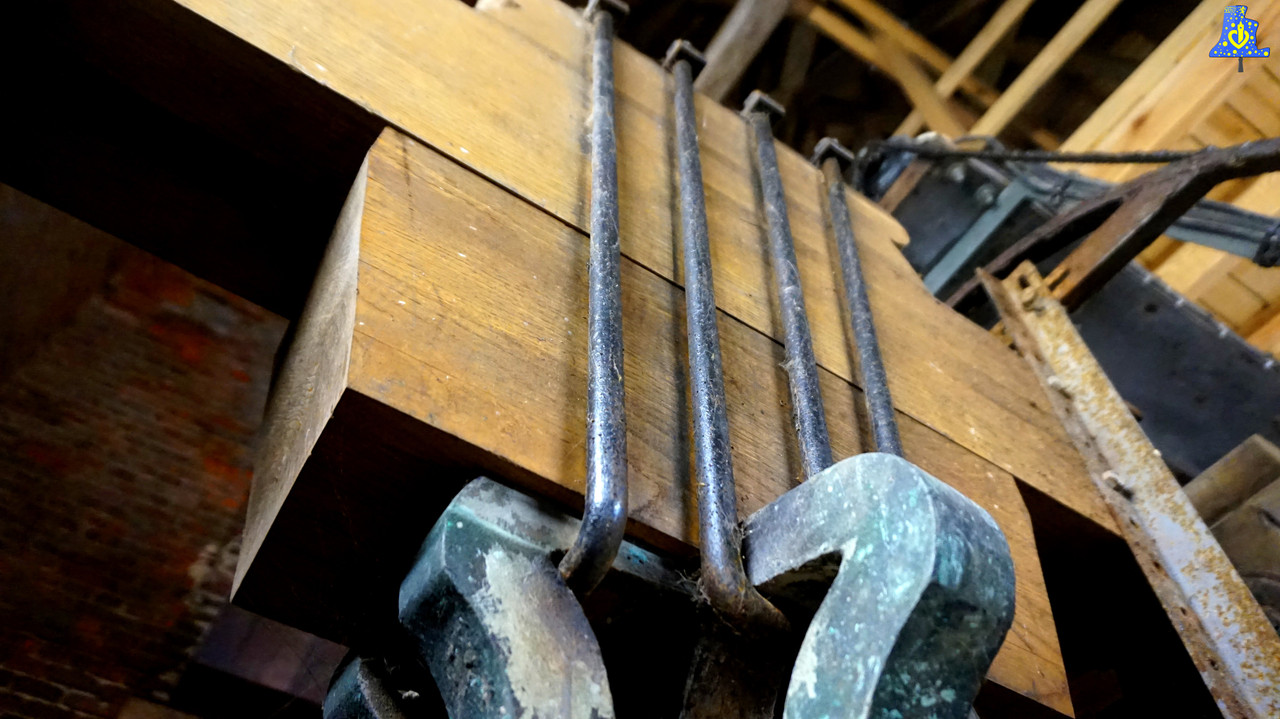 C‘est à Arnèke que je m’apprête a vous faire découvre les cloches de l’église du XVIIe, après avoir gravi les quelques 20 mètres via un escalier en colimaçon, nous pouvons admirer ces deux belles cloches, deux cloches aux allures de sonnerie comtoise, avec une cloche de taille moyenne, et une autre, assez imposante! Nous pouvons voir les deux cloches dans un environnement rénové il y a que quelques années, avec un beffroi plus ancien qui ne montre pas le moindre signe de fatigue. Commençons par la cloche la plus récente, il s’agit de la plus petite. Si je n’ai hélas pas pu prendre le nom de cette cloche de façon certaine, (inscriptions flamandes avec beaucoup de prénoms), j’ai pu voir certains noms, dont celui du deuxième saint vénéré de cette église, Saint-Gohard, c’est donc ce nom que je me suis permis de lui donner en attendant confirmation. En revanche, j’ai pu aisément trouver son créateur. Paul Drouot de Douai l’a fonda en 1 876. Elle pèse près de 800 kg, et donne la note du Mi3. Elle est montée en volée « Super-Lancé ». La grosse, aux inscriptions françaises, se prénomme Marie, elle est le résultat de la refonte d’une autre cloche en 1 846, une refonte qui a permis à la cloche de prendre quelques kilos, puisqu’elle a été « Augmenté », c’est-à-dire que du métal a été ajouté pour la rendre plus grosse, ici, elle pèse 1 650 kg. Cette cloche a également été fondue par la famille Drouot, mais pas à Douai, Joseph Drouot fonda ses cloches à Maisoncelles, en Haute-Marne. Elle chante le Do#3! Il s’agit de la plus grosse cloche répertoriée et filmée sur le site a l’heure où j’écrit cet article.