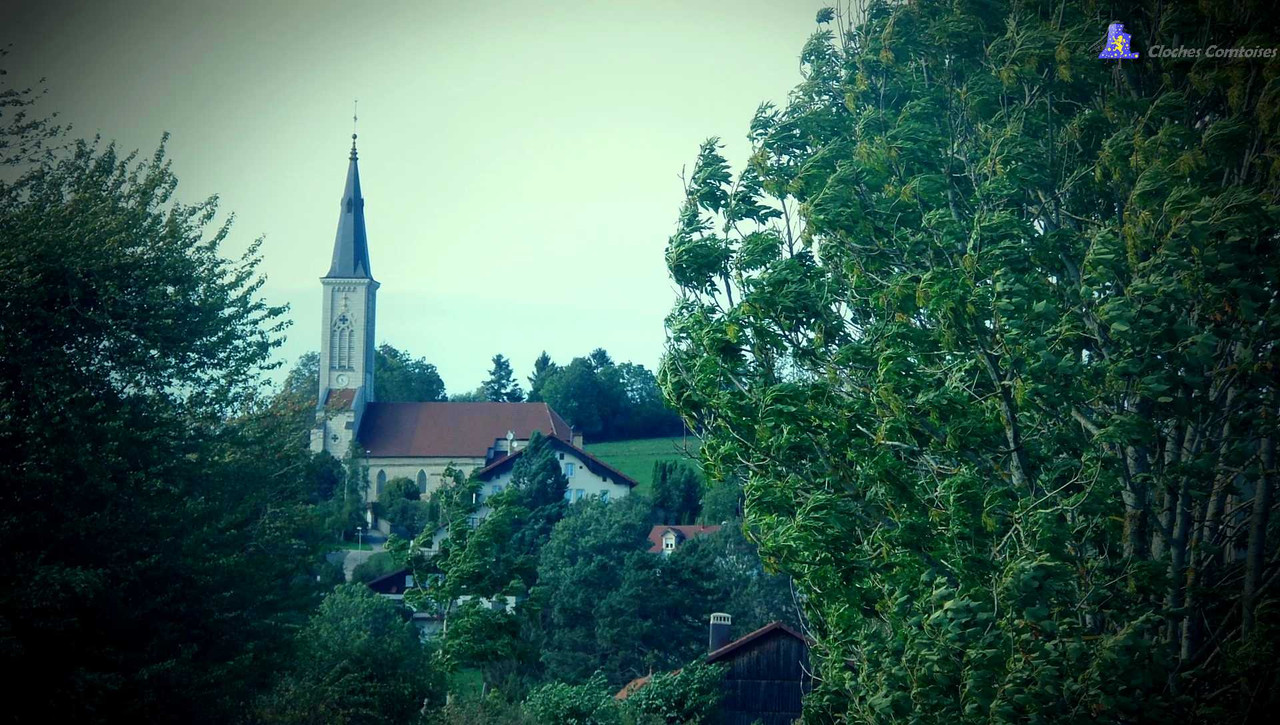Une nouvelle découverte à Bonnétage, et pas des moindres, puisqu’après le Cerneux-Monnot, c’est au tour du plateau du Grand-Communal » d’être visité. C‘est ici que se concentre la plus grosse partie de la commune, qui est donc composée du Grand Communale, Le village bas, Le Village haut, et du Cerneux-Monnot. L‘église mère de la commune, dont ont dit que la pointe du clocher culmine à 1000 m, se trouve au Village haut. Sa flèche s’élève à 40 mètres environ, cette charmante église est surélevée par rapport à tout le village, ce qui la rend visible à des kilomètres à la ronde. En son clocher, nous pouvons y contempler 3 cloches. Deux d’entre elles ont été fondues juste avant la 1ère guerre mondiale. C‘est donc en 1 912 que la commande de deux nouvelles cloches fut passée à la fonderie de Georges Farnier, dont ses ateliers étaient basés à Robécourt. Ces deux cloches, nommées dans l’ordre croissant, Marie-Victoire-Antoinette et Marie-Madeleine-Lucine, pèsent chacune 940 et 665 kg. Leurs diamètres quant à eux sont de 117 cm, et 105 cm. La plus petite des cloches est la plus ancienne des trois, c’est en 1 815 que bon nombre de fondeurs se sont associés pour la produire. Ce sont les Bisontins François Xavier, Louis Roy et Joseph Beau qui coulèrent 535 kg de bronze. Nous reconnaissons là le son et les décors typique des cloches de Louis Roy. Ces trois cloches reposent sur un atypique beffroi métallique qui flash très clairement aux yeux, et il en va de même pour les jougs. Lors de ma venue, je n’avais malheureusement aucun branchement, d’où l’absence de lumière lorsque le ciel s’est fortement assombrit, alors que le beau temps était bien présent durant toute la visite.