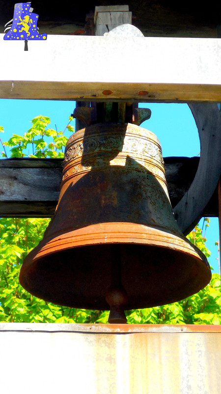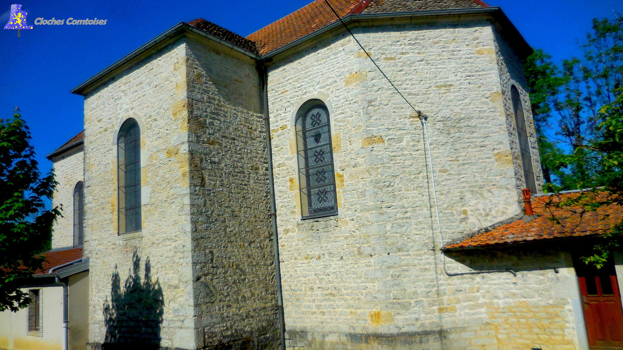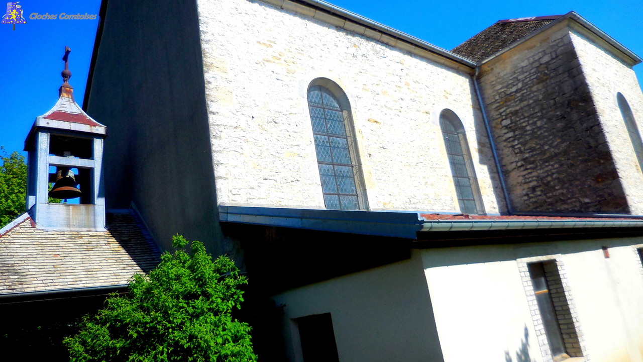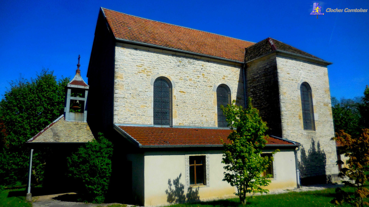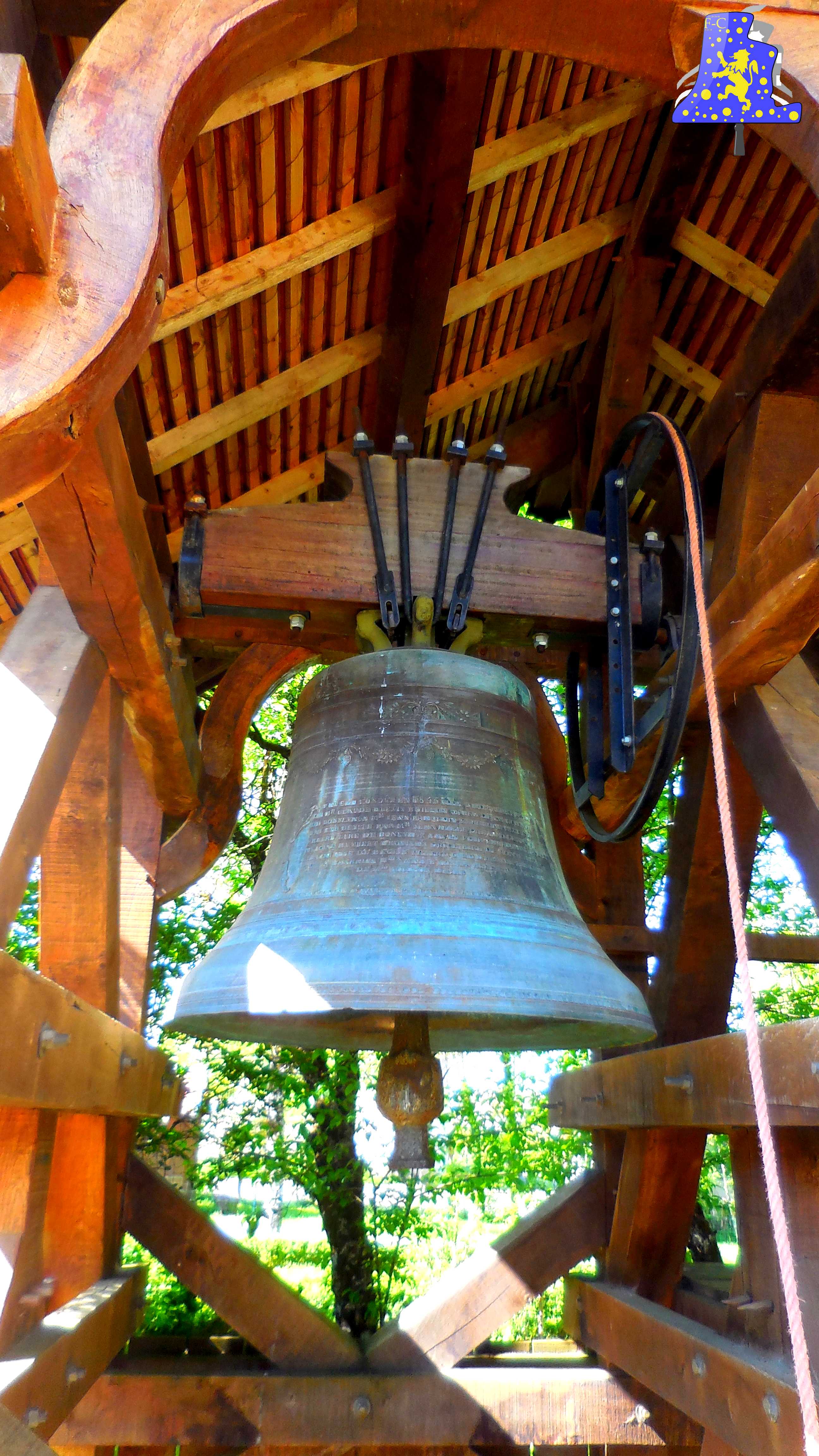 Bonnevaux a été rattaché à la commune d’Ornans, mais reste cependant, très autonome, sûrement du fait que ce petit village est bien isolé par les éléments de mère nature. L‘église du « Village-Haut », a été construite en 1 864. Elle a pour particularité de posséder un magnifique beffroi posé à même le sol, et sur lequel repose une cloche. C‘est franchement atypique, et de mes yeux, dans le Doubs, je ne connais pas d’édifice semblable. L‘intérieur est assez sobre. Outre la cloche sur le beffroi, l’église en compte une deuxième. Celle-ci se situe au-dessus de l’entrée principale de l’église. Son clocheton étant fragile, cette cloche en acier ne sonne plus depuis des décennies. Elle fut fondue en 1 869 par Jacob Holtzer. Etant inaccessible, je n’ai pu prendre d’autres infos, ce qui n’est pas le cas de sa très grande sœur. Posée sur son superbe beffroi, elle nous vient de la fonderie mortuacienne de Bournez, dont la fonte eut lieu en 1 845. Nommée Marie-Louise-Albine, cette cloche nous pèse 600 kg. Elle est en parfait état de sonner, bien que son battant est d’époque.