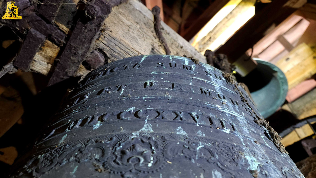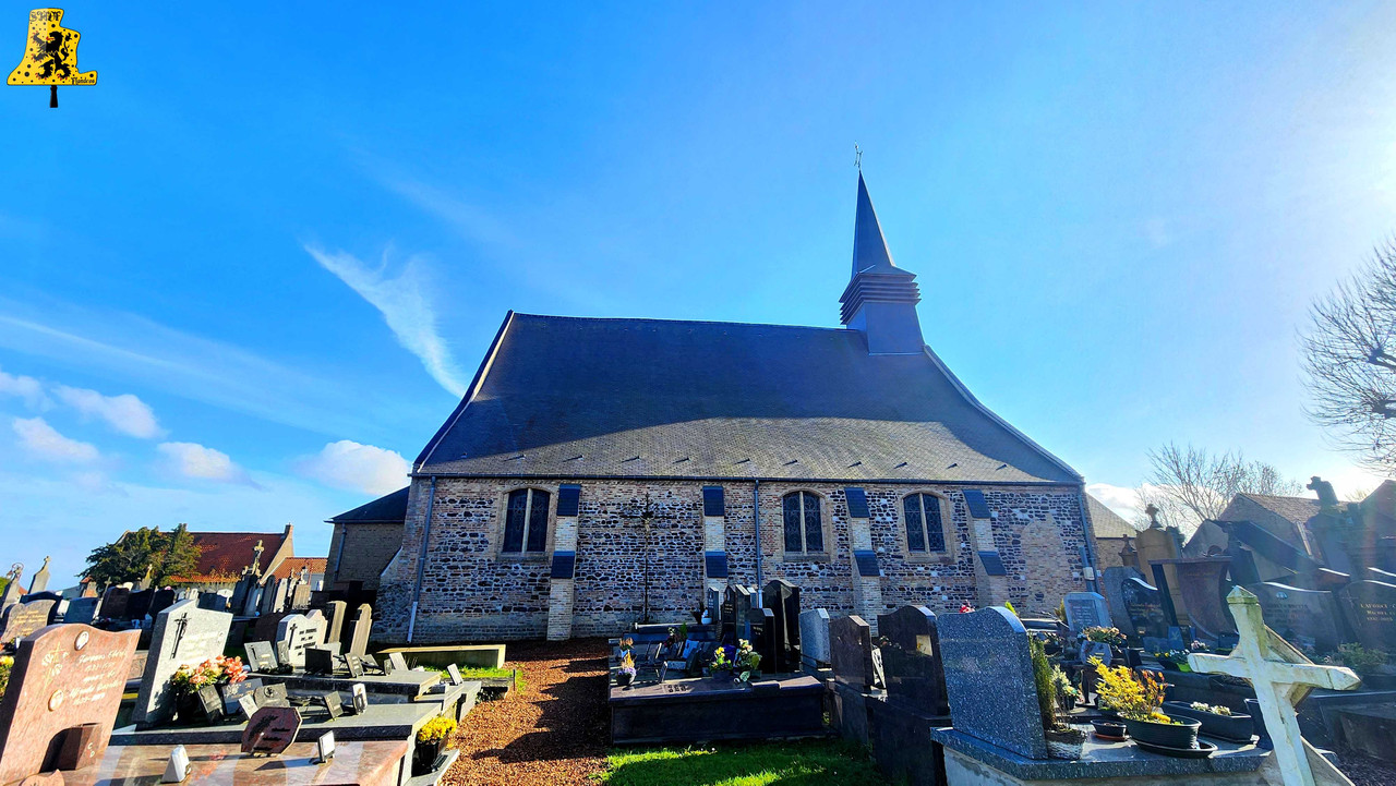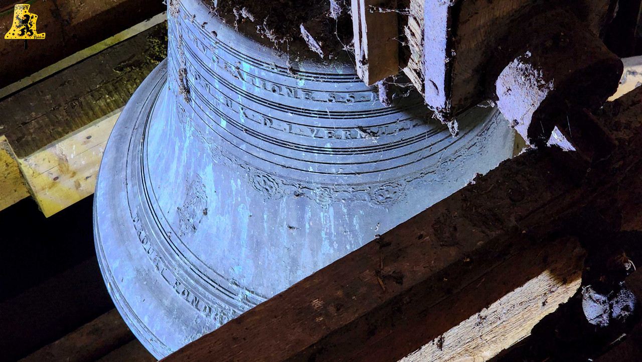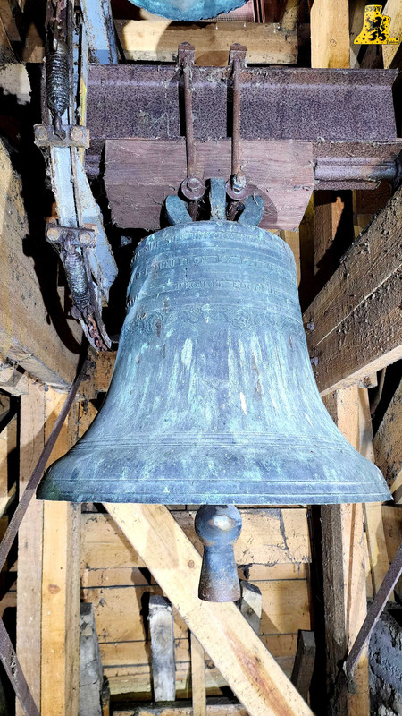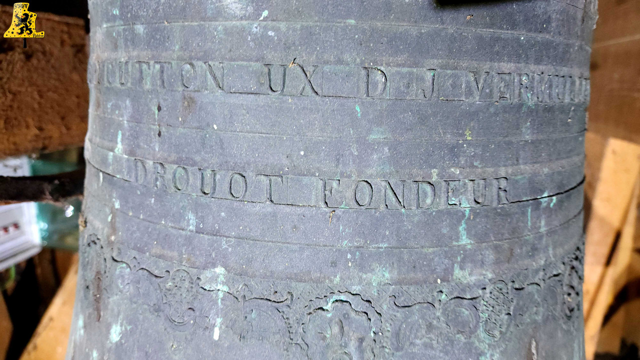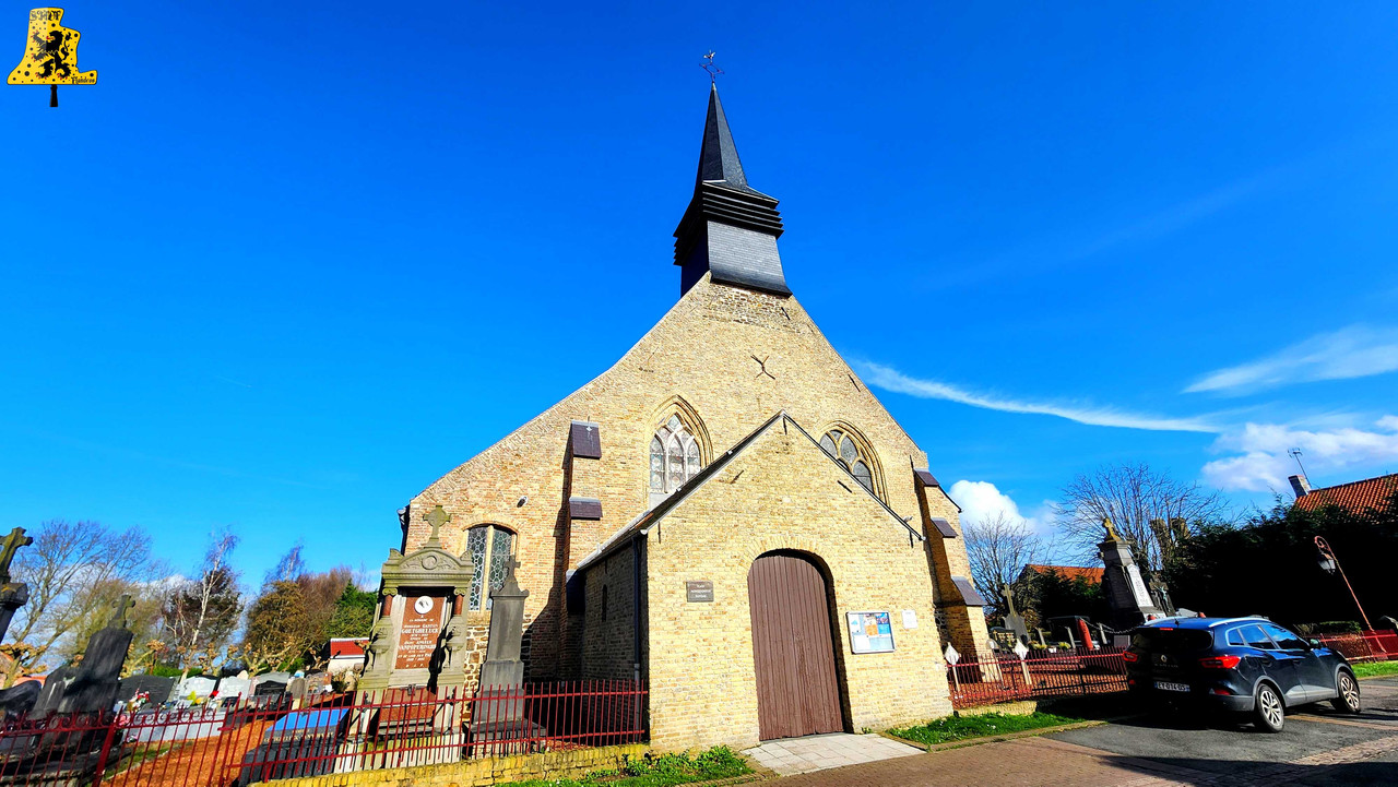 Après avoir été dans la commune voisine de Steene, c’est à Crochte que je vais avoir la chance de vous partager le patrimoine campanaire de l’église, et vous allez voir que les apparences peuvent être trompeuses! Mais avant de parler des cloches, arrêtons nous sur cette charmante petite église. L‘église sous le vocable de Saint-Georges, possèdes de petites dimensions, mais il faut savoir qu’avant guerre, l’église était plus grande. Elle fut touchée par les bombardements, et quelques murs n’ont pu être sauvés. L‘église était aussi pourvue d’une horloge sur son clocher côté porche d’entrée, ce clocher était identique à celui-ci. La commune de Crochte a entrepris de lourds travaux de restauration, à commencer par ses toitures, nefs et clocher. Ensuite, et c’est ce qui a fait la renommée de Crochte, les retables se sont vu offrir une cure de jouvence, mais derrière l’un d’entre eux, se cachait un véritable trésor! Car en effet, un très vieux retable était oublié de tous! Et ce n’est pas n’importe quel retable, puisqu’il s’agit du plus vieux retable flamand découvert à ce jour! Celui-ci, datée de 1 642, était très abimé, il fut donc envoyé en restauration? C‘est un véritable miracle qui eu lieu, puisque la restauration lui a rendu sa beauté d’antan (Voir photo au centre dans la partie « Photo intérieur »). Cette œuvre trône désormais fièrement dans l’église. L‘intérieur est, en plus du retable flamand, un véritable trésor mobilier. Comme à Steene, ici aussi l’église est très richement agencée avec plusieurs mobiliers, et tableaux anciens. Ma surprise ne s’arrête pas là, puisque nous entamons l’ascension jusqu’au clocher. Un accès jusqu’aux cloches qui se mérite, tant celui-ci est assez compliqué. Dans ce tout petit clocher, ma surprise fut grande en constatant qu’il y ait deux cloches, mais en levant ma tête, il y en a une troisième, je n’y croyais pas du tout. Alors il est vrai que 2 des 3 cloches sont malheureusement muettes à la volée, et n’ont probablement pas sonnées depuis des décennies, mais on ne peut pas en vouloir à la commune, tant les investissements pour l’église sont très conséquents alors que Crochte, est une très petite commune. La cloche qui sonne les heures est la plus grosse, elle fut fondue par la fonderie des Drouot, elle est datée en chiffres romain de l’an 1 828. Sur les inscriptions en langue latine, je n’ai malheureusement découvert aucun nom de baptême. Son diamètre est de 82,1 cm, pour un poids de 325 kg environ. Pour la petite, elle provient également de la fonderie des Drouot, mais elle fut fondue 1 an plus tard. Ici aussi, je n’ai pu découvrir de nom. C‘est la seule cloche qui sonne encore à la volée durant les Angélus et les offices quand il y en a. Son diamètre est de 66,8 cm, quant à son poids, il est de 180 kg. Et enfin, la cloche qui, pour moi, est la plus intéressante, est la cloche dite Moyenne. Cette cloche dédiée à Saint-Hubert. Elle fut fondue en 1 784 par Regnaud, un fondeur itinérant Lorrain, dont il a fonda quelques cloches en région Flamande, comme à Killem par exemple. Cette cloche est très intéressante puisqu’elle a survécu à la Révolution Française, et aux grandes guerres. De plus, l’intégralité de ses inscriptions sont en Flamand. Ses démentions sont de 73,8 cm, pour un poids de 230 kg. L‘ensemble des trois cloches chantent en La#3, Si3 et le Ré4 pour la petite. Vous pouvez écouter une simulation de la sonnerie des trois cloches par montage audio, puisque l’état des cloches ne permettent pas une mise en branle manuelle.