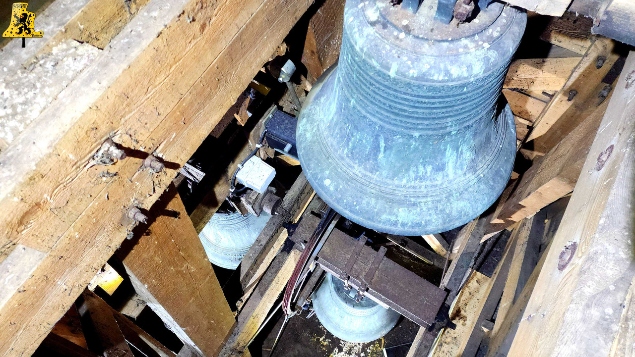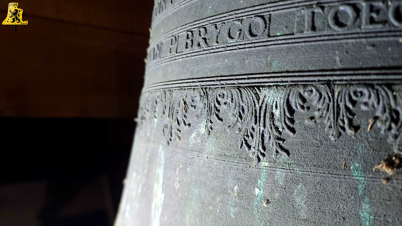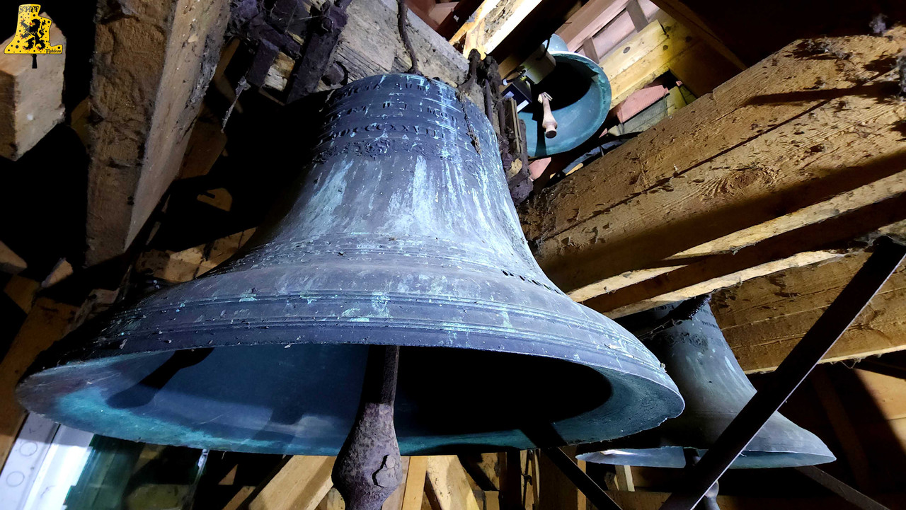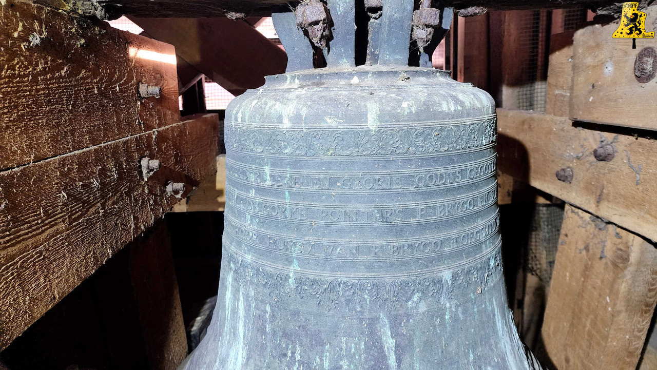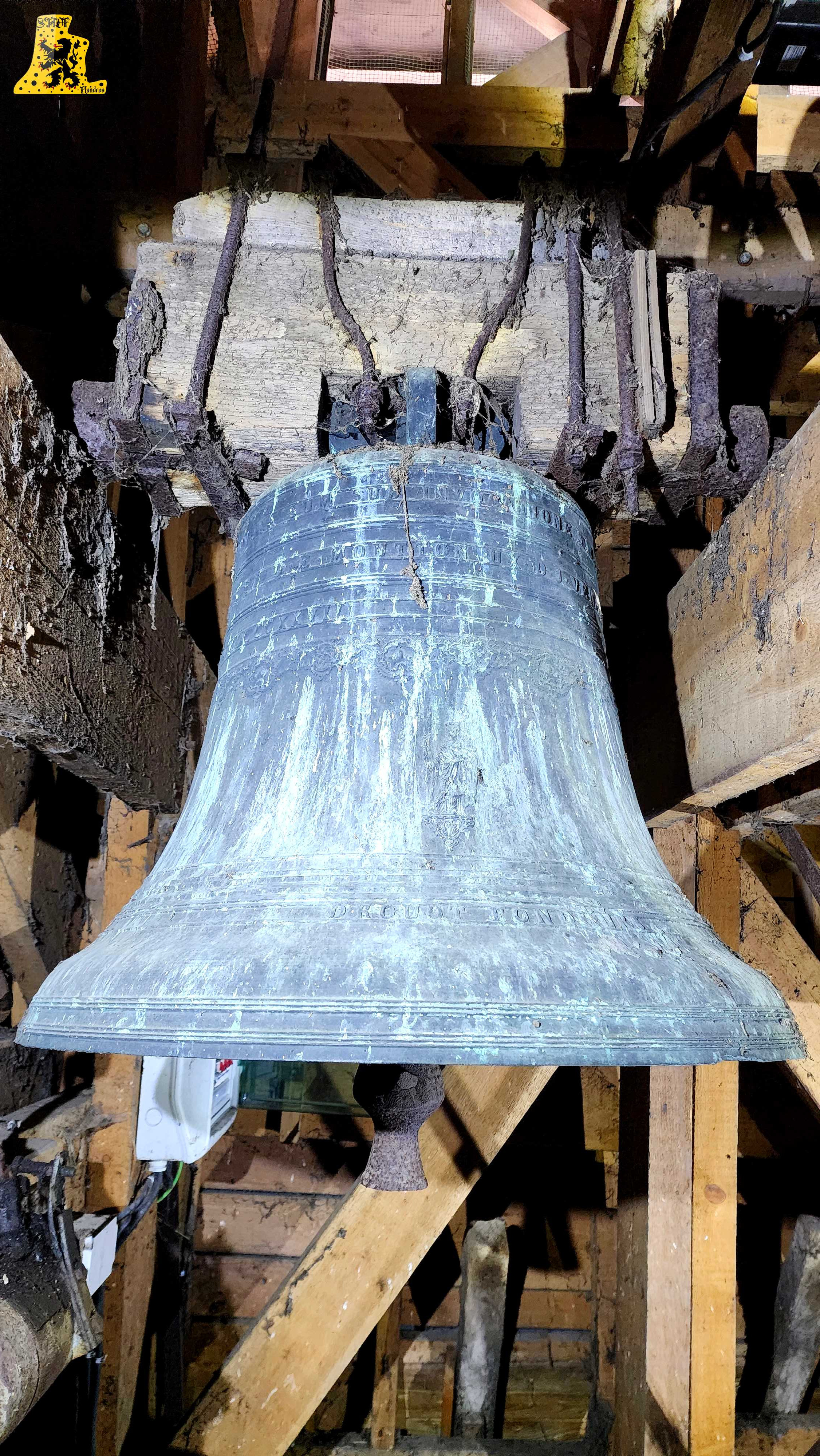 Après avoir été dans la commune voisine de Steene, c’est à Crochte que je vais avoir la chance de vous partager le patrimoine campanaire de l’église, et vous allez voir que les apparences peuvent être trompeuses! Mais avant de parler des cloches, arrêtons nous sur cette charmante petite église. L‘église sous le vocable de Saint-Georges, possèdes de petites dimensions, mais il faut savoir qu’avant guerre, l’église était plus grande. Elle fut touchée par les bombardements, et quelques murs n’ont pu être sauvés. L‘église était aussi pourvue d’une horloge sur son clocher côté porche d’entrée, ce clocher était identique à celui-ci. La commune de Crochte a entrepris de lourds travaux de restauration, à commencer par ses toitures, nefs et clocher. Ensuite, et c’est ce qui a fait la renommée de Crochte, les retables se sont vu offrir une cure de jouvence, mais derrière l’un d’entre eux, se cachait un véritable trésor! Car en effet, un très vieux retable était oublié de tous! Et ce n’est pas n’importe quel retable, puisqu’il s’agit du plus vieux retable flamand découvert à ce jour! Celui-ci, datée de 1 642, était très abimé, il fut donc envoyé en restauration? C‘est un véritable miracle qui eu lieu, puisque la restauration lui a rendu sa beauté d’antan (Voir photo au centre dans la partie « Photo intérieur »). Cette œuvre trône désormais fièrement dans l’église. L‘intérieur est, en plus du retable flamand, un véritable trésor mobilier. Comme à Steene, ici aussi l’église est très richement agencée avec plusieurs mobiliers, et tableaux anciens. Ma surprise ne s’arrête pas là, puisque nous entamons l’ascension jusqu’au clocher. Un accès jusqu’aux cloches qui se mérite, tant celui-ci est assez compliqué. Dans ce tout petit clocher, ma surprise fut grande en constatant qu’il y ait deux cloches, mais en levant ma tête, il y en a une troisième, je n’y croyais pas du tout. Alors il est vrai que 2 des 3 cloches sont malheureusement muettes à la volée, et n’ont probablement pas sonnées depuis des décennies, mais on ne peut pas en vouloir à la commune, tant les investissements pour l’église sont très conséquents alors que Crochte, est une très petite commune. La cloche qui sonne les heures est la plus grosse, elle fut fondue par la fonderie des Drouot, elle est datée en chiffres romain de l’an 1 828. Sur les inscriptions en langue latine, je n’ai malheureusement découvert aucun nom de baptême. Son diamètre est de 82,1 cm, pour un poids de 325 kg environ. Pour la petite, elle provient également de la fonderie des Drouot, mais elle fut fondue 1 an plus tard. Ici aussi, je n’ai pu découvrir de nom. C‘est la seule cloche qui sonne encore à la volée durant les Angélus et les offices quand il y en a. Son diamètre est de 66,8 cm, quant à son poids, il est de 180 kg. Et enfin, la cloche qui, pour moi, est la plus intéressante, est la cloche dite Moyenne. Cette cloche dédiée à Saint-Hubert. Elle fut fondue en 1 784 par Regnaud, un fondeur itinérant Lorrain, dont il a fonda quelques cloches en région Flamande, comme à Killem par exemple. Cette cloche est très intéressante puisqu’elle a survécu à la Révolution Française, et aux grandes guerres. De plus, l’intégralité de ses inscriptions sont en Flamand. Ses démentions sont de 73,8 cm, pour un poids de 230 kg. L‘ensemble des trois cloches chantent en La#3, Si3 et le Ré4 pour la petite. Vous pouvez écouter une simulation de la sonnerie des trois cloches par montage audio, puisque l’état des cloches ne permettent pas une mise en branle manuelle.