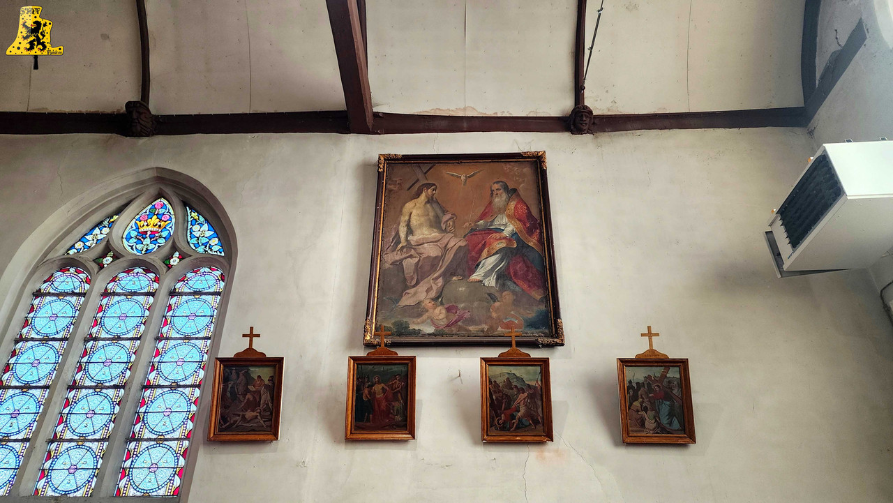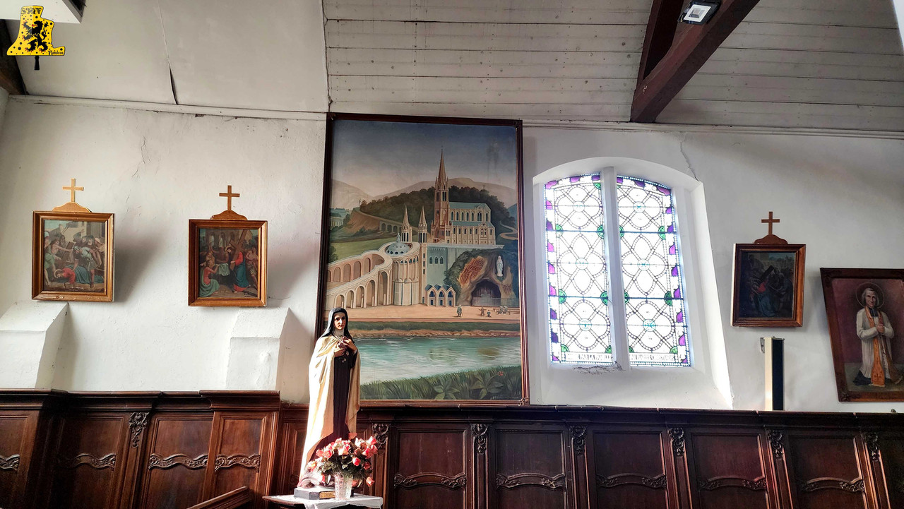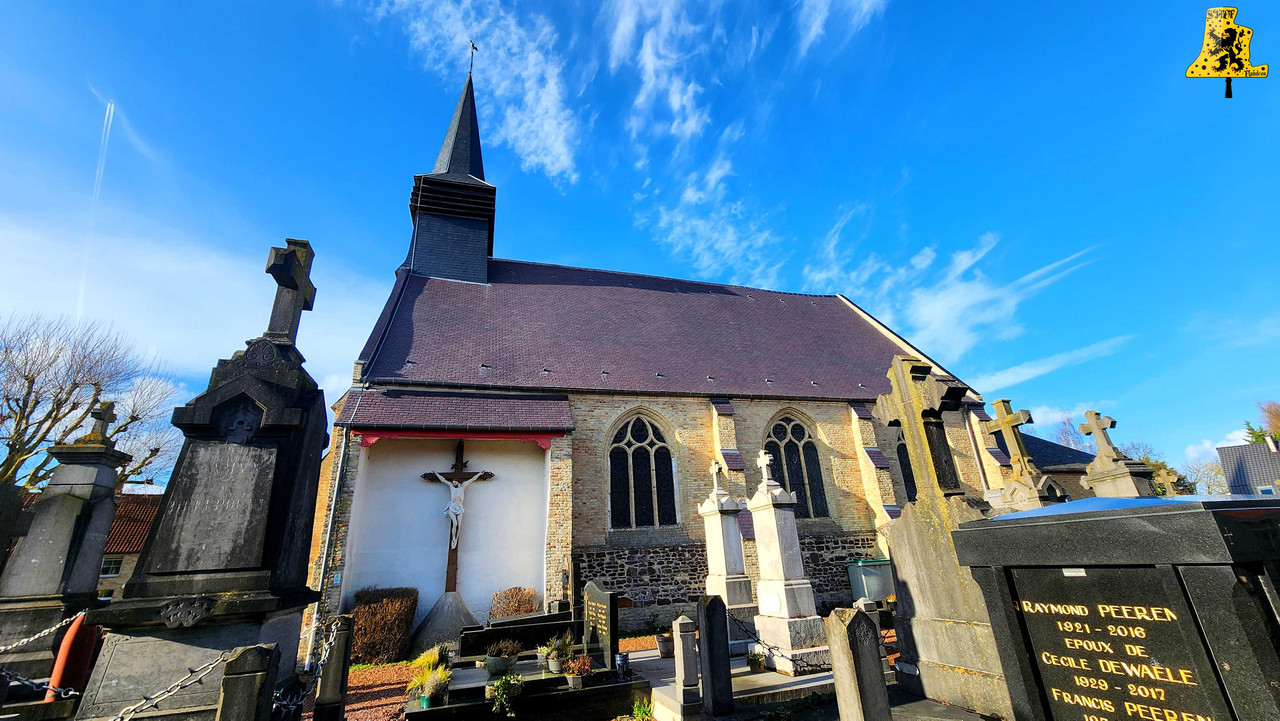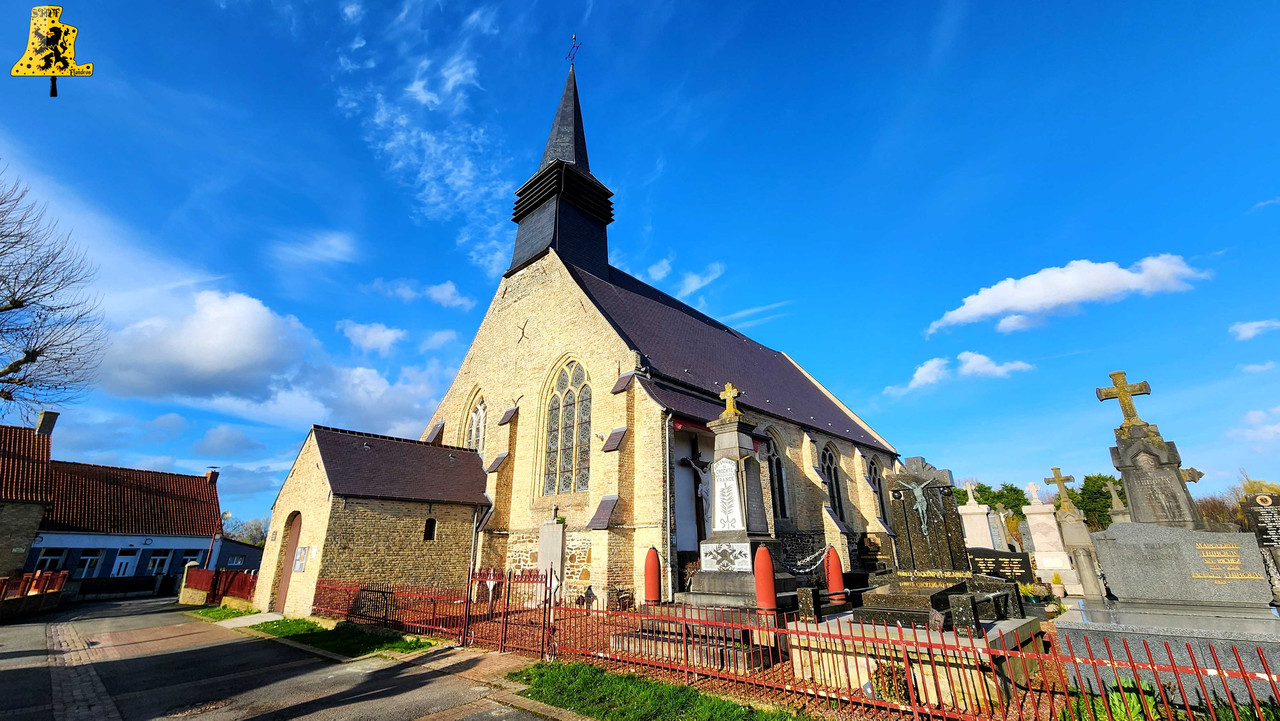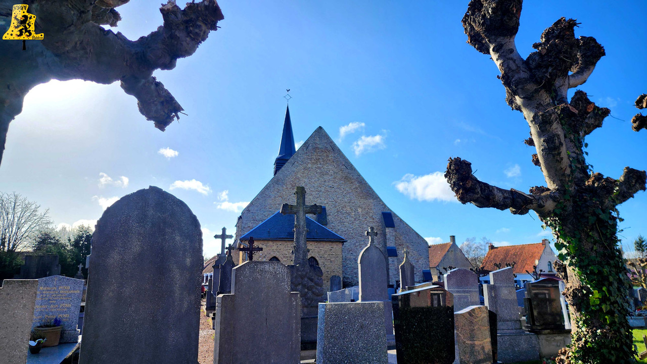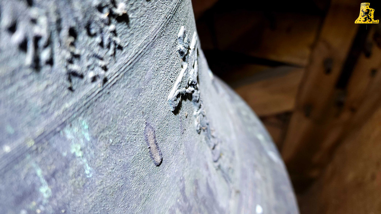 Après avoir été dans la commune voisine de Steene, c’est à Crochte que je vais avoir la chance de vous partager le patrimoine campanaire de l’église, et vous allez voir que les apparences peuvent être trompeuses! Mais avant de parler des cloches, arrêtons nous sur cette charmante petite église. L‘église sous le vocable de Saint-Georges, possèdes de petites dimensions, mais il faut savoir qu’avant guerre, l’église était plus grande. Elle fut touchée par les bombardements, et quelques murs n’ont pu être sauvés. L‘église était aussi pourvue d’une horloge sur son clocher côté porche d’entrée, ce clocher était identique à celui-ci. La commune de Crochte a entrepris de lourds travaux de restauration, à commencer par ses toitures, nefs et clocher. Ensuite, et c’est ce qui a fait la renommée de Crochte, les retables se sont vu offrir une cure de jouvence, mais derrière l’un d’entre eux, se cachait un véritable trésor! Car en effet, un très vieux retable était oublié de tous! Et ce n’est pas n’importe quel retable, puisqu’il s’agit du plus vieux retable flamand découvert à ce jour! Celui-ci, datée de 1 642, était très abimé, il fut donc envoyé en restauration? C‘est un véritable miracle qui eu lieu, puisque la restauration lui a rendu sa beauté d’antan (Voir photo au centre dans la partie « Photo intérieur »). Cette œuvre trône désormais fièrement dans l’église. L‘intérieur est, en plus du retable flamand, un véritable trésor mobilier. Comme à Steene, ici aussi l’église est très richement agencée avec plusieurs mobiliers, et tableaux anciens. Ma surprise ne s’arrête pas là, puisque nous entamons l’ascension jusqu’au clocher. Un accès jusqu’aux cloches qui se mérite, tant celui-ci est assez compliqué. Dans ce tout petit clocher, ma surprise fut grande en constatant qu’il y ait deux cloches, mais en levant ma tête, il y en a une troisième, je n’y croyais pas du tout. Alors il est vrai que 2 des 3 cloches sont malheureusement muettes à la volée, et n’ont probablement pas sonnées depuis des décennies, mais on ne peut pas en vouloir à la commune, tant les investissements pour l’église sont très conséquents alors que Crochte, est une très petite commune. La cloche qui sonne les heures est la plus grosse, elle fut fondue par la fonderie des Drouot, elle est datée en chiffres romain de l’an 1 828. Sur les inscriptions en langue latine, je n’ai malheureusement découvert aucun nom de baptême. Son diamètre est de 82,1 cm, pour un poids de 325 kg environ. Pour la petite, elle provient également de la fonderie des Drouot, mais elle fut fondue 1 an plus tard. Ici aussi, je n’ai pu découvrir de nom. C‘est la seule cloche qui sonne encore à la volée durant les Angélus et les offices quand il y en a. Son diamètre est de 66,8 cm, quant à son poids, il est de 180 kg. Et enfin, la cloche qui, pour moi, est la plus intéressante, est la cloche dite Moyenne. Cette cloche dédiée à Saint-Hubert. Elle fut fondue en 1 784 par Regnaud, un fondeur itinérant Lorrain, dont il a fonda quelques cloches en région Flamande, comme à Killem par exemple. Cette cloche est très intéressante puisqu’elle a survécu à la Révolution Française, et aux grandes guerres. De plus, l’intégralité de ses inscriptions sont en Flamand. Ses démentions sont de 73,8 cm, pour un poids de 230 kg. L‘ensemble des trois cloches chantent en La#3, Si3 et le Ré4 pour la petite. Vous pouvez écouter une simulation de la sonnerie des trois cloches par montage audio, puisque l’état des cloches ne permettent pas une mise en branle manuelle.