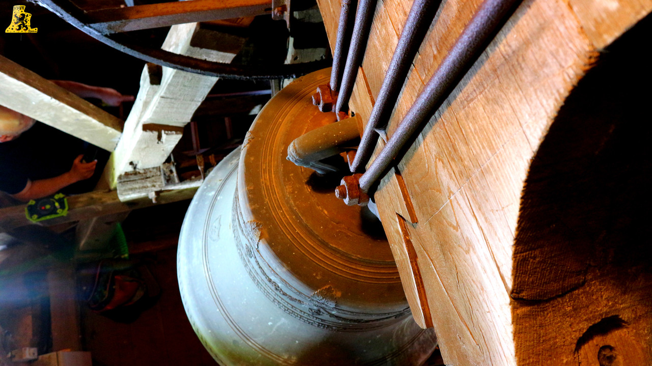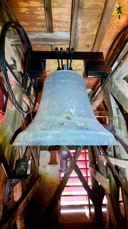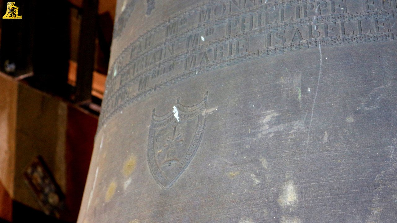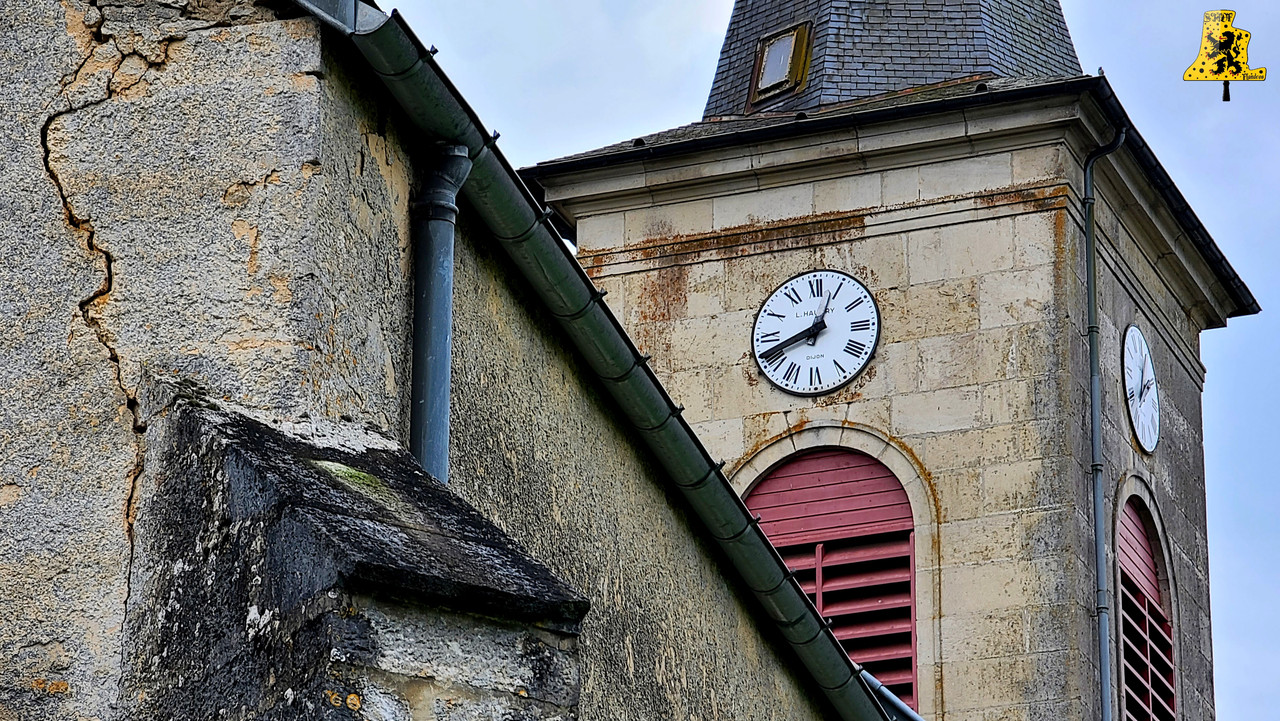 Pour cette troisième visite de ce nouveau week-end en Bourgogne, Yannick nous a emmenés à Echalot, une petite commune de Côte-d’Or, un peu isolée, et comptant un peu moins de 100 âmes. L‘église paroissiale de L’assomption, abrite un mobilier des plus remarquables, je ne suis pas super fort en histoire, mais il y a quelque chose d’assez rare pour être signalé. La présence de part et d’autre de la porte, d’une frise peinte, représentant quelques Saints. La montée se fait assez aisément, et il nous faut moins de 5 min pour parvenir aux cloches. Le clocher en héberge deux, réparties sur un seul niveau. Les cloches ne comportent pas de noms, et semblent toutes deux, offertes à la commune par la famille De Blic. La plus grosse des cloches, fondue en l’an 1 840, cette cloche est le résultat de l’association de deux fondeurs champenois: Cochois-Liebaux, et Petitfour, fondeurs respectivement à Champigneulles et Arbot. D‘un diamètre à peine inférieur à 120 cm, cette belle cloche pèse 920 kg. Nous avons là une cloche en profil assez léger, puisque pour une cloche de cette note, le poids moyen est de 1 100 kg, mais ici, ça n’enlève en rien la qualité sonore de la cloche. Quant à la petite cloche, qui est pour le coup, plus récente que la grande, elle est l’œuvre du fondeur Petitfour. D‘un diamètre de 105 cm, elle affiche sur la balance un respectable poids de 680 kg. L‘ensemble des deux cloches sont particulièrement bien entretenues, malgré un léger souci de démarrage de la petite (Réglé depuis).