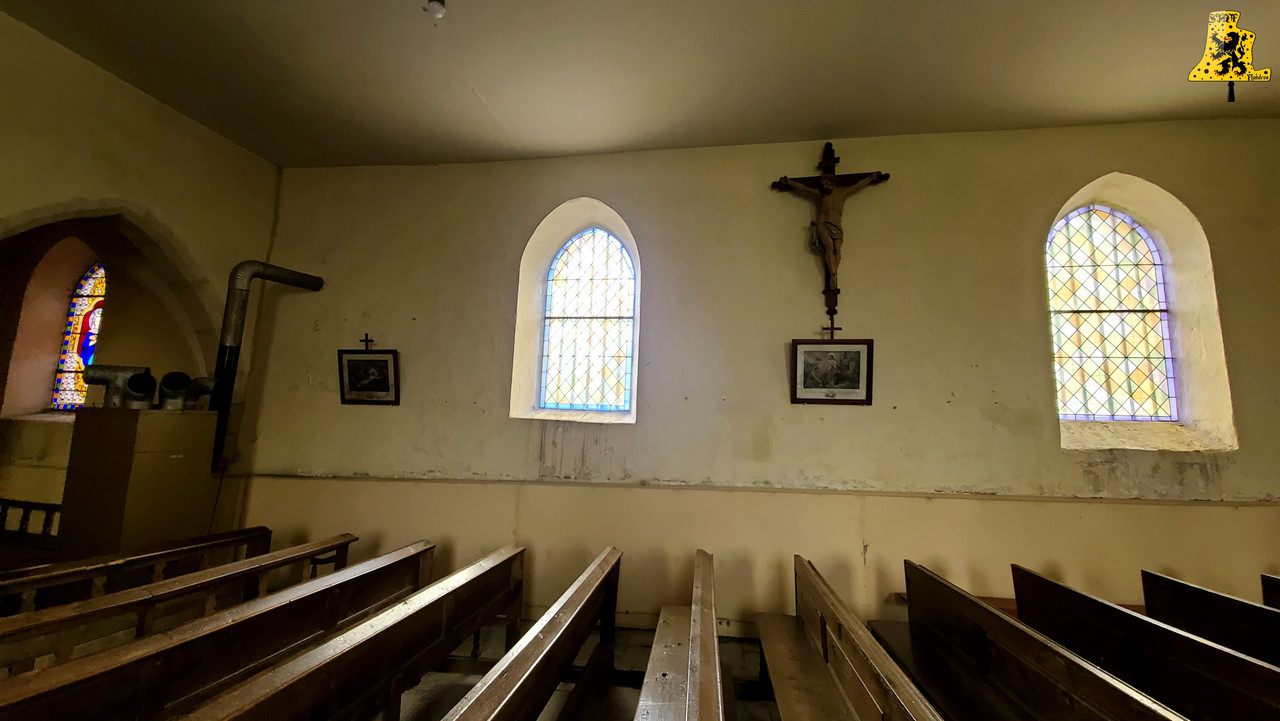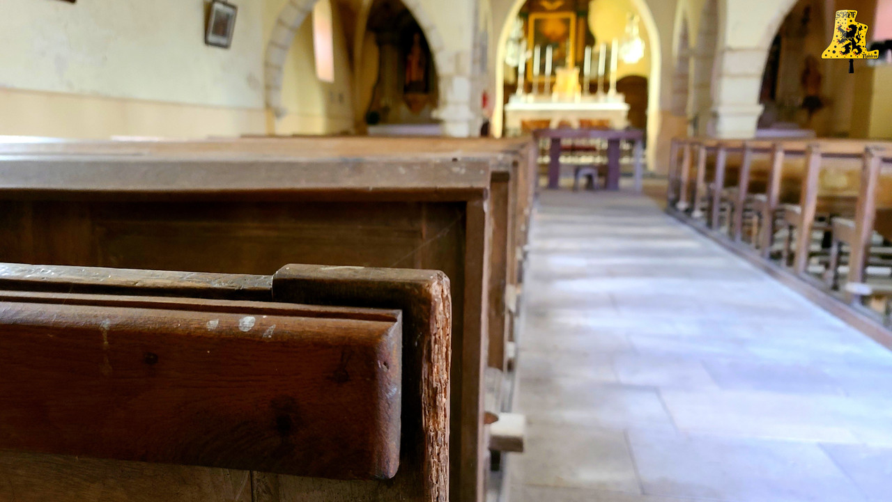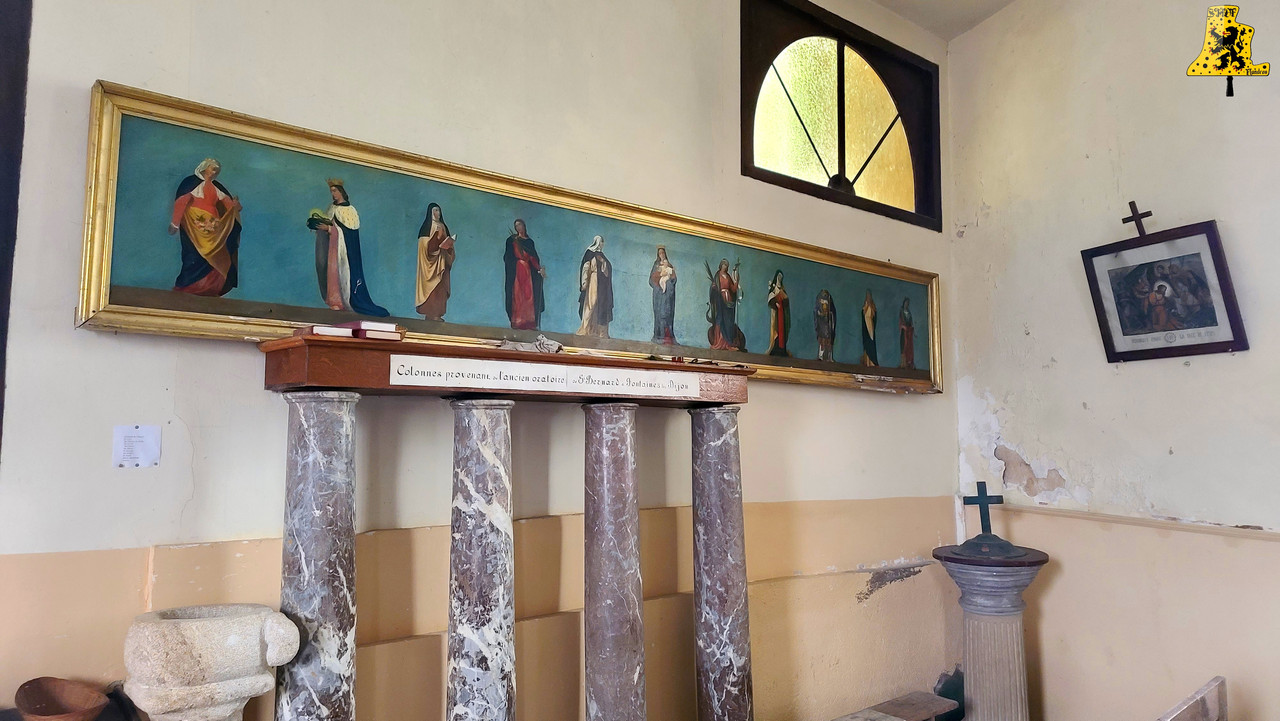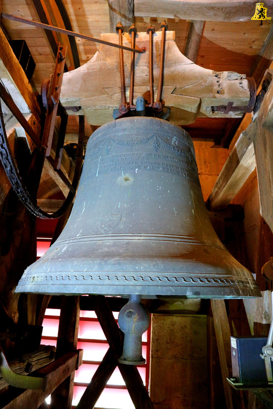 Pour cette troisième visite de ce nouveau week-end en Bourgogne, Yannick nous a emmenés à Echalot, une petite commune de Côte-d’Or, un peu isolée, et comptant un peu moins de 100 âmes. L‘église paroissiale de L’assomption, abrite un mobilier des plus remarquables, je ne suis pas super fort en histoire, mais il y a quelque chose d’assez rare pour être signalé. La présence de part et d’autre de la porte, d’une frise peinte, représentant quelques Saints. La montée se fait assez aisément, et il nous faut moins de 5 min pour parvenir aux cloches. Le clocher en héberge deux, réparties sur un seul niveau. Les cloches ne comportent pas de noms, et semblent toutes deux, offertes à la commune par la famille De Blic. La plus grosse des cloches, fondue en l’an 1 840, cette cloche est le résultat de l’association de deux fondeurs champenois: Cochois-Liebaux, et Petitfour, fondeurs respectivement à Champigneulles et Arbot. D‘un diamètre à peine inférieur à 120 cm, cette belle cloche pèse 920 kg. Nous avons là une cloche en profil assez léger, puisque pour une cloche de cette note, le poids moyen est de 1 100 kg, mais ici, ça n’enlève en rien la qualité sonore de la cloche. Quant à la petite cloche, qui est pour le coup, plus récente que la grande, elle est l’œuvre du fondeur Petitfour. D‘un diamètre de 105 cm, elle affiche sur la balance un respectable poids de 680 kg. L‘ensemble des deux cloches sont particulièrement bien entretenues, malgré un léger souci de démarrage de la petite (Réglé depuis).