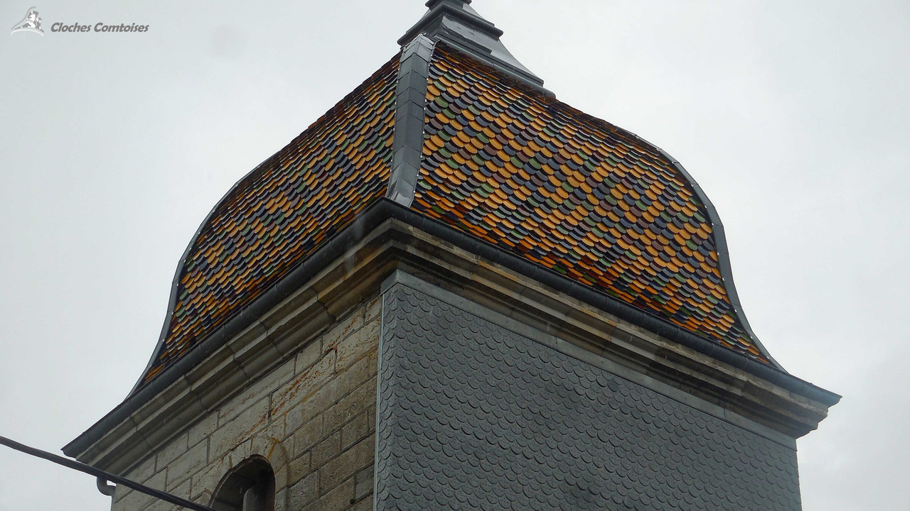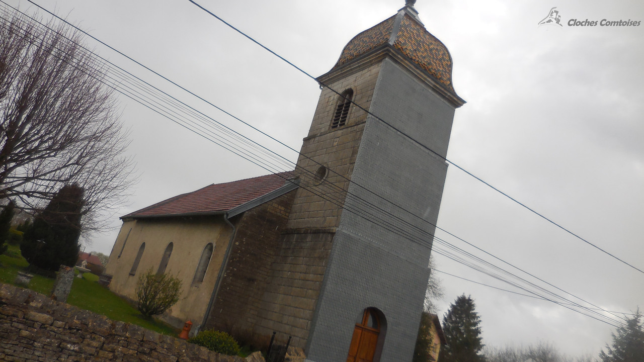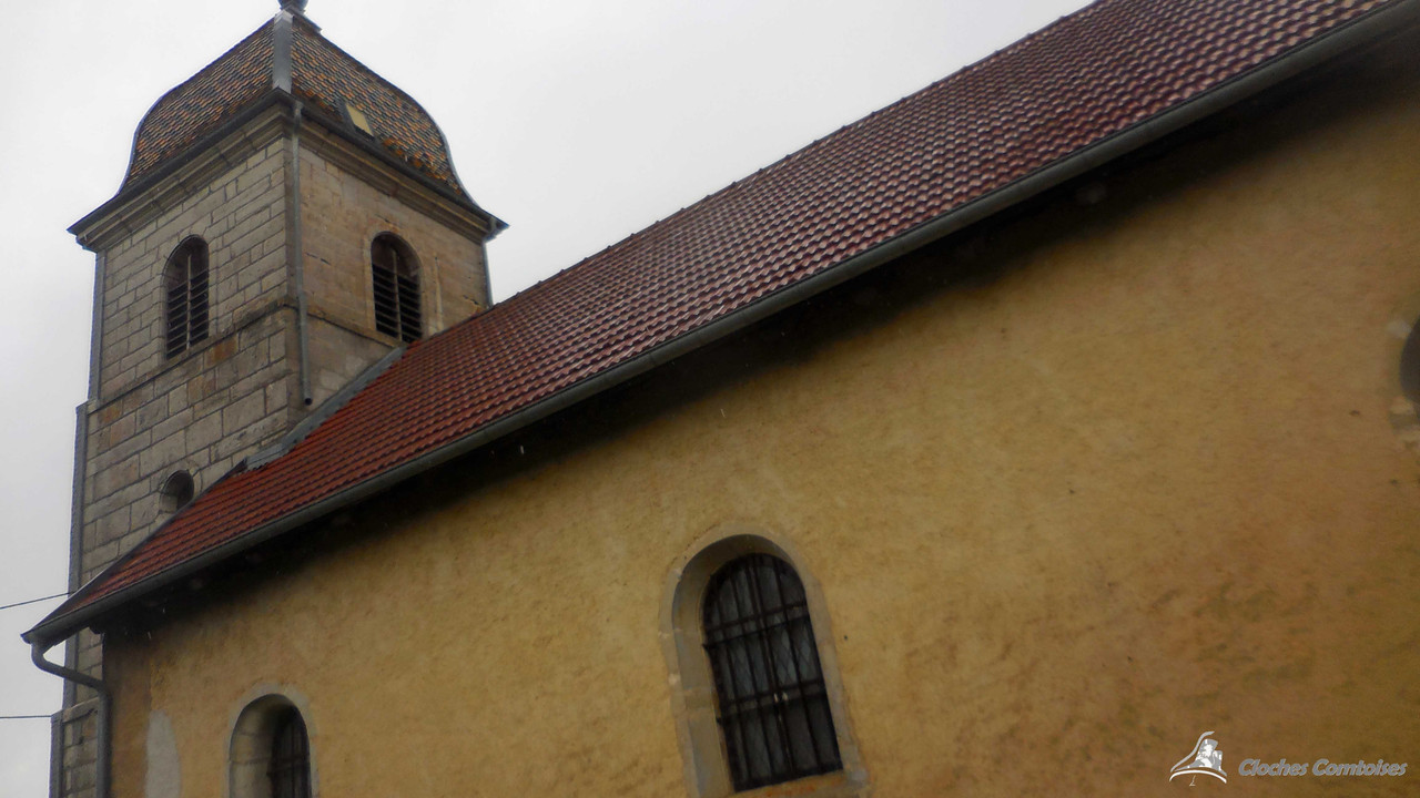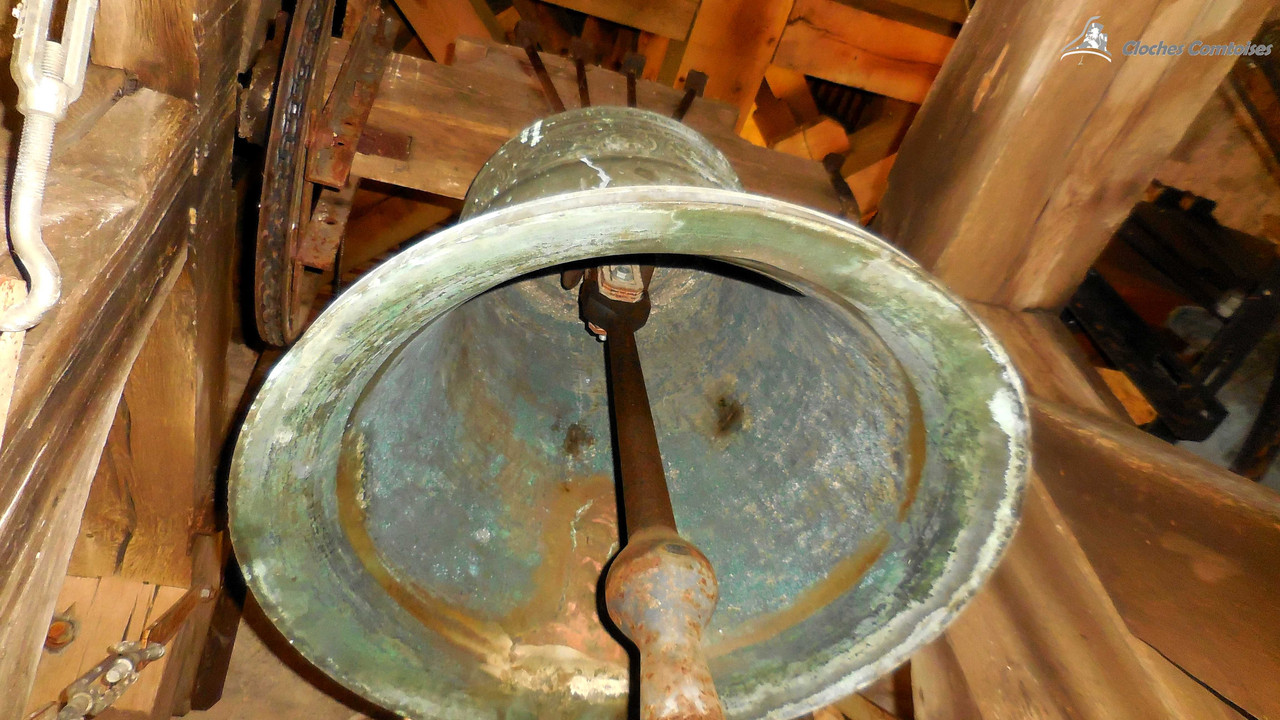 Toujours dans le tout début de mes aventures campanaires en terres comtoises, il fut un temps où je me suis rendu à Epenouse, un village que je connais très bien, puisqu’il fut l’étape indispensable pour une bonne bouffe entre amis au restaurant de la Fromagerie! Epenouse compte moins de 150 habitants, comme dit dans le titre, le bourg vit de l’agriculture. La charmante petite église, située au centre, arbore de belles tuiles vernissées sur son dôme. Ce clocher s’élève à même pas 20 mètres. La nef elle aussi modeste. Une fois la montée achevée, nous pouvons voir deux belles cloches, les deux reposent sur un beffroi en bois, placées côte à côte. La plus grosse, la plus intéressante de l’ensemble, a été fondue par les Bournez Françoise-Joseph Bournez, fondeur à Morteau. C‘est l’une des plus vieilles cloches fondues par la dynastie Bournez, et l’une des trop rares cloches prérévolutionnaires, car en effet, Charlotte-Pierrette de son nom, elle a été fondue en 1 786. Le poids de cette cloche est de 530 kg, pour un diamètre de 96,2 cm. Sa petite sœur nommée Clarisse, a été coulée en 1 912, mais là est le mystère puisqu’à l’époque, je n’ai su déchiffrer l’artiste de cette œuvre, due à une réparation effectuée par la suite sur la cloche qui coupe la signature en deux. Car en effet, la cloche se fêla au cours de sa brève histoire. La cloche pèse 215 kg.