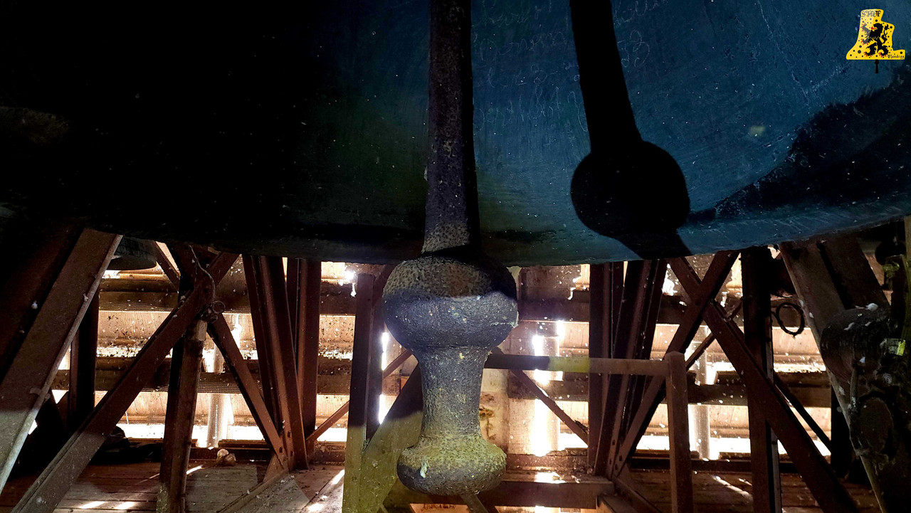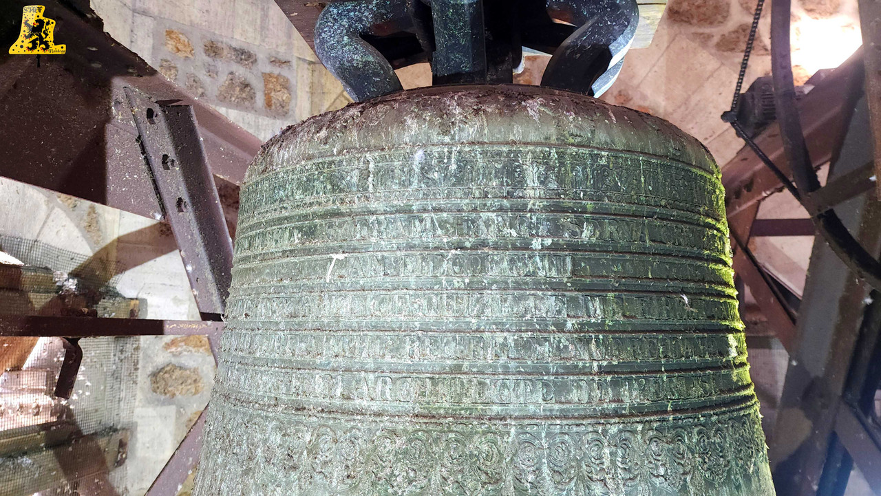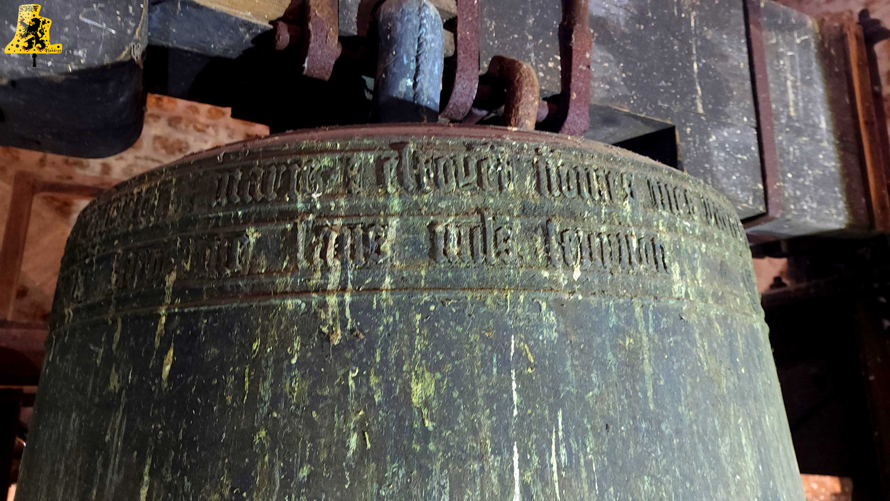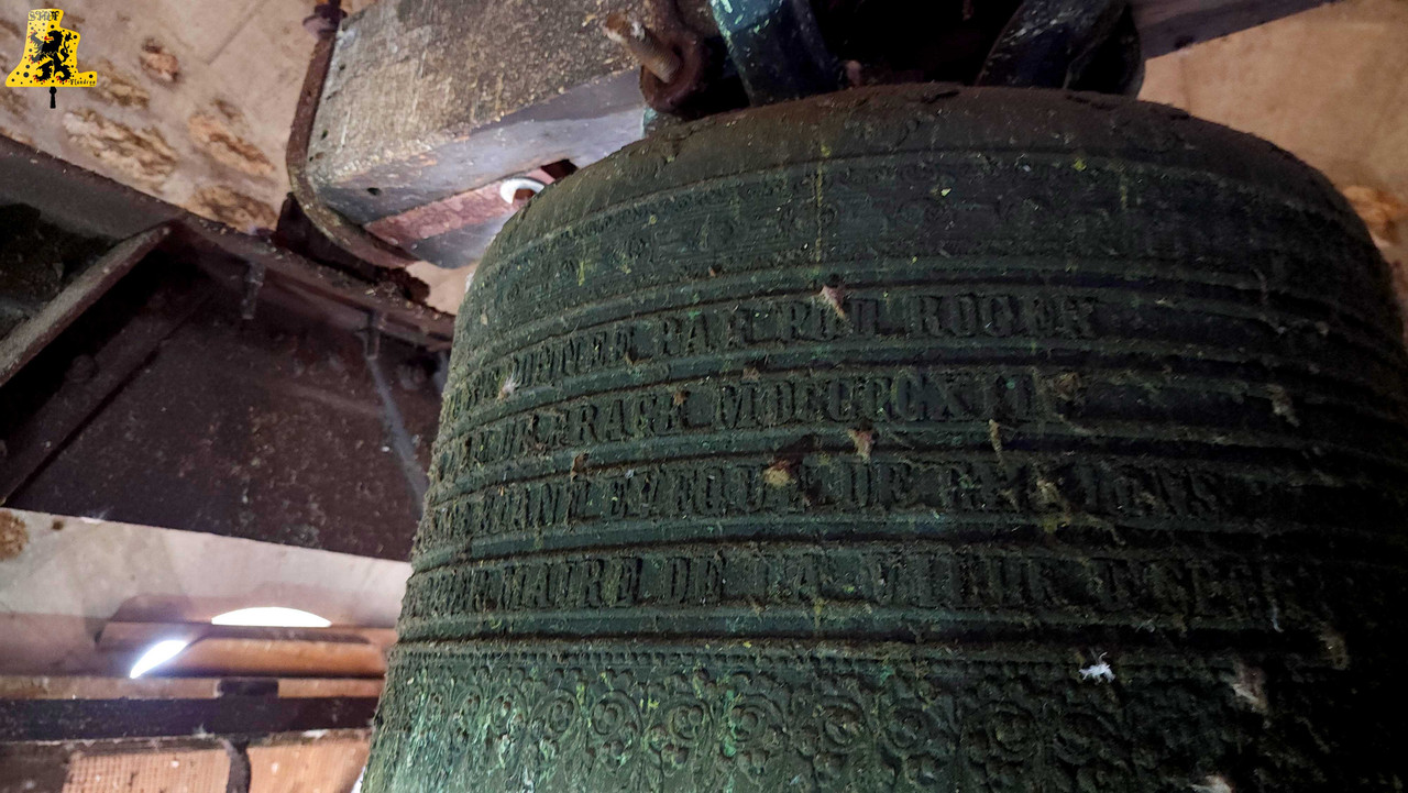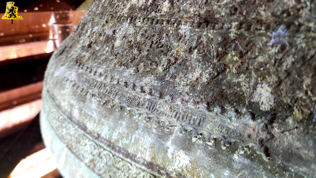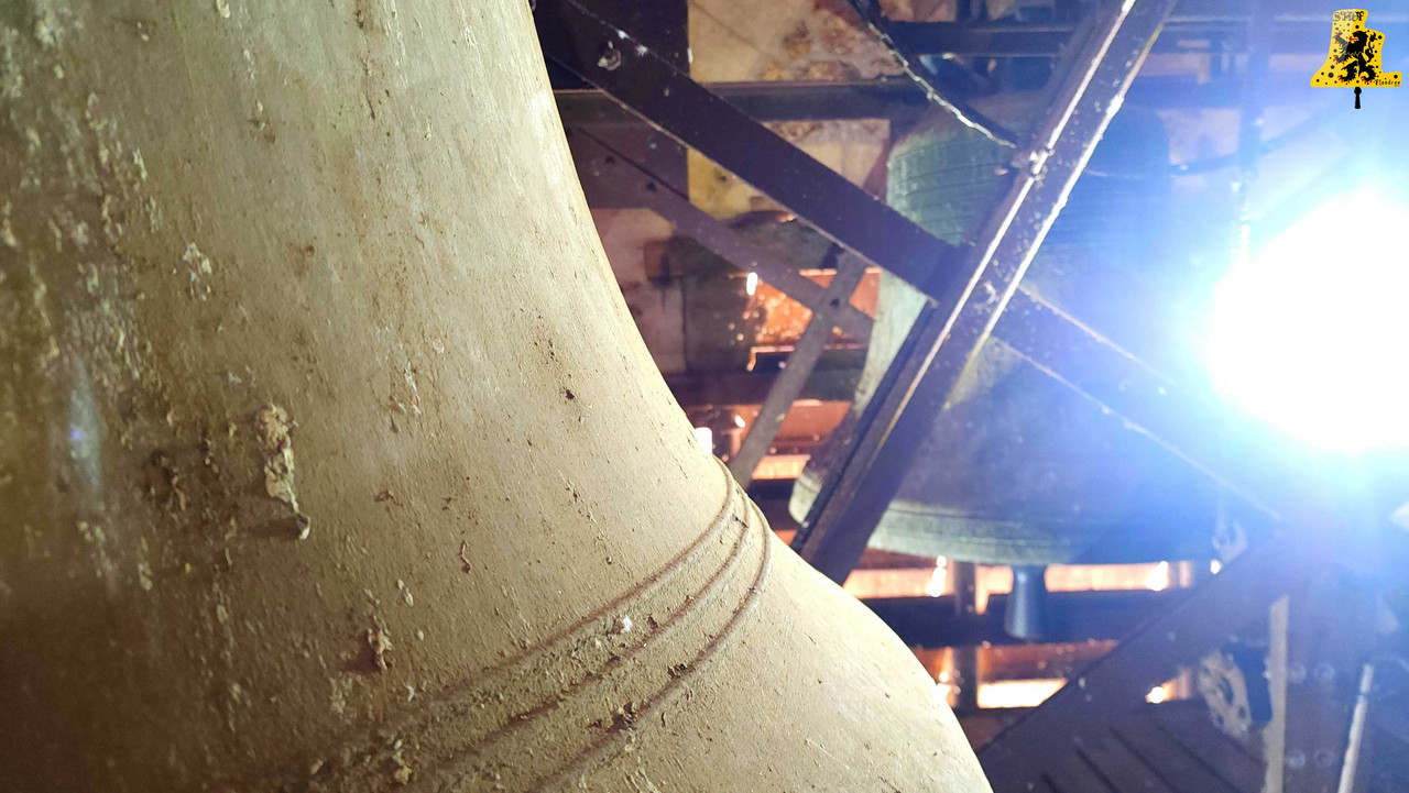 C‘est avec joie et émotion que je me suis rendue à Epernay pour vous y partager l’antre du clocher de Notre-Dame… Pourquoi ai-je dis « émotion »? Tout simplement parcequ’Epernay est la ville qui m’a vu naître, et grandir les 9 premières années de ma vie, alors c’est peu dire que tant de souvenirs sont encore présents en ma mémoire… Mais là n’est pas le sujet, parlons plutôt de cette imposante église, ainsi que de ses cloches. L‘église d’Epernay est un véritable point de repère pour tous les Sparnaciens, en effet, avec son clocher pointant le ciel jusqu’à 83 mètres, celui-ci est visible de part et d’autre de la ville. L‘intérieur de l’édifice n’est pas en reste, avec notamment sa hauteur sous voûtes de la partie nef, léchant les 30 mètres, et même 50 mètres au niveau du transept! C‘est vraiment impressionnant. L‘église possède des vitraux fortement intéressants, ainsi que de beaux tableaux classés. Nous ce qui nous intéresse grandement, ce sont les cloches. Seule rescapée de l’ancienne église, le « Bourdon », mais je vais y revenir un peu plus tard sur cette pièce pour le moins… Très intéressante. Il fut un temps où les cloches pouvaient être sonnées en carillonnant, pour y jouer des mélodies. Ne subsiste de cet instrument que le pédalier qui était relié aux 5 cloches, qui de nos jours, est hors d’usage. Comme je viens de le dire, il y a 5 cloches, toutes posées sur un beffroi métallique.. Les puristes désapprouvent surement, préférant les matériaux nobles comme le bois. Ceci étant que l’accès aux cloches est simplifié. Celle qui est, et de loin, la plus intéressante, est la Grand’Cloche. Cette belle dame de bronze, d’un diamètre de 158,3 cm, et d’un poids calculé à 2 480 kg (Contre les 3 800 kg souvent évoqués), fut fondue en l’an 1 491! C‘est un véritable trésor campanaire! Elle est certes peu décorée, comme la plupart des cloches médiévales, mais elle possède de belles inscriptions en lettres gotique. Les parrains de cette cloche sont Pierre Aubelin et Jehan Feuillet.. Quant à ses marraines, seuls des noms de femmes sont visibles, sans y voir la mention de « Marraine », Katherine, Marguerite et Marie. Katherine de son nom, fut bénite par l’abbé d’Esparnay (Ancien nom de la ville) P.Gaultier. Il faut tout de même savoir que cette cloche est pour le moment vouée à rester muette, et ce, pour deux raisons. D‘une part, elle n’est pas équipée pour sonner à la volée, malgré le fait qu’elle soit sur un système de roulement à bille. Et d’autre part, et c’est le plus préoccupant, c’est l’absence de l’une de ses anses, qui fut remplacée il y a de nombreuses décennies, par du rafistolage avec un anneau qui semble être sous-dimensionnée et fragilisée par la rouille. Il semblerait, via les photos d’archives de lorsque la cloche fut remontée au clocher avec les 4 nouvelles, dans les années 1 910, elle possédait déjà cette anse métallique. De plus, le joug de la cloche semble souffrir du temps, et lorsque nous étions sur site, je trouvait que le joug était cintré sous le poids de la cloche. Et enfin, j’ai voulu essayer de la faire voler de quelques degrés, des craquements se sont fait entendre dans le joug, me disant ainsi de ne prendre aucun risque. La description des 4 autres cloches sera assez rapide puisque celles-ci sont issues de la fonderie Farnier. Cette fonderie était basée à Robécourt, dans les Vosges, de nos jours, le site s’est mué en musée, et organise environ une fois par an, une coulée pour particuliers, communautés religieuses et communales. C‘est en 1 913 donc, que ces nouvelles cloches sont livrées à la paroisse, soit, un an avant la 1ère Guerre Mondiale, qui marqua ainsi 4 ans de non-activité à la fonderie, et surtout, la passation de pouvoir entre Ferdinand et Georges à la tête de la fonderie. La plus grosse des 4 se prénomme Renée-Rosy, elle pèse un honorable poids de 1 429 kg, si je suis aussi précis, c’est grâce aux archives consultables sur le site Clocherobecourt.com, accessible au plus grand nombre. Quant à son diamètre dont j’ai pris les mesures, il est de 130,8 cm. La troisième elle, pèse un poids de 982 kg, elle est suivie de près par sa petite sœur. Le nom qui fut choisi pour cette dame est Nicole. Son diamètre est de 116,5 cm, pour une épaisseur au niveau de la frappe, de 8,3 cm. C‘est via le diamètre et l’épaisseur aux points de frappes non usés, que nous savons calculer le poids d’une cloche avec un peu de marge d’erreur. La cloche numéro 4 dans la sonnerie, se nomme Julie-Augustine. Elle pèse 829 kg, pour un diamètre avoisinant les 110 cm. Et enfin, la 5e et dernière cloche de l’ensemble pèse un poids de 586 kg alors que son diamètre est de 97,9 cm. Ces quatre cloches Farnier sont toute accordées avec le Bourdon historique, donnant à la sonnerie les notes suivantes: Do3, Ré3, Mi3, Fa3 et le Sol3. Je n’ai hélas aucune information sur d’éventuelles anciennes cloches qui accompagnait Katherine dans le passé. Mais une chose est sûr, c’est qu’Epernay, possède l’une des plus vielles cloches de Champagne-Ardenne!