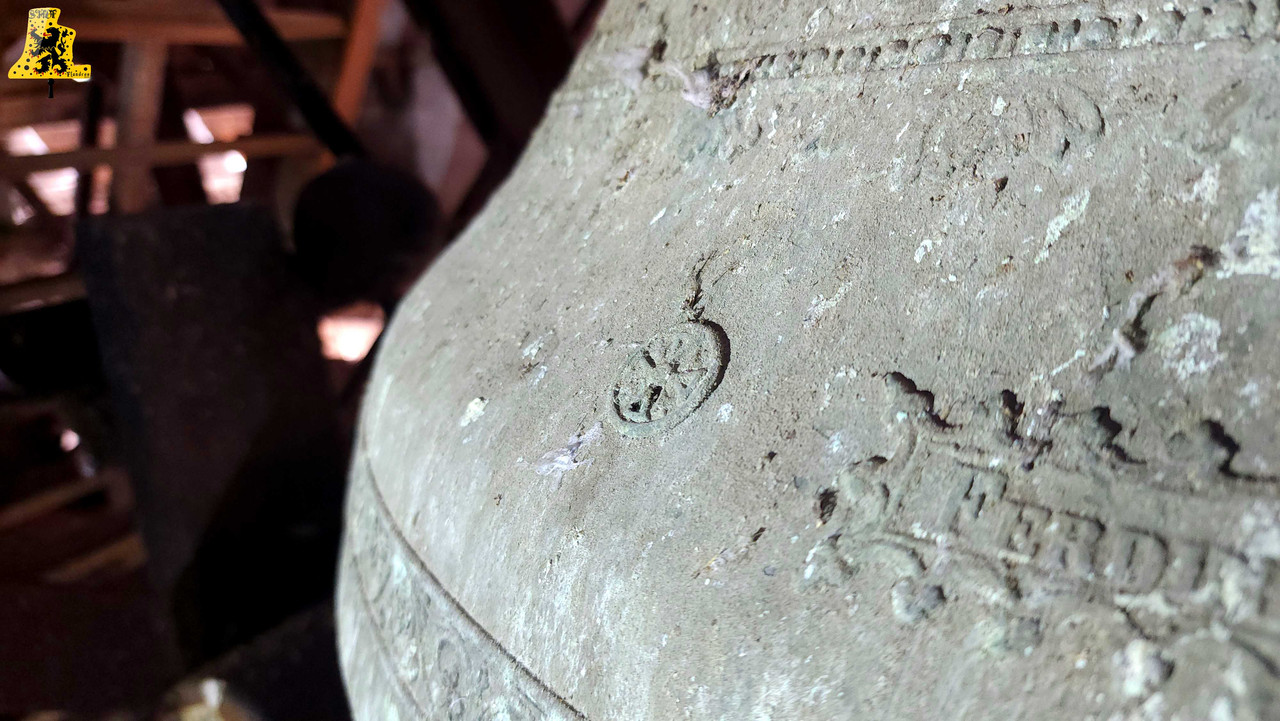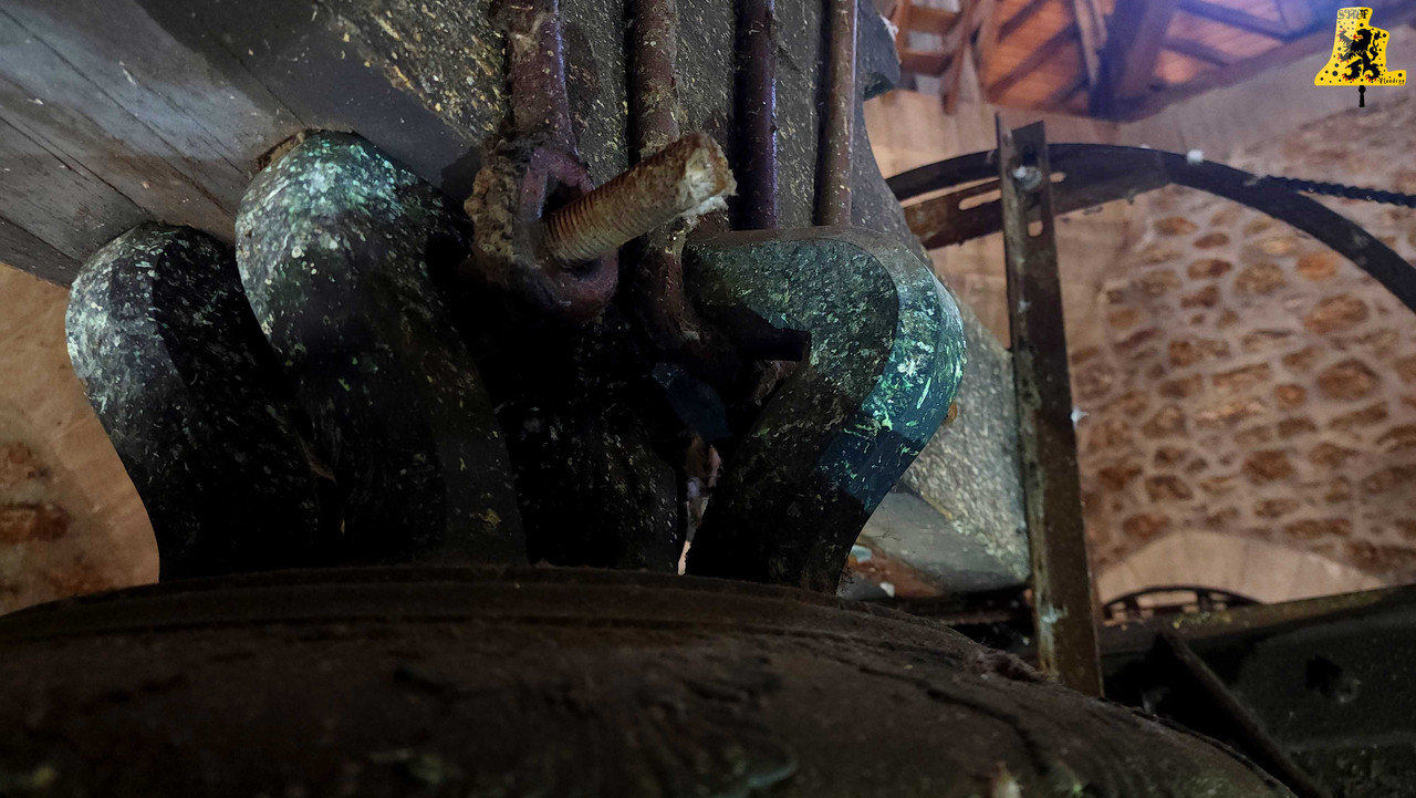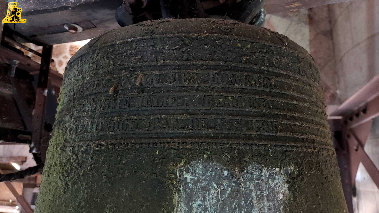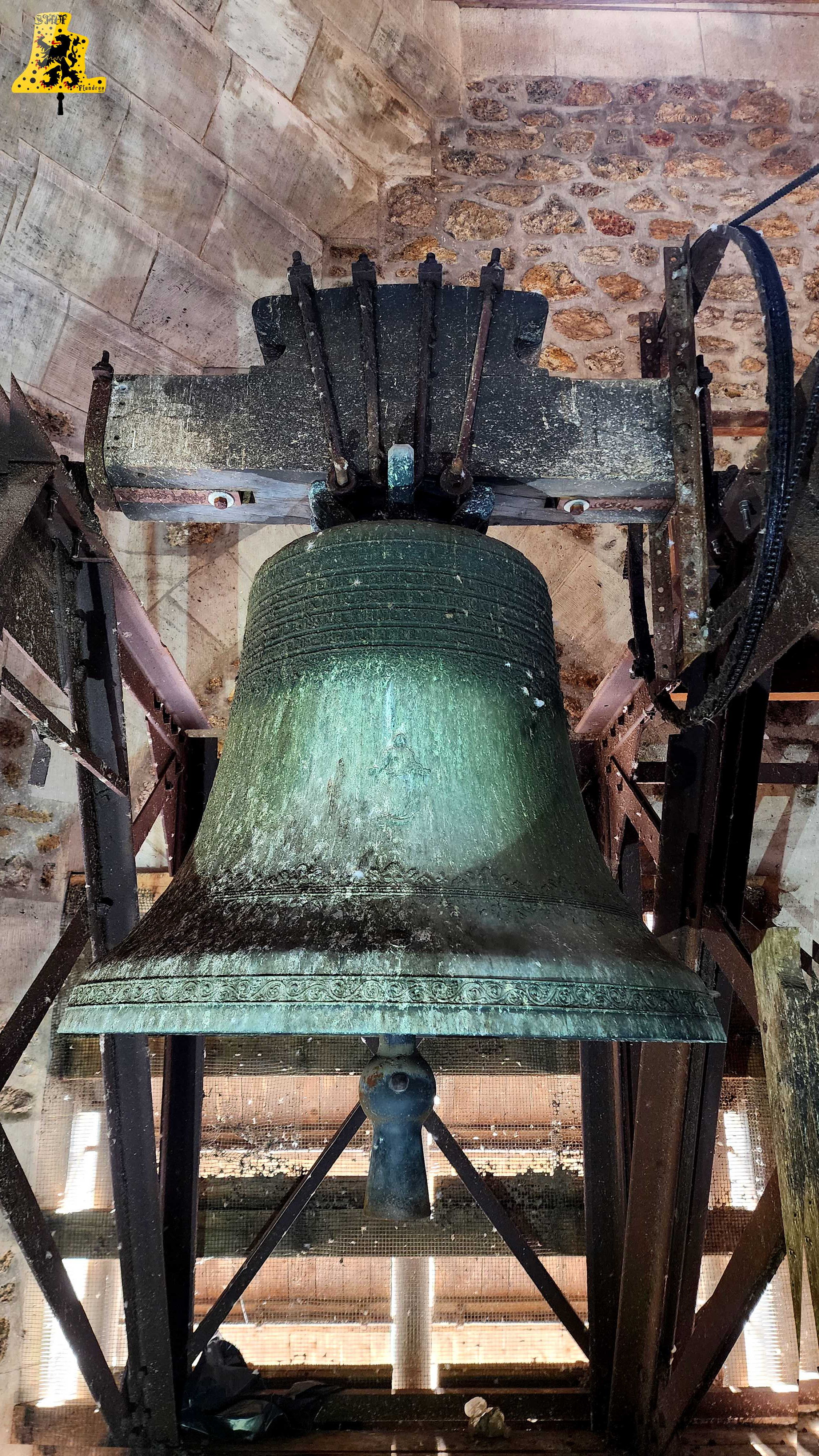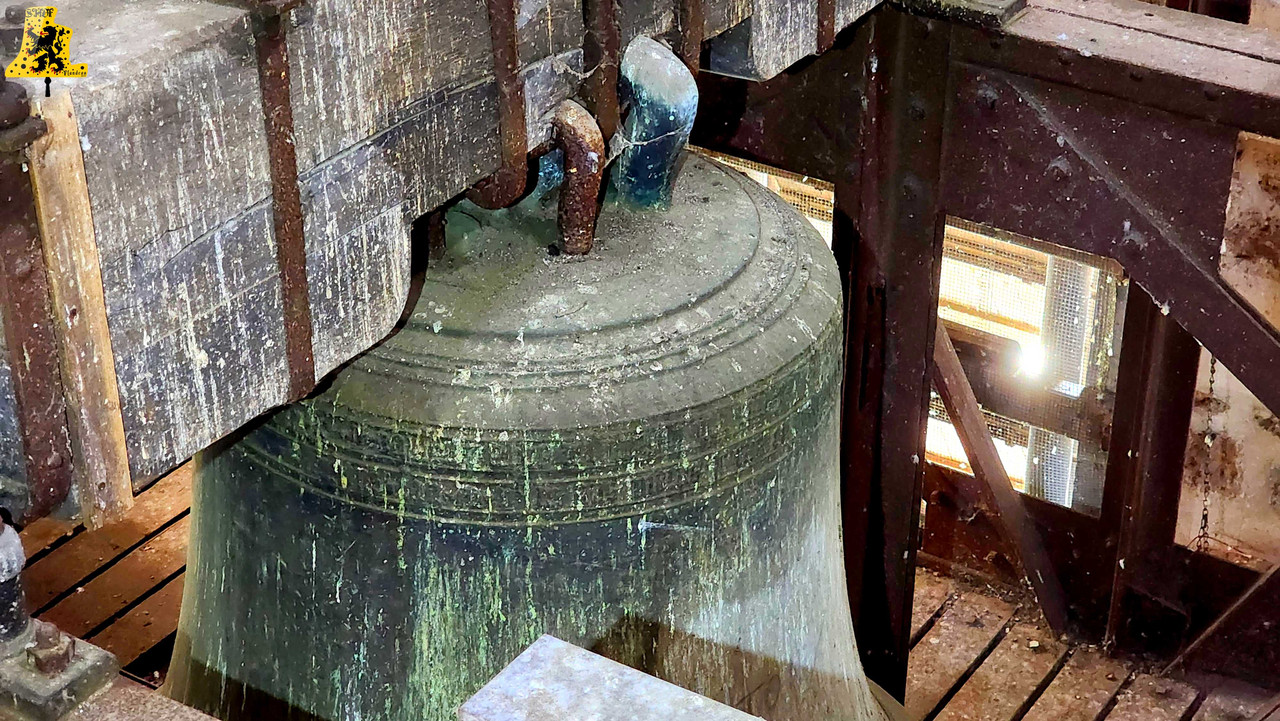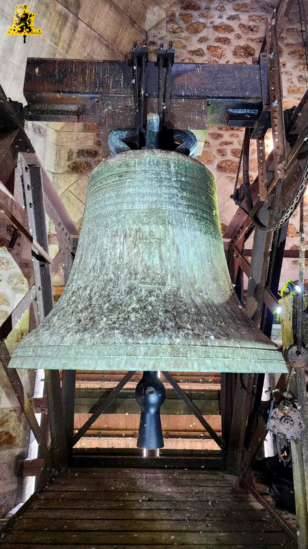 C‘est avec joie et émotion que je me suis rendue à Epernay pour vous y partager l’antre du clocher de Notre-Dame… Pourquoi ai-je dis « émotion »? Tout simplement parcequ’Epernay est la ville qui m’a vu naître, et grandir les 9 premières années de ma vie, alors c’est peu dire que tant de souvenirs sont encore présents en ma mémoire… Mais là n’est pas le sujet, parlons plutôt de cette imposante église, ainsi que de ses cloches. L‘église d’Epernay est un véritable point de repère pour tous les Sparnaciens, en effet, avec son clocher pointant le ciel jusqu’à 83 mètres, celui-ci est visible de part et d’autre de la ville. L‘intérieur de l’édifice n’est pas en reste, avec notamment sa hauteur sous voûtes de la partie nef, léchant les 30 mètres, et même 50 mètres au niveau du transept! C‘est vraiment impressionnant. L‘église possède des vitraux fortement intéressants, ainsi que de beaux tableaux classés. Nous ce qui nous intéresse grandement, ce sont les cloches. Seule rescapée de l’ancienne église, le « Bourdon », mais je vais y revenir un peu plus tard sur cette pièce pour le moins… Très intéressante. Il fut un temps où les cloches pouvaient être sonnées en carillonnant, pour y jouer des mélodies. Ne subsiste de cet instrument que le pédalier qui était relié aux 5 cloches, qui de nos jours, est hors d’usage. Comme je viens de le dire, il y a 5 cloches, toutes posées sur un beffroi métallique.. Les puristes désapprouvent surement, préférant les matériaux nobles comme le bois. Ceci étant que l’accès aux cloches est simplifié. Celle qui est, et de loin, la plus intéressante, est la Grand’Cloche. Cette belle dame de bronze, d’un diamètre de 158,3 cm, et d’un poids calculé à 2 480 kg (Contre les 3 800 kg souvent évoqués), fut fondue en l’an 1 491! C‘est un véritable trésor campanaire! Elle est certes peu décorée, comme la plupart des cloches médiévales, mais elle possède de belles inscriptions en lettres gotique. Les parrains de cette cloche sont Pierre Aubelin et Jehan Feuillet.. Quant à ses marraines, seuls des noms de femmes sont visibles, sans y voir la mention de « Marraine », Katherine, Marguerite et Marie. Katherine de son nom, fut bénite par l’abbé d’Esparnay (Ancien nom de la ville) P.Gaultier. Il faut tout de même savoir que cette cloche est pour le moment vouée à rester muette, et ce, pour deux raisons. D‘une part, elle n’est pas équipée pour sonner à la volée, malgré le fait qu’elle soit sur un système de roulement à bille. Et d’autre part, et c’est le plus préoccupant, c’est l’absence de l’une de ses anses, qui fut remplacée il y a de nombreuses décennies, par du rafistolage avec un anneau qui semble être sous-dimensionnée et fragilisée par la rouille. Il semblerait, via les photos d’archives de lorsque la cloche fut remontée au clocher avec les 4 nouvelles, dans les années 1 910, elle possédait déjà cette anse métallique. De plus, le joug de la cloche semble souffrir du temps, et lorsque nous étions sur site, je trouvait que le joug était cintré sous le poids de la cloche. Et enfin, j’ai voulu essayer de la faire voler de quelques degrés, des craquements se sont fait entendre dans le joug, me disant ainsi de ne prendre aucun risque. La description des 4 autres cloches sera assez rapide puisque celles-ci sont issues de la fonderie Farnier. Cette fonderie était basée à Robécourt, dans les Vosges, de nos jours, le site s’est mué en musée, et organise environ une fois par an, une coulée pour particuliers, communautés religieuses et communales. C‘est en 1 913 donc, que ces nouvelles cloches sont livrées à la paroisse, soit, un an avant la 1ère Guerre Mondiale, qui marqua ainsi 4 ans de non-activité à la fonderie, et surtout, la passation de pouvoir entre Ferdinand et Georges à la tête de la fonderie. La plus grosse des 4 se prénomme Renée-Rosy, elle pèse un honorable poids de 1 429 kg, si je suis aussi précis, c’est grâce aux archives consultables sur le site Clocherobecourt.com, accessible au plus grand nombre. Quant à son diamètre dont j’ai pris les mesures, il est de 130,8 cm. La troisième elle, pèse un poids de 982 kg, elle est suivie de près par sa petite sœur. Le nom qui fut choisi pour cette dame est Nicole. Son diamètre est de 116,5 cm, pour une épaisseur au niveau de la frappe, de 8,3 cm. C‘est via le diamètre et l’épaisseur aux points de frappes non usés, que nous savons calculer le poids d’une cloche avec un peu de marge d’erreur. La cloche numéro 4 dans la sonnerie, se nomme Julie-Augustine. Elle pèse 829 kg, pour un diamètre avoisinant les 110 cm. Et enfin, la 5e et dernière cloche de l’ensemble pèse un poids de 586 kg alors que son diamètre est de 97,9 cm. Ces quatre cloches Farnier sont toute accordées avec le Bourdon historique, donnant à la sonnerie les notes suivantes: Do3, Ré3, Mi3, Fa3 et le Sol3. Je n’ai hélas aucune information sur d’éventuelles anciennes cloches qui accompagnait Katherine dans le passé. Mais une chose est sûr, c’est qu’Epernay, possède l’une des plus vielles cloches de Champagne-Ardenne!