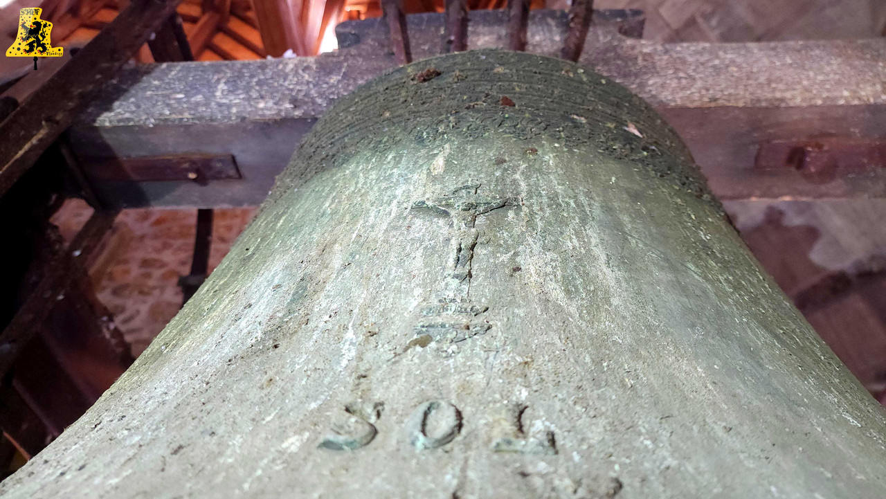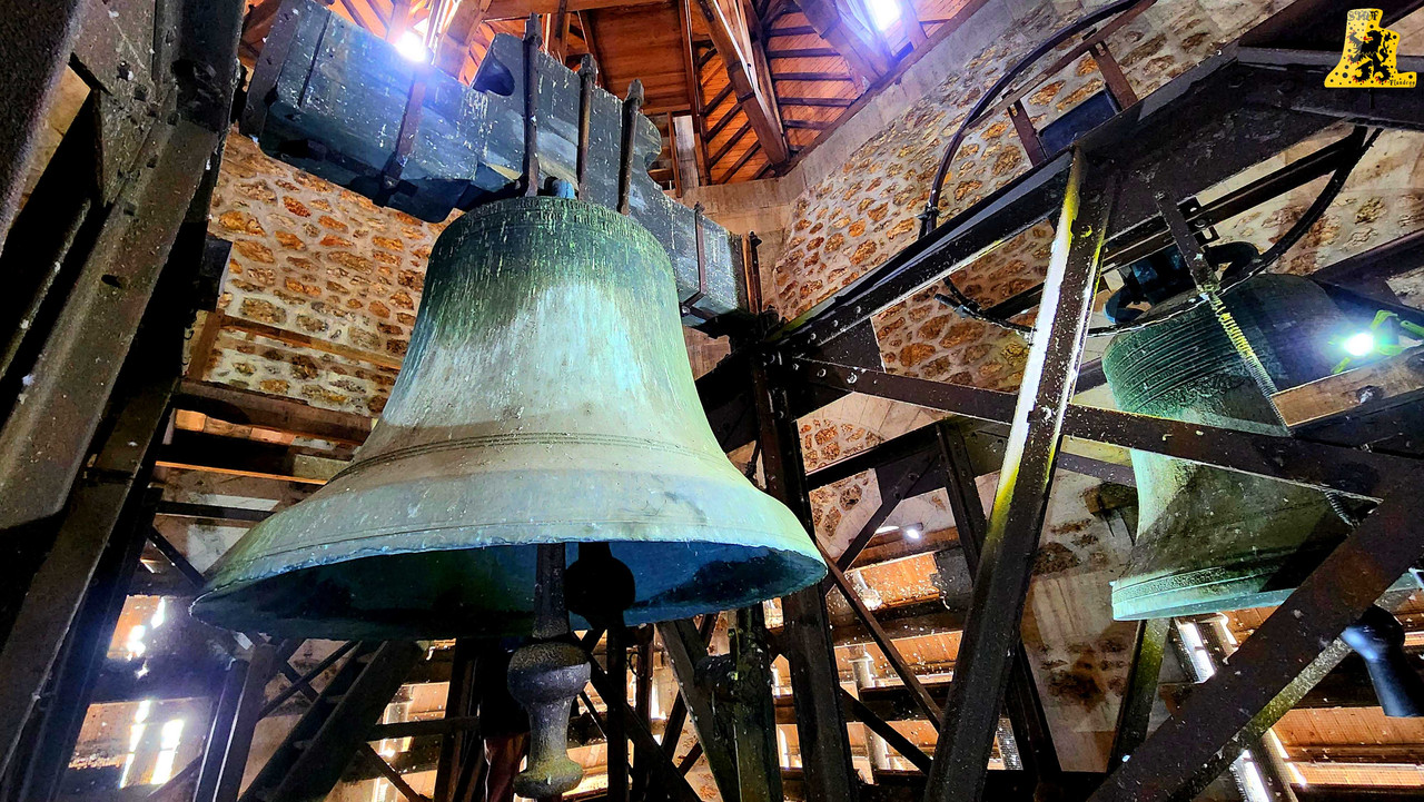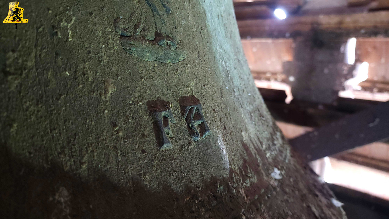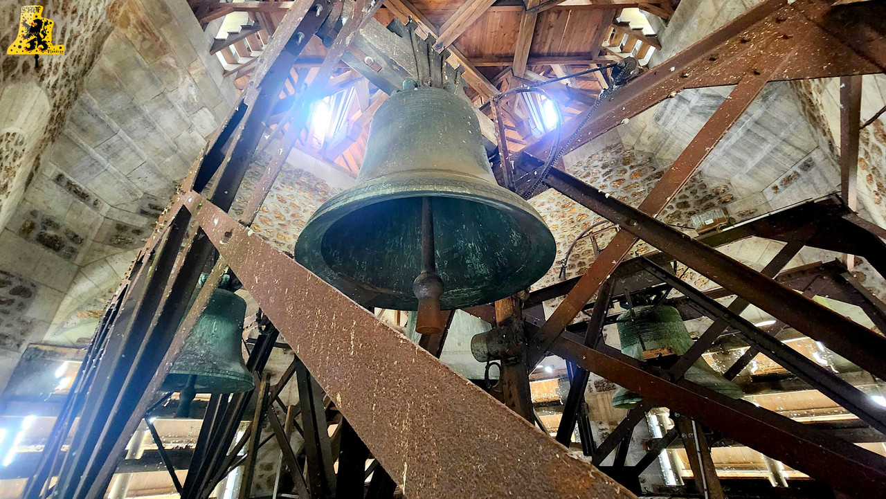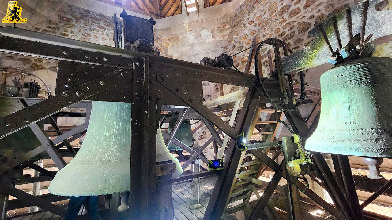 C‘est avec joie et émotion que je me suis rendue à Epernay pour vous y partager l’antre du clocher de Notre-Dame… Pourquoi ai-je dis « émotion »? Tout simplement parcequ’Epernay est la ville qui m’a vu naître, et grandir les 9 premières années de ma vie, alors c’est peu dire que tant de souvenirs sont encore présents en ma mémoire… Mais là n’est pas le sujet, parlons plutôt de cette imposante église, ainsi que de ses cloches. L‘église d’Epernay est un véritable point de repère pour tous les Sparnaciens, en effet, avec son clocher pointant le ciel jusqu’à 83 mètres, celui-ci est visible de part et d’autre de la ville. L‘intérieur de l’édifice n’est pas en reste, avec notamment sa hauteur sous voûtes de la partie nef, léchant les 30 mètres, et même 50 mètres au niveau du transept! C‘est vraiment impressionnant. L‘église possède des vitraux fortement intéressants, ainsi que de beaux tableaux classés. Nous ce qui nous intéresse grandement, ce sont les cloches. Seule rescapée de l’ancienne église, le « Bourdon », mais je vais y revenir un peu plus tard sur cette pièce pour le moins… Très intéressante. Il fut un temps où les cloches pouvaient être sonnées en carillonnant, pour y jouer des mélodies. Ne subsiste de cet instrument que le pédalier qui était relié aux 5 cloches, qui de nos jours, est hors d’usage. Comme je viens de le dire, il y a 5 cloches, toutes posées sur un beffroi métallique.. Les puristes désapprouvent surement, préférant les matériaux nobles comme le bois. Ceci étant que l’accès aux cloches est simplifié. Celle qui est, et de loin, la plus intéressante, est la Grand’Cloche. Cette belle dame de bronze, d’un diamètre de 158,3 cm, et d’un poids calculé à 2 480 kg (Contre les 3 800 kg souvent évoqués), fut fondue en l’an 1 491! C‘est un véritable trésor campanaire! Elle est certes peu décorée, comme la plupart des cloches médiévales, mais elle possède de belles inscriptions en lettres gotique. Les parrains de cette cloche sont Pierre Aubelin et Jehan Feuillet.. Quant à ses marraines, seuls des noms de femmes sont visibles, sans y voir la mention de « Marraine », Katherine, Marguerite et Marie. Katherine de son nom, fut bénite par l’abbé d’Esparnay (Ancien nom de la ville) P.Gaultier. Il faut tout de même savoir que cette cloche est pour le moment vouée à rester muette, et ce, pour deux raisons. D‘une part, elle n’est pas équipée pour sonner à la volée, malgré le fait qu’elle soit sur un système de roulement à bille. Et d’autre part, et c’est le plus préoccupant, c’est l’absence de l’une de ses anses, qui fut remplacée il y a de nombreuses décennies, par du rafistolage avec un anneau qui semble être sous-dimensionnée et fragilisée par la rouille. Il semblerait, via les photos d’archives de lorsque la cloche fut remontée au clocher avec les 4 nouvelles, dans les années 1 910, elle possédait déjà cette anse métallique. De plus, le joug de la cloche semble souffrir du temps, et lorsque nous étions sur site, je trouvait que le joug était cintré sous le poids de la cloche. Et enfin, j’ai voulu essayer de la faire voler de quelques degrés, des craquements se sont fait entendre dans le joug, me disant ainsi de ne prendre aucun risque. La description des 4 autres cloches sera assez rapide puisque celles-ci sont issues de la fonderie Farnier. Cette fonderie était basée à Robécourt, dans les Vosges, de nos jours, le site s’est mué en musée, et organise environ une fois par an, une coulée pour particuliers, communautés religieuses et communales. C‘est en 1 913 donc, que ces nouvelles cloches sont livrées à la paroisse, soit, un an avant la 1ère Guerre Mondiale, qui marqua ainsi 4 ans de non-activité à la fonderie, et surtout, la passation de pouvoir entre Ferdinand et Georges à la tête de la fonderie. La plus grosse des 4 se prénomme Renée-Rosy, elle pèse un honorable poids de 1 429 kg, si je suis aussi précis, c’est grâce aux archives consultables sur le site Clocherobecourt.com, accessible au plus grand nombre. Quant à son diamètre dont j’ai pris les mesures, il est de 130,8 cm. La troisième elle, pèse un poids de 982 kg, elle est suivie de près par sa petite sœur. Le nom qui fut choisi pour cette dame est Nicole. Son diamètre est de 116,5 cm, pour une épaisseur au niveau de la frappe, de 8,3 cm. C‘est via le diamètre et l’épaisseur aux points de frappes non usés, que nous savons calculer le poids d’une cloche avec un peu de marge d’erreur. La cloche numéro 4 dans la sonnerie, se nomme Julie-Augustine. Elle pèse 829 kg, pour un diamètre avoisinant les 110 cm. Et enfin, la 5e et dernière cloche de l’ensemble pèse un poids de 586 kg alors que son diamètre est de 97,9 cm. Ces quatre cloches Farnier sont toute accordées avec le Bourdon historique, donnant à la sonnerie les notes suivantes: Do3, Ré3, Mi3, Fa3 et le Sol3. Je n’ai hélas aucune information sur d’éventuelles anciennes cloches qui accompagnait Katherine dans le passé. Mais une chose est sûr, c’est qu’Epernay, possède l’une des plus vielles cloches de Champagne-Ardenne!