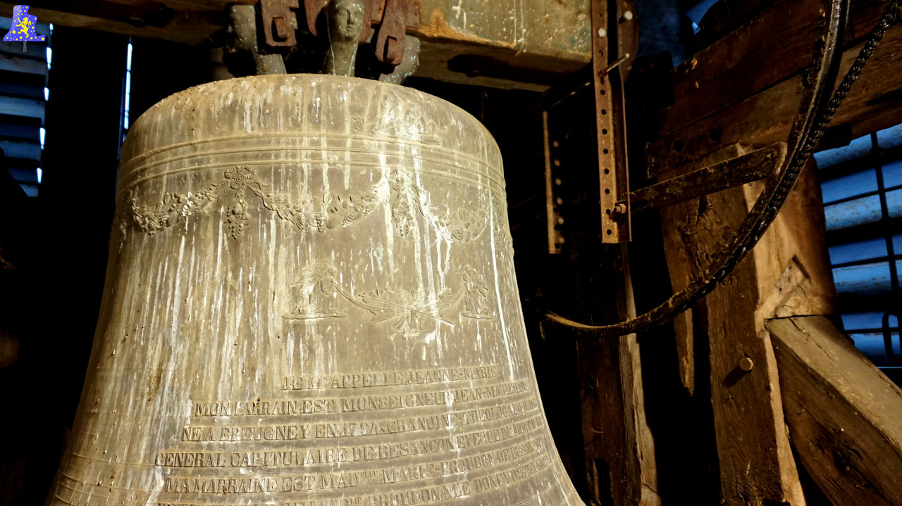 La commune d’Epeugney est située dans le département du Doubs, entre Besançon et Ornans. Village peuplé de 600 âmes, ce dernier a vu son nombre d’habitants augmenter de façon régulière ces dernières années, notamment grâce à sa situation géographique. Le village a su se développer tout en gardant ses grandes bâtisses du centre village. L‘église actuelle a été bâtie en 1 721, sous le vocable de Saint-Etienne. Elle est située en plein cœur du vieux village. Son clocher, impressionnant, s’élève à près de 40 mètres, avec à son sommet, un magnifique point de vue sur tout le village. Outre son clocher relativement imposant, la nef elle, est assez petite, mais richement décorée. Nous avons la présence d’un beau maître-autel accompagnée de ses autels latéraux, qui sont dans le même style. Les cloches sont au nombre de deux, comme dans la plupart des villages franc-comtois, ici, nous avons l’une des rares cloches prérévolutionnaires, et sans surprise, il s’agit de la petite. Elle est l’œuvre du fondeur Comtois nommée Bourguignon. Ce fondeur était établi jadis, à Besançon. Cette belle petite cloche a reçu, il y a une dizaine d’années, un nouveau battant, et dernièrement, un moteur neuf. J’allais oublier de vous dire sa date de fonte, Françoise pris vie en 1 775! Quant à sa grande sœur, elle nous vient de Morteau, en effet, c’est Emile Bournez qui la livra en 1 864. Répondant au nom de Jeanne-Marie. Cette cloche est beaucoup plus lourde que sa petite sœur, puisqu’elle pèse le double de son poids, 1 215 kg, contre 600 pour la petite.
