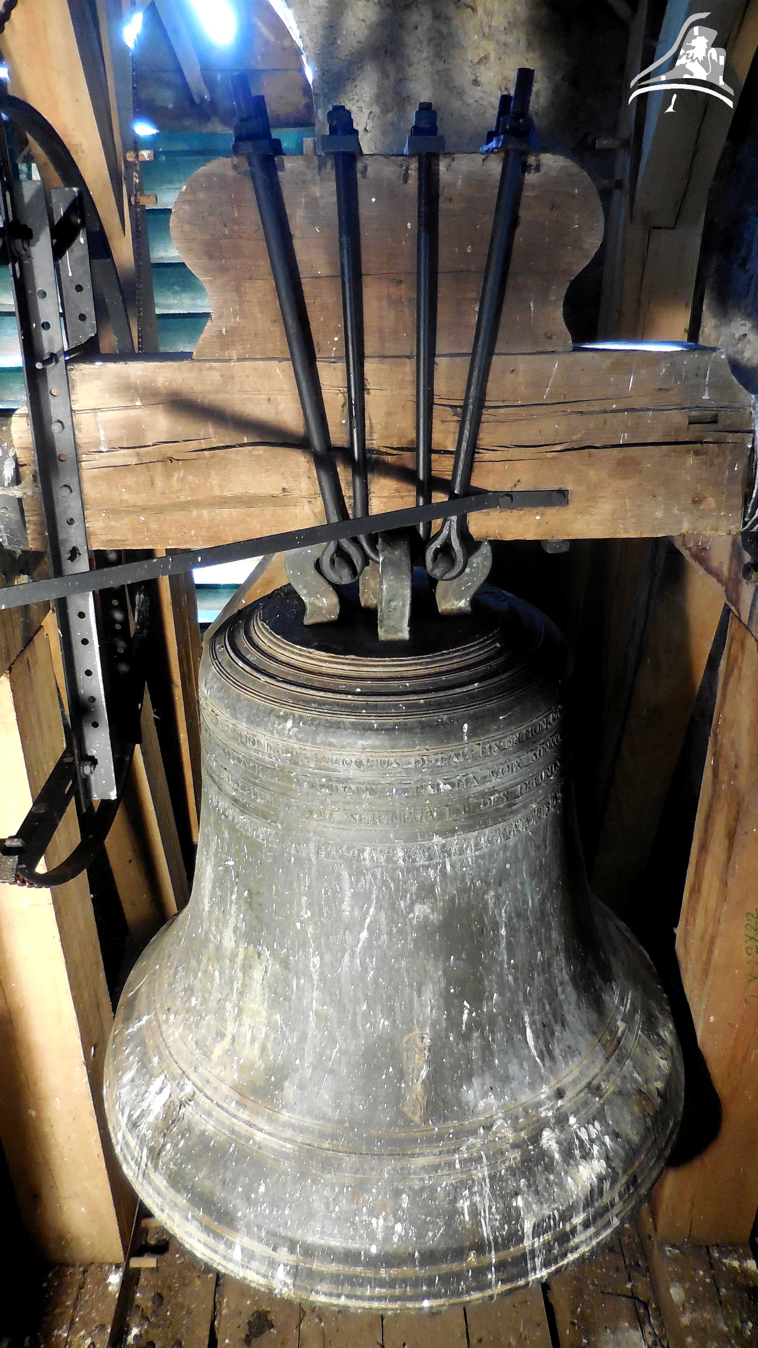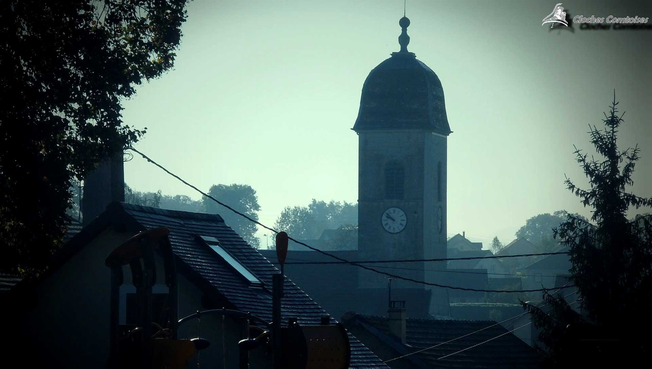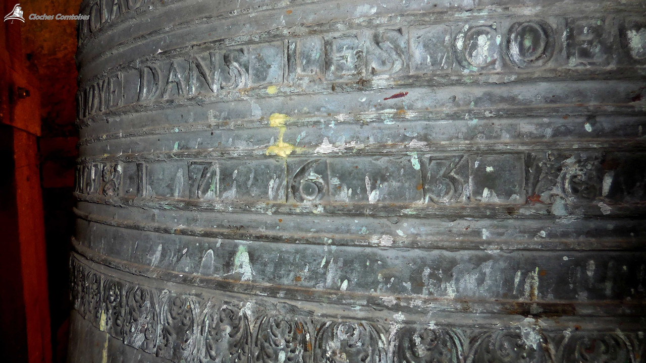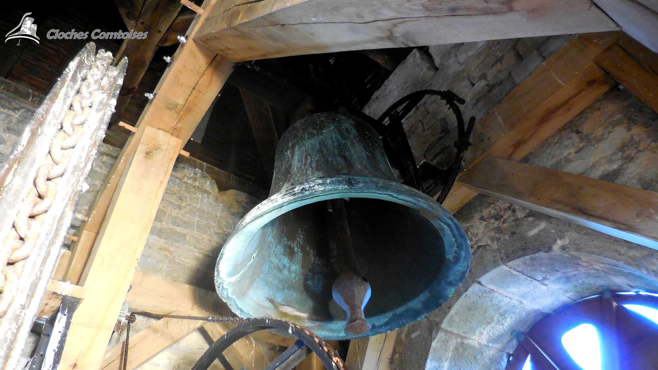 Autre reportage réalisé dans les premiers mois de cette belle aventure qu’était les ClochesComtoises, c’était à Etalans, commune de 1 600 âmes, que j’avais eu la chance de me rendre, et j’étais alors loin de m’imaginer ce que j’allais trouver au sein du clocher. L‘église est plutôt modeste d’extérieur, tout comme son intérieur, mais il ne faut pas oublier qu’Etalans était une petite commune de 600 habitants en 1 960. L‘église fut donc bâtie aux proportions de la population, ce qui n’est clairement pas le cas pour les cloches qu’elle héberge. Pour accéder au clocher, il nous faut passer par le côté extérieur de l’église, il nous faut pas monter très haut pour apercevoir les cloches, qui reposent toutes sur un impressionnant beffroi en bois. A ma grande surprise, il y en a 3, et vous allez voir qu’il y a matière à dire. La plus intéressante de tous, est sans aucun doute la cloche dite « Moyenne ». Elle est la plus intéressante de par son âge, car en effet, elle est l’une des plus vieilles cloches du Plateau de Valdahon, celle-ci est datée de l’an 1 763, en revanche, je n’avais alors trouvé aucun fondeur le long de ses inscriptions. D‘un poids de 1 400 kg tout de même, Claude-Joseph-Etienette de ses noms nous mesure 126 cm de diamètre. La plus petite des cloches fut elle, fondue en 1 827, par le fondeur lorrain Gillot. Elle porte le nom de Victor-Virginie, et pèse 650 kg environ. Elle se situe juste au-dessus de sa grande sœur précédemment citée. Athanasse-Joséphine, du poids de ses 2 310 kg, est clairement la pièce maîtresse de la sonnerie. Mesurant 154 cm de diamètre, elle vient se classer 3e des cloches les plus grosses du canton de Valdahon. C‘est vraiment impressionnant de voir une telle cloche dans un si petit clocher, le beffroi peine à la supporter, mais il tient bon! En revanche, et ceci est lié à la taille démesuré de la cloche vis-à-vis de son beffroi, cette cloche de l’an 1 847 possède un battant très réduit, pour ne pas que ce dernier tape dans la structure en bois. C‘est une cloche au son lugubre, et le fait qu’il y ait pas mal de « ratés » dans la sonnerie, n’arrange pas les choses, mais pour ma part, ce n’est pas déplaisant, bien au contraire! J‘allais oublier, elle fut fondue par les très célèbres dans la région, fondeurs Bournez, fondeur à Morteau