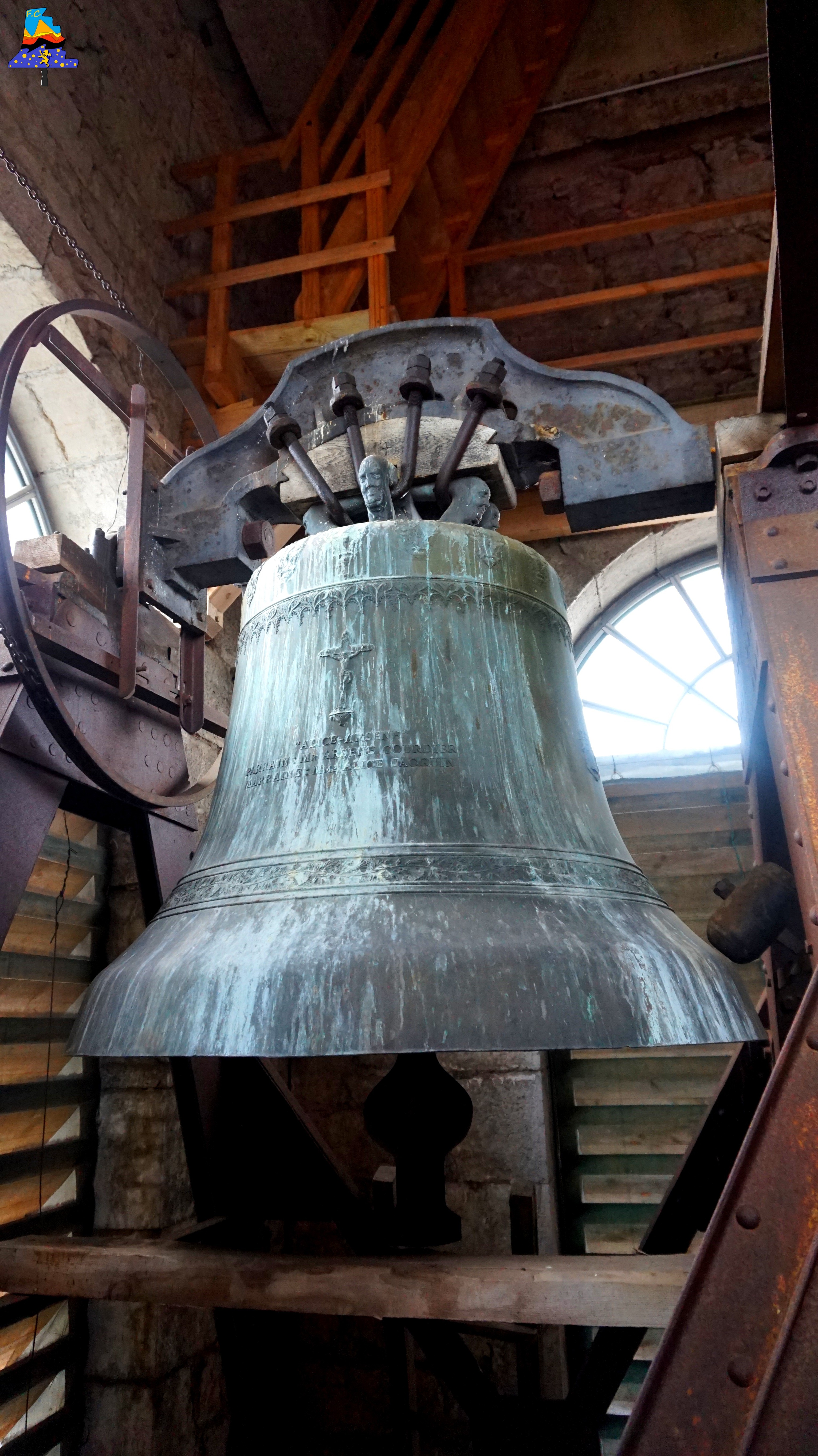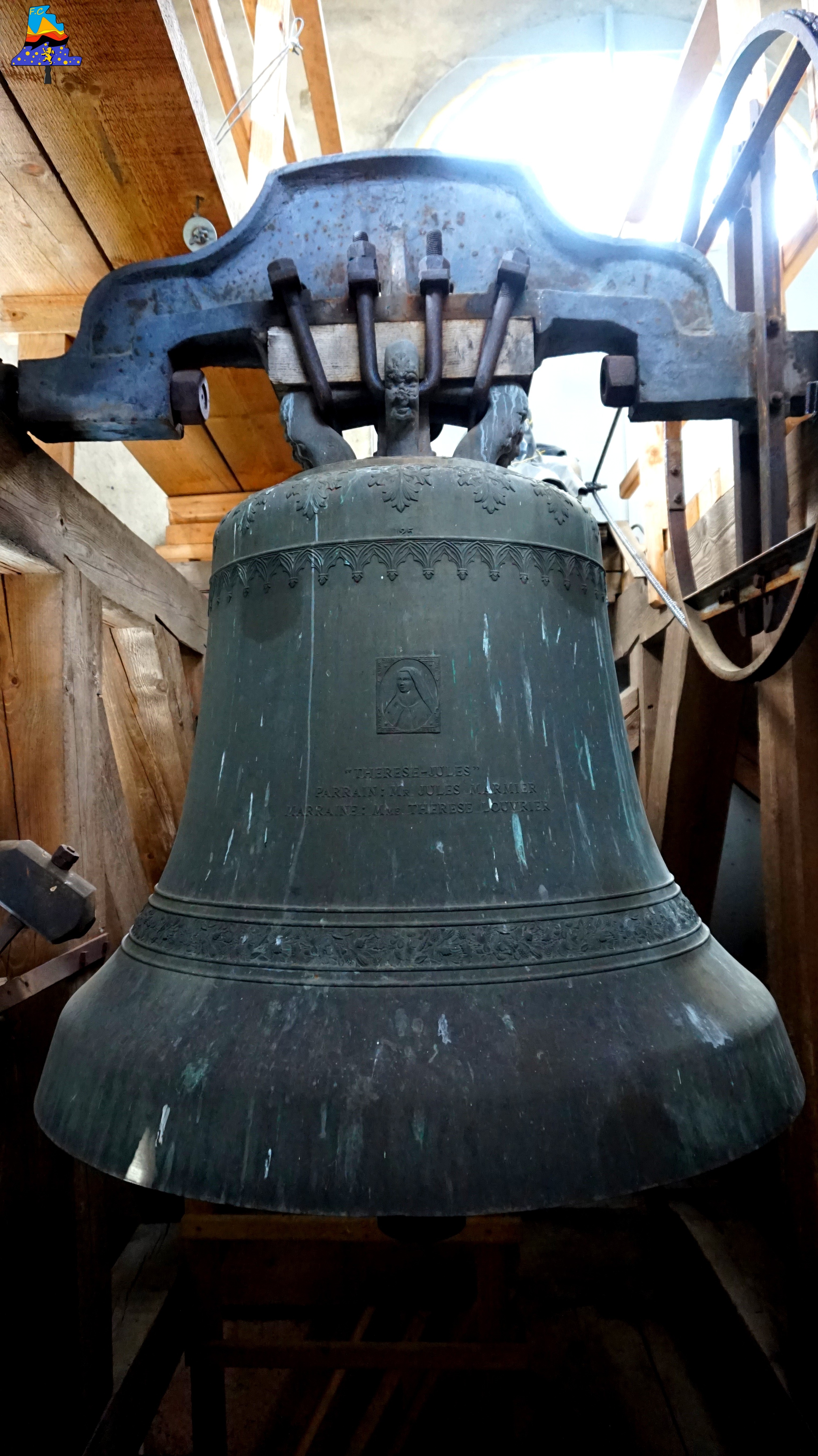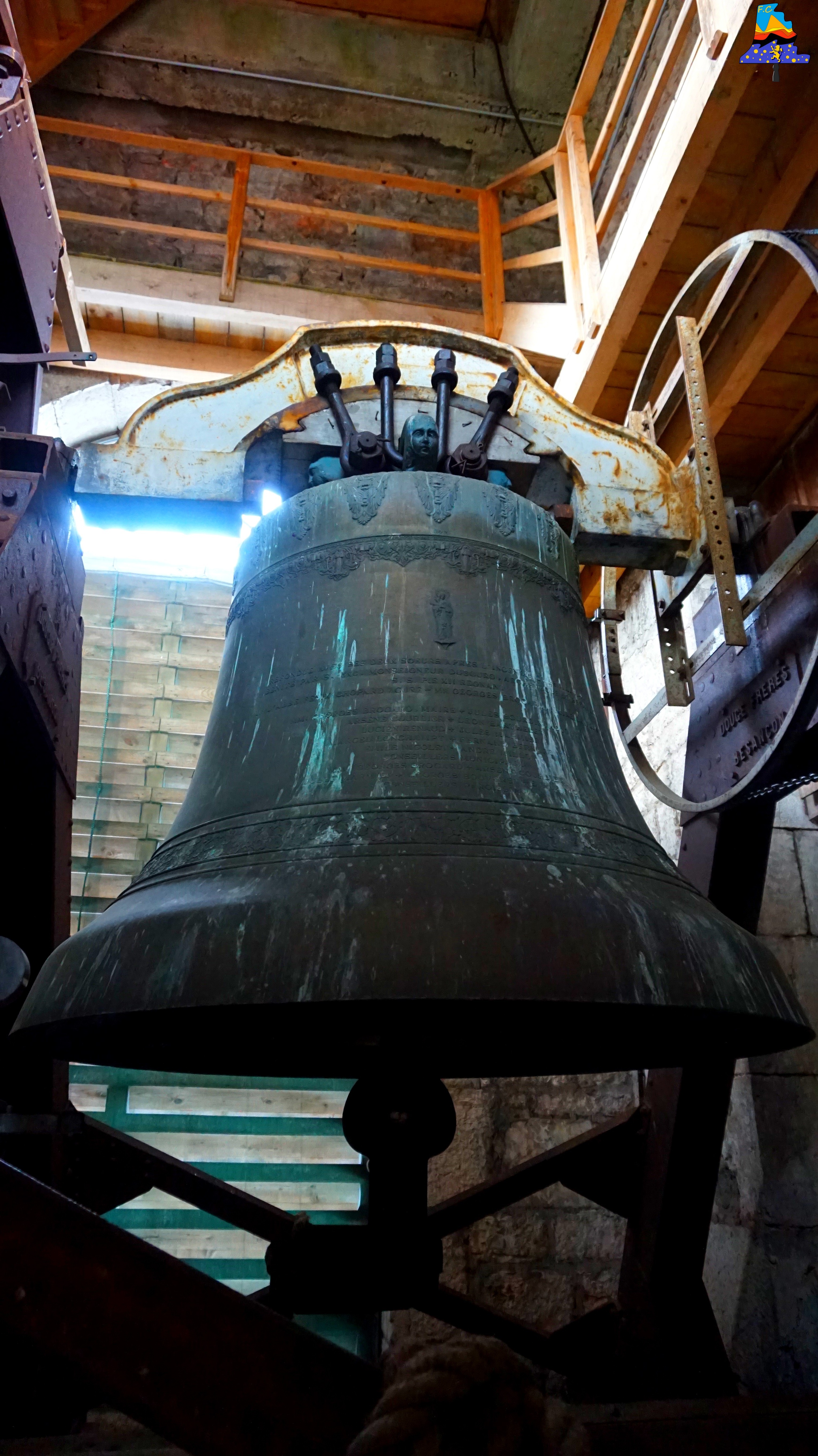 Bourg du Haut-doubs de 1940 habitants, Frasne se situe sur un plateau à 850 mètres d’altitude au pied des monts de la chaine du Jura, au cœur d’un espace naturel exceptionnel. L‘église de la commune a été consacrée en 1833. Dédiée à Saint Georges, elle conserve dans sa sacristie une statue en argent à l’effigie de son Saint Patron. Outre cet objet, de chaque côté de son autel se trouvent deux statues en bois polychrome de Saint-Ferréol et Saint-Ferjeux, également classées. L’église a subie un terrible incendie en l’an 1 941, elle fut restaurée en grande partie avec un style bien plus « sobre » et moderne qu’avant. L‘accès est simple, les premiers escaliers en métal sont à prendre, suivis par d’autres escaliers, de bois cette fois-ci, nous devons les gravir sur 15 mètres avant d’arriver aux premières cloches, pour atteindre la petite dernière (cloche), quelques escaliers en bois sont encore à gravir! Trois belles cloches sont à noter ici, comme je l’ai mentionné plus haut, l’église a brûlée dans les années 1 940, endommageant de ce fait la sonnerie. D’après le peu d’information que j’ai sur cette ancienne sonnerie, le bourdon, pièce maîtresse de l’ensemble, était plus lourd, et était plus grave également (un La2). C’est Jules Robert qui fonda cette cloche aujourd’hui disparue, C’est désormais une cloche en Sib2 qui la remplacer aujourd’hui. Les cloches d’aujourd’hui sont les œuvres d’une seule et même fonderie, il s’agit de Paccard, et fait rare, les cloches sont parmi les rares cloches fondues en temps de guerre en France. La petite, d’un poids de 900 kg, est perchée dans le clocher, il faut gravir 8 mètres au-dessus des deux autres pour pouvoir l’admirer. Ce qui frappe est la différence d’environnement entre « Le Bas » et « L’étage », puisque nous avons ici, un beffroi en bois massif, ce qui nous laisse peu d’espace pour travailler autour de cette cloche, ce qui est tout l’inverse du bas, avec ses deux beffrois en acier. La deuxième cloche, avec ses 130 cm de diamètre, est une très belle pièce, je n’ai hélas pas grand-chose à dire de plus! Et enfin, le Bourdon, qui est bien l’une des plus belles cloches du Haut-Doubs, elle est également la 5e plus grosse cloche du Doubs, avec ses 170 cm, son poids lui, est relativement modeste, puisqu’il ne dépasse même pas les 3 000 kg! En tout cas, c’est ici une sonnerie relativement jolie et agréable à écouter, de par son histoire, cet ensemble de cloches m’a plu énormément..