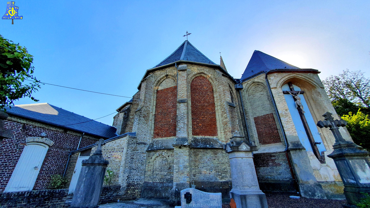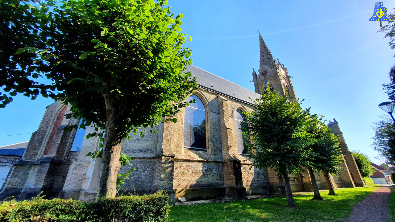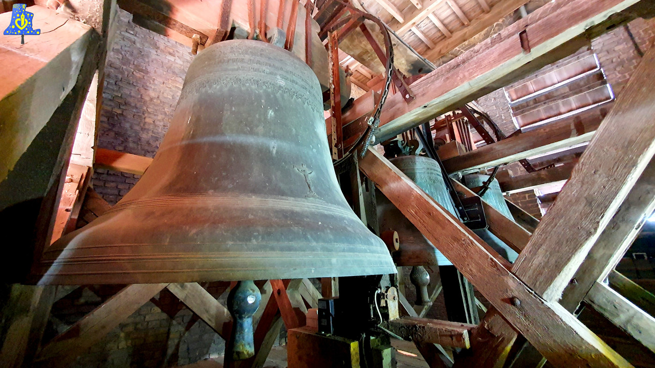 Bienvenue à Herzeele, un joli village idéalement situé entre Dunkerque et Lille. C‘est dans ce bourg, que j’ai la chance, aujourd’hui, de vous faire partager le patrimoine campanaire de cette église, remarquablement bien entretenue. La montée se fait assez facilement, mais je vous préviens, il ne faut pas avoir le vertige, car les escaliers sont assez impressionnants de par leur disposition, courant le long de la paroi. Une fois arrivé dans la chambre des cloches, nous pouvons apercevoir, parfaitement « Rangées », trois belles cloches. Je remarque d’emblée, que les décors me sont familier, du moins pour les cloches 3 & 2. En effet, Drouot de Douai, les a fondues en l’an 1888. Tout comme la plus grosse, sur laquelle j’avais un léger doute vis-à-vis de ses décors, mais en y regardant de plus près, elle possède exactement les mêmes décors. La plus petite des cloches se prénomme Catherine, et pèse pas moins de 565 kg. Ses mensurations sont proches d’un mètre de diamètre, et une hauteur un peu plus grande. Cette cloche est la seule de l’ensemble, à s’être vu recevoir, un système de volée à moteur linéaire. Les deux plus grandes sont elles, équipées de moteurs rotatifs. La cloche dite Moyenne, mais dont le nom est Antoine, flirt avec les 110 cm de diamètre, à dire vrai, il lui manque 1 petit millimètre. Le poids qu’elle affiche sur la balance lui, ne flirt pas avec les 800 kg, il les dépasse de 35 kg. Enfin, la plus grosse, Marie, dépassant de peu les 120 cm, est la seule cloche qui passe la barre de la tonne, elle pèse plus précisément 1 045 kg, c’est un beau bébé que nous avons là, qui bénéficie d’une très belle volée, peut-être même un peu trop haute, mais c’est une histoire de goût. L‘accord que les trois cloches nous donnent, est un Pater Noster. Un accord bien présent dans l’ouest de la France, mais un peu moins par ici. Les décors des trois cloches sont assez simples, avec une frise sur le haut de la robe, les inscriptions, puis encore une frise, représentant des feuillages. Au centre des cloches, nous pouvons voir le entre autre, le Christ, et de l’autre côté, la marque du fondeur. Normalement, mon texte sur les cloches devrait s’arrêter là… Mais lors de mes prises de vues intérieurs, une curiosité attire mon attention.. Une cloche d’appel au profil assez ancien.. Je pris une chaise pour m’approcher.. Et là, c’est un véritable trésor qui s’offre à moi! Cette cloche se classe parmi les plus anciennes des Flandres Maritimes Françaises, puisque sur cette cloche, nous pouvons y lire la date de 1 587! Je n’ai pu prendre d’autres infos malheureusement, car cette cloche est en hauteur. La morale de cette visite, est que le trésor campanaire (Cloche), n’est pas toujours là où l’on ne l’attend.. Je vais quand même la répertorier dans les cloches du site pour le coup… Faisant d’elle, la 333ième cloche du site!