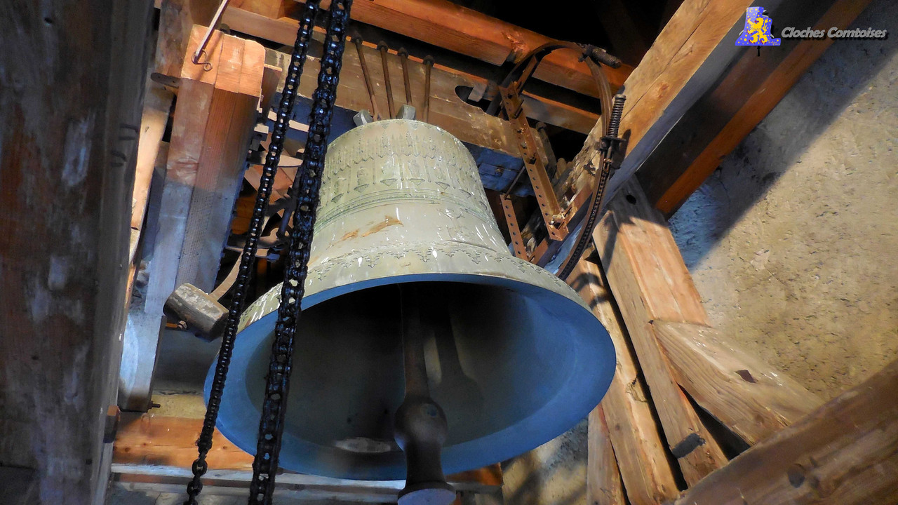 Encore un vieil article qui va avoir le droit à sa petite mise à jour, et c’est avec joie que je vais me replonger dans une découverte qui m’avait alors marquée à l’époque. C‘était en début d’année 2 016 que j’ai eu la chance de me rendre dans cette commune attractive qu’est Jougne, située à deux pas de la frontière Suisse, au pied du toit du Doubs, le Mont-D’or. La partie nature de ce village est omniprésente, et dispose, de ce fait, d’un grand nombre de sentiers de découvertes pédestres, mais aussi de VTT. L‘église de la commune est superbement bien entretenue, dispose de dimensions assez impressionnantes. Le plus impressionnant reste tout de même l’arrière. Celui-ci se jette quasiment dans le vide, pour mieux voir ça, je vous invite à vous rendre à l’entrée du village sur la D423, c’est incroyable que l’église n’ait aucune fissure! Je n’ai hélas pas su prendre de photos de l’intérieur de l’église, du coup je dois passer outre cette partie, et aller directement à l’essentiel, c’est-à-dire, les cloches. Les cloches sont soutenues par un beffroi en bois. Celui-ci est massif, et c’est le minimum lorsque nous voyons le poids des cloches que doit supporter le beffroi quand celles-ci sont en mouvement. Ces trois cloches furent toutes fondues par la fonderie de Jules Robert de Nancy, et ce, en l’an 1 898. Jules Robert a fondu pas mal de ses œuvres pour le secteur, je pense notamment à la charmante sonnerie de 4 cloches de La-Cluse-Et-Mijoux, mais aussi à la cloche n°2 de Courvières et enfin, les cloches n°2 & 4 de Les Fourgs. Cloches reconnaissables de par leurs magnifiques décors, leurs qualités audio ne sont plus à prouver tant celles-ci sont très réussies. C‘est au passage à Jougne, que j’ai découvert mes premières Jules Robert. La plus petite des cloches pèse 690 kg. Elle porte le nom latin de Juliana-Carolina (Julie-Caroline), enfin, la note que la cloche émet est un Sol3. La moyenne en Mi3, se nomme Adelais-Mathildis (Adélaïde-Mathilde). Le poids de cette cloche dépasse allègrement la tonne, pour s’établir à 1 220kg! Un beau bébé, qui, d’avis personnel, est la plus belle de l’ensemble campanaire. Son diamètre enfin, est de 122,3 cm. La plus grande des cloches elle, fut prénommée Carola-Martha (Carole-Marthe). Vertible mastodonte de la sonnerie, son poids est de 2 385 kg, et chante un Do3 assez bas. Son diamètre est de 152 cm. La faisant ainsi se hisser parmi les plus grosses cloches du Grand’Pontarlier! Ce fut une bien belle découverte à la frontière Franco-Suisse, dont encore aujourd’hui, elle reste gravée dans mon cœur!