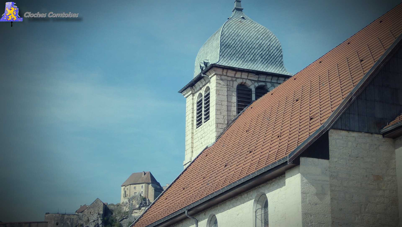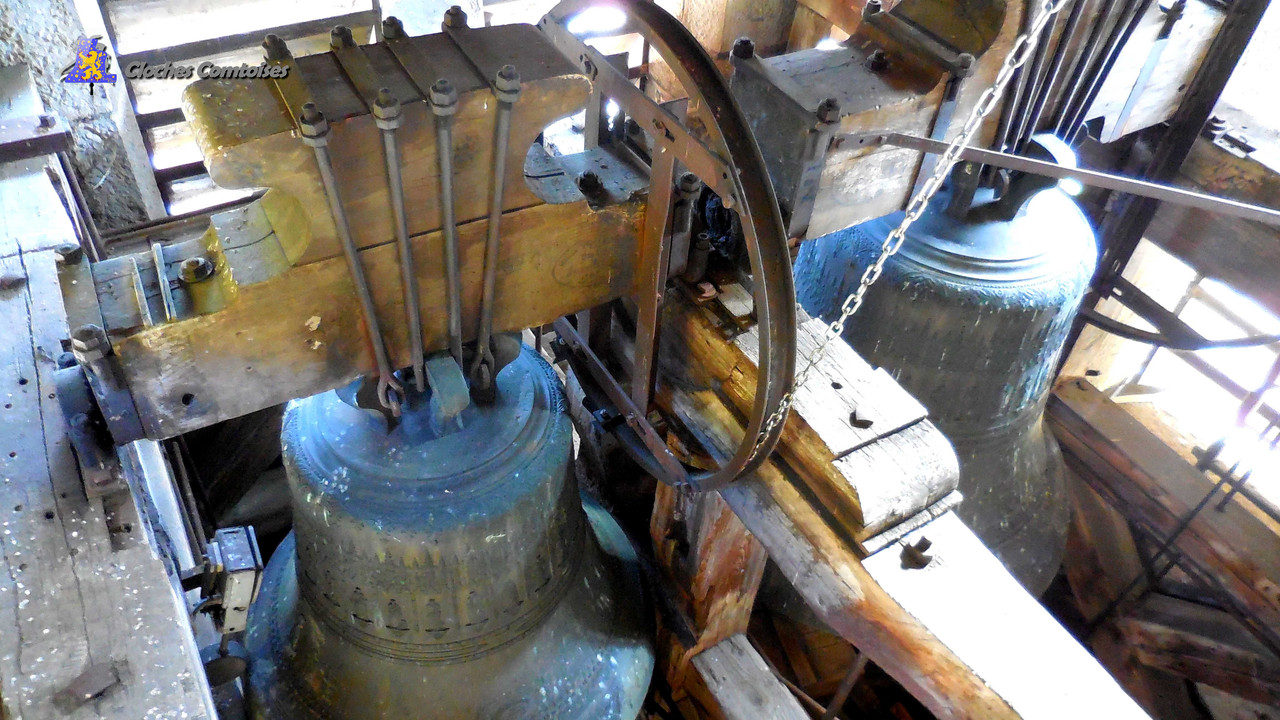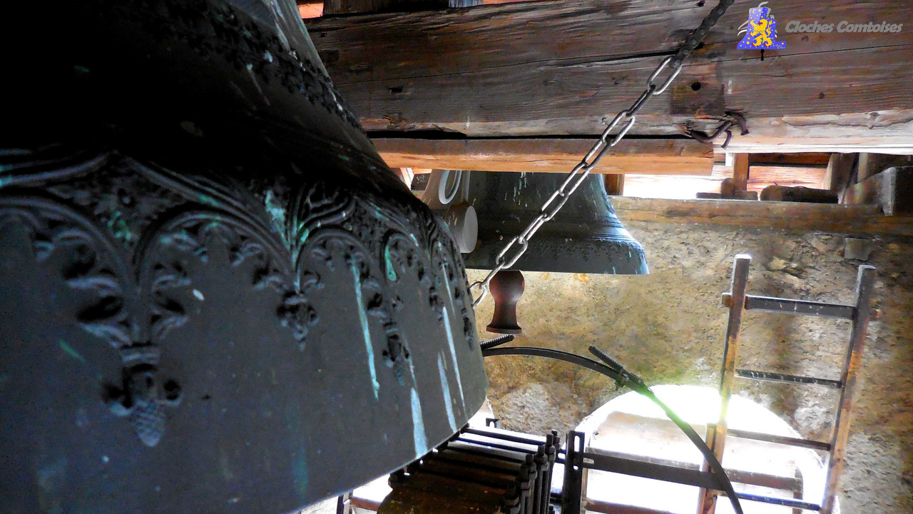 La réécriture des articles des Clochescomtoises se poursuit, avec celui de La Cluse-Et-Mijoux. Cette ravissante commune du Doubs, bien connue des touristes grâce à son célèbre château, mais aussi des frontaliers, puisque point de passage oblige, est peuplé par plus de 1 320 âmes. Véritable coin de nature, de par ses reliefs abritant son château, mais aussi, lui faisant face, le fort Malher, la ville offre ainsi de nombreux sentiers pédestres. L‘église de la commune, sous le vocable de Saint-Pierre, se situe au cœur de la commune, à fleur de montagne, elle possède un style typiquement Franc-Comtois, notamment vis-à-vis de son clocher dit Comtois, pointant ainsi à 20 mètres au-dessus du sol. Ses extérieurs sont beaux et superbement bien entretenus, tout comme son intérieur, qui vaut véritablement le détour. En effet, la partie nef possède un magnifique maître-autel. Viennent s’ajouter à cela, une belle chaire à prêcher et un orgue ravissant. Au sein de cette église, nous nous y plaisons. Mais pas le temps d’être en admiration devant tout ça, qu’il me faut monter au clocher, afin de répertorier les cloches que l’église a à nous offrir, et vous allez le voir, y a du travail. Au sein du clocher, il y a 4 belles cloches, toutes fondues par la fonderie de Jules Robert de Nancy, et ce, en l’an de grâce 1 899. Ces cloches sont parfaitement accordées entre elles, avec pour notes, le Reb3, Fa3, Lab3 et le Sib3. La plus petite se nomme très joliment Joséphine. Cette petite cloche a la particularité de n’être pas électrifiée, et c’est vraiment étrange pour le coup. Il semblerait qu’elle soit laissée ainsi pour laisser les enfants sonner cette cloche à la sortie des baptêmes et communions. D‘un poids de 350 kg, son diamètre est de 83,5 cm. Sa grande sœur, d’un diamètre quant à lui de 92,3 cm, se prénomme Félixe-Marie. Cette dame de bronze d’un poids de 550 kg tout de même, se balance sur deux poutres en appuis directement sur la base du clocher, prise dans la charpente de ce dernier, tout comme sa petite sœur. Une fois de plus, c’est assez curieux. Nous allons pouvoir descendre d’un étage, pour parler de Jeanne-Sidonie. Mesurant plus de 110 cm, le poids affiché de cette cloche est de 800 kg. Quant à la maitresse des lieux, j’ai nommé Constance-Judith, elle est bien plus grosse, dépassant allègrement la tonne, 1 700 kg, soit, deux fois plus que sa sœur précédemment citée. En plus de posséder de belles mensurations (141,2 cm), la voix qu’elle porte est un véritable régal pour les oreilles. C‘était en ce clocher, que j’avais eu ainsi la chance de découvrir les œuvres campanaires du saintier Jules Robert pour la première fois, et durant toute la suite de mes aventures, je n’ai jamais été déçu de la qualité de ses cloches, même quand celles-ci sont montée en lancé de type Rétro!