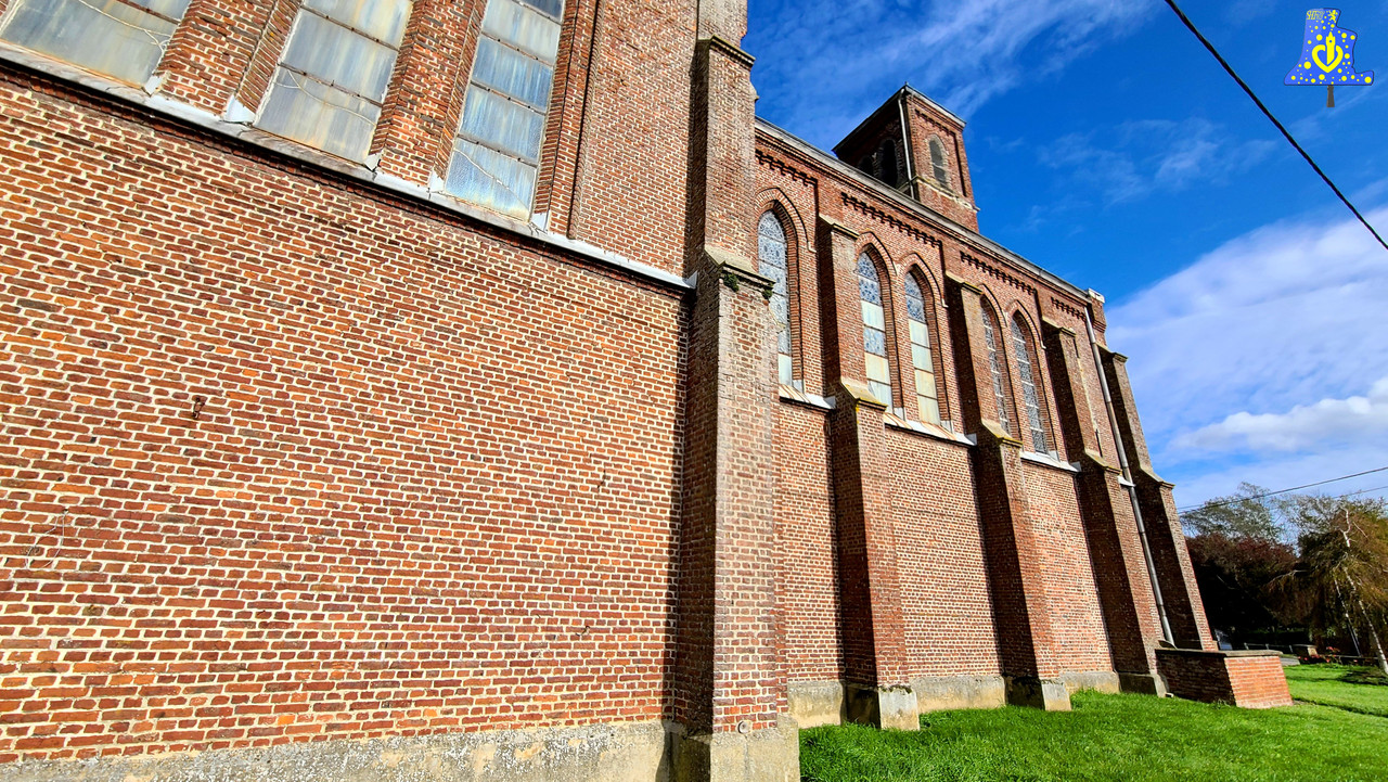 Article assez particulier que je m’apprête à vous écrire, car il n’y aura pas de vidéo faite sur la seule et unique cloche du hameau. En effet, pour des raisons évidentes de sécurité, la visite n’a pu se faire. En revanche, par le bais de diverses informations d’une association locale, ainsi que de quelques photos, j’ai pu retracer aisément l’histoire de cette dame de bronze. L‘église du Nieppe est fermée au public depuis l’année 2 007. Aujourd’hui, ne reste qu’une nef dénudée de son mobilier, comme en atteste la photo de l’intérieur de l’église. L’église possède encore sa cloche, une cloche dont le nom, assez long. Mr Salomé, alors curé-doyen d’Hazebrouck, assisté par Mr L’abbé Dehenne, le tout premier curé de cette petite église, la nommèrent Georgine-Marie-Augustin-Anatole. La cloche a été fondue par les fondeurs Cavillier d’Amiens et les Gorlier, en 1 877, date d’édification de l’édifice . C‘est donc une belle cloche picarde. Cette cloche, dont le poids estimé est de 353 kg, possède un diamètre de 83,5 cm, et chante le La3. Mais malheureusement, cette cloche ne peut sonner pour deux raisons: La vétusté du clocher, mais aussi, et surtout, par la présence d’une impressionnante fêlure. Cette fêlure parcourt la cloche du haut de la cloche, entre les anses, puis descend le long de sa robe, jusqu’à mi-hauteur, avant de remonter de quelques centimètres, avant de se perdre… C‘est quasiment la même fêlure que j’ai eu à faire lors de ma visite à Lods. C’est d’ailleurs sur ce modèle, que j’ai pu faire la simulation de la volée de cette cloche. Je vous laisse donc découvrir cette ravissante cloche, à l’aide de ces diverses photos, aimablement fourni par un habitant de la commune, il y a quelques années.
