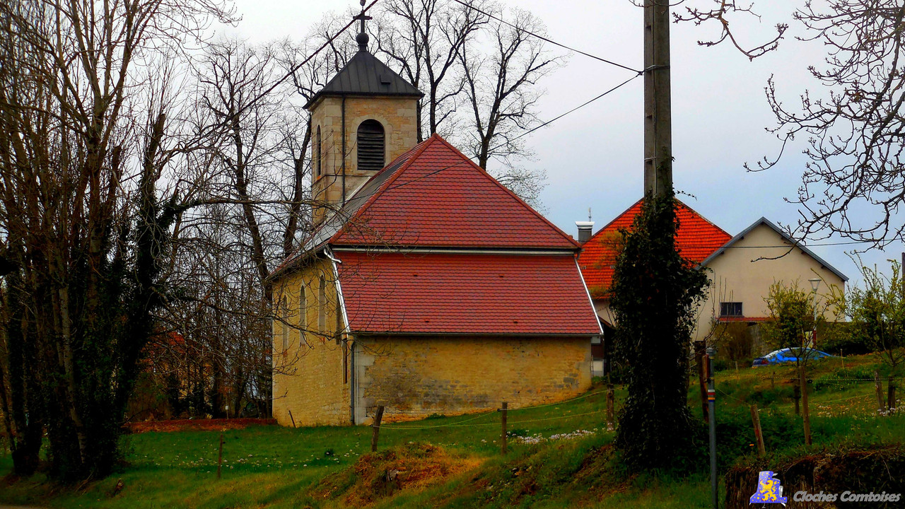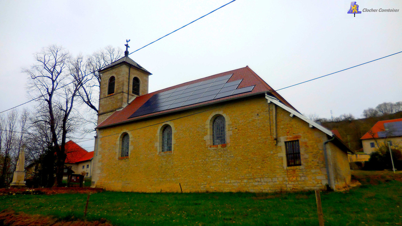 Hautepierre est l’un des nombreux anciens villages qui constituent de nos jours, la nouvelle commune de Les Premiers Sapins. Dans ce petit hameau, le cadre dans lequel vivent ses habitants est tout simplement incroyable, avec en prime, la possibilité de gravir « La roche », avec à la clef, un panorama exceptionnel sur la haute vallée de la loue, et par temps clair, il est possible de voir le mont-blanc. La petite église dont les dimensions sont à l’échelle de l’ex-village, possède une petite originalité. En effet, la municipalité a investi dans la création de surface de panneaux photovoltaïques, avec comme support, la toiture de la nef, il y a de cela quelques années. Dans l’église, il n’y a pas grand chose à dire. Tout est dans son jus, et est plutôt bien entretenu. Le descriptif des cloches sera relativement rapide. Comme pour la plupart des sonneries de la région, celle-ci se fait sur deux cloches. Ces cloches reposent sur un beffroi fait de bois, donnant à cet ensemble photogénique, un réel charme aux yeux des puristes campanaires. Parlons un peu de la plus petite des cloches. Œuvre fondue par Francois-Xavier Roy en l’an 1 809, le nom qui lui a été donné est le suivant: Françoise-Augustine-De-Hautpierre. Sa marraine est Dame Jeanne-Françoise, et son parrain, Mathieu-Augustin Verdant, alors prêtre de la paroisse. Elle possède les décors typiques des cloches issues de la fonderie bisontine. C‘est Louis Roy qui reprit la succession. Le poids de cette cloche est de 139 kg. Chose assez étrange, le joug est un peu trop lourd pour la cloche, de ce fait, au lieu de sonner en lancé franc, comme sa sœur, c’est en lancé rétro-équilibré que la sonnerie s’opère. La grosse cloche est elle plus récente. Nommée Léonie-Marie-Antoinette, cette cloche fut coulée en l’an 1 889, la même année que la construction de la Tour Eiffel. Cette cloche est sortie des ateliers des Bournez, fondeurs de Morteau. Quant à son poids, il est de 460 kg. Les notes de ces deux cloches sont les suivantes: Le Fa#3 et le Do#4.
