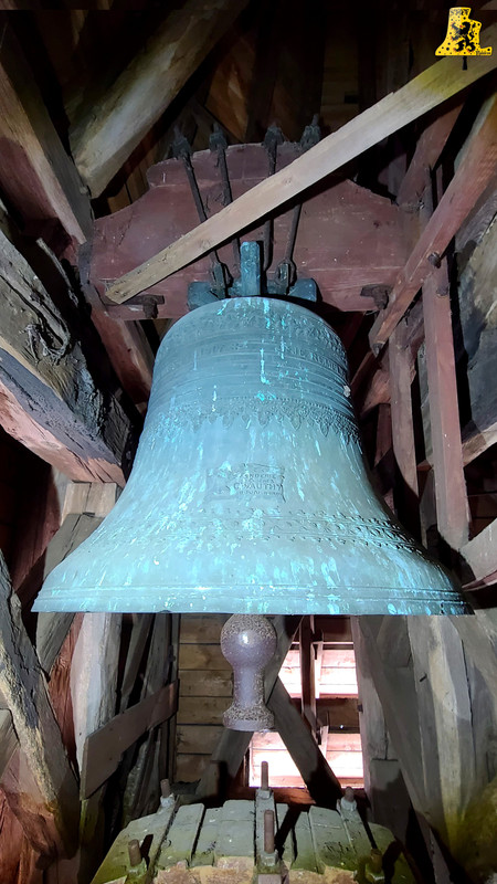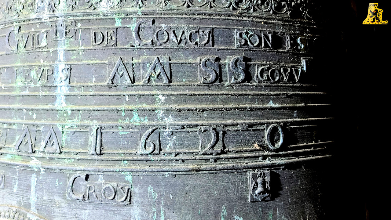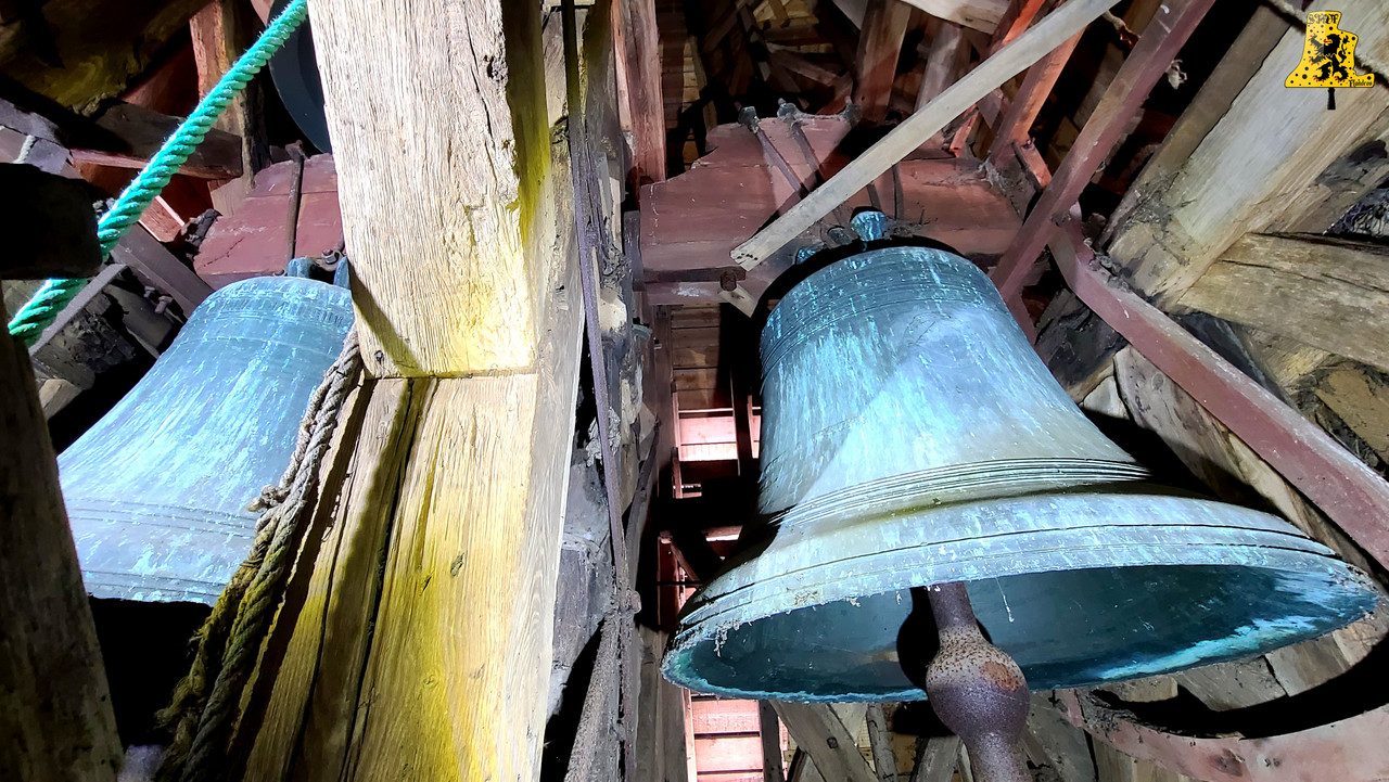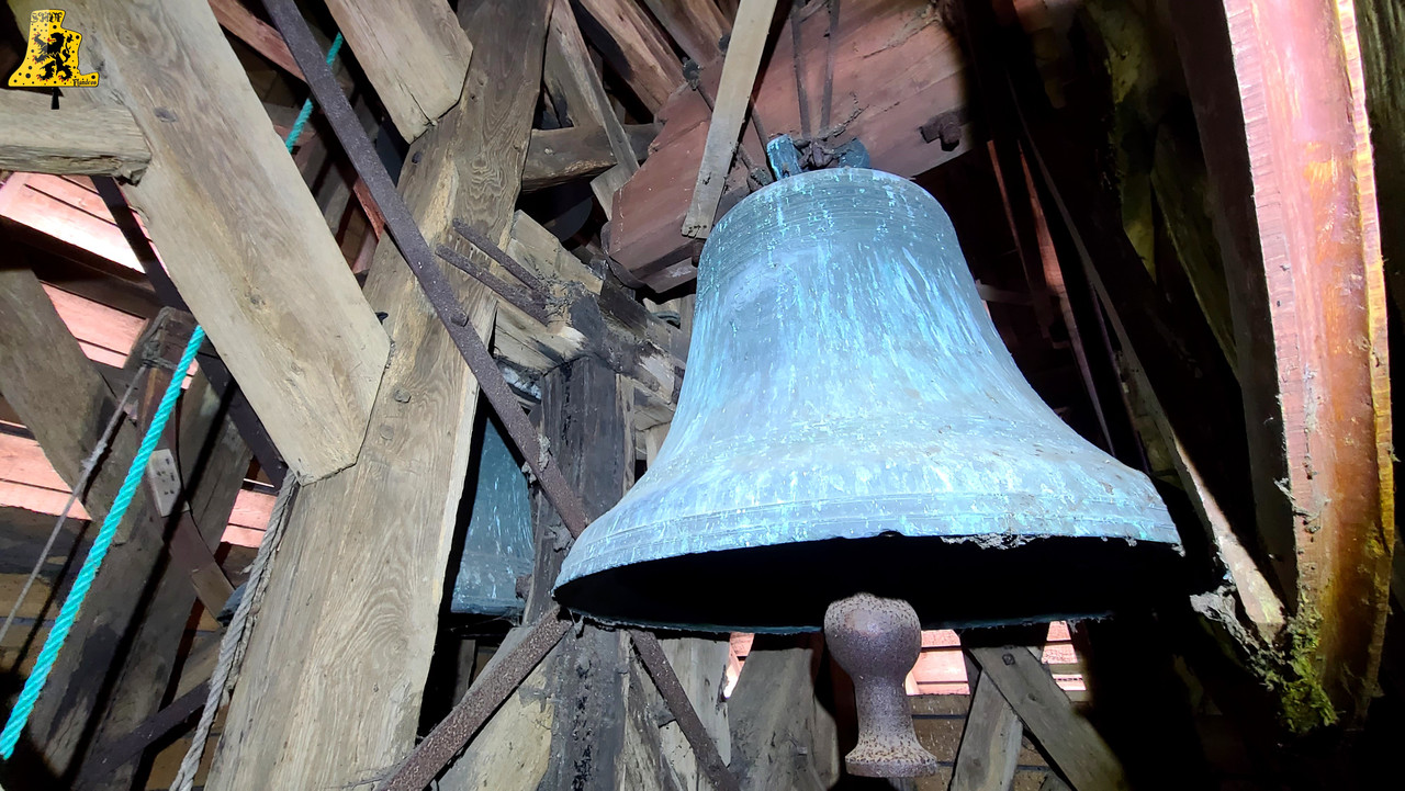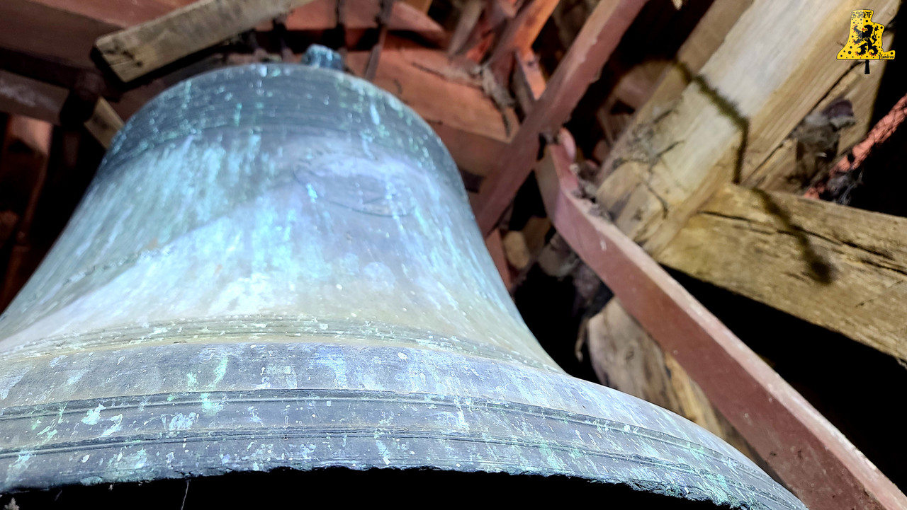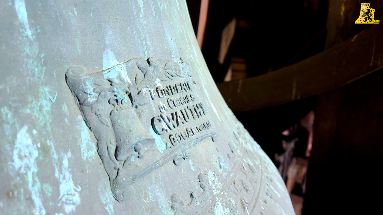 Pour cette nouvelle découverte, c’est à Lez-Fontaine que j’ai eu l’honneur de promouvoir le patrimoine des cloches. Cette petite commune limitrophe de Solre, où je me suis déjà rendu, compte 220 habitants. Son patrimoine est remarquable, avec notamment la présence d’un théâtre de verdure (De plein air), et d’une chapelle possédant des fresques très anciennes. L‘église du village n’est pas en reste, puisqu’elle est classée aux monuments historiques. On relèvera notamment sa voûte en bardeaux à charpente apparente peinte est un témoignage unique et extrêmement rare du style primitif flamand. Cette voute daterait de l’an 1 531! Concentrons-nous sur ce qui nous intéresse davantage, la montée aux cloches est assez ardue, dans un premier temps, il nous faut prendre une échelle partant du bas de la nef, jusqu’à la charpente. De là, ça se complique un peu, une autre échelle, un peu plus raide cette fois, nous emmène jusqu’aux cloches. Le clocher est rempli à merveille, et je peine à travailler confortablement. Sur les trois cloches, deux sont classées aux monuments historiques! C‘est un véritable miracle lorsque l’on sait ce qu’il s’est passée à Solre et Avesnes! Ces deux cloches ont donc survécus à la révolution et aux guerres! La plus grosse des cloches a été fondue en l’an de grâce 1 620. Avec l’aide précieuse d’un ami campanophile, et de Mr Sutter, président de la SFC, je peux vous donner avec quasi certitude les fondeurs qui ont œuvrés à la réalisation de cette cloche. Le premier blason visible sur la cloche est celui de Michel Brochard, et le second, d’Antoine Regnault (A.R.). Ils sont tous deux Lorrains, et ont fondu la cloche vraisemblablement sur place. Grâce à la mairie et a son site web, un travail de relevé d’inscriptions a été fait, les voici: « EN MEMOIRE DE HAVT ET PVISSANT SEIGNr DE CROY ET DAME MEE PHELS GVILTE DE COVCY SON ESPOVSE COMTE ET COMTESSE DE SOLRE, DV CONSEIL D’ESTAT, GRAND ESCVYER DE LEVERS AA SS GOVVr CAPne ET GRAND BAILLY DES VILLES ET CHASTEAVX DE TOVRNAY, CHEF D’VNE COMPnie D’HOMMES D’ARMES, DES ORDONNACES DE LEVRS AA. AN 1620. » Puis, sous ces textes, voici d’autres inscriptions, celles-ci sont entrecoupées,: « JE FLORIRAY COVCY, JASPIRERAY COVCY, POVR SERVIR LE VRAY DIEV, JESVEILLERAY LES CŒURS, EN MEMOIRE A TOVJOURS, DE SI BRAVES SEIGNrs. ». Cette jolie cloche nous chante un Fa3 un peu haut. Son poids est de 655 kg, pour un diamètre dépassant légèrement les 105 cm. La doyenne du clocher nommée Jeanne, est la cloche de taille moyenne. Elle fut fondue en 1 546, la même année que la campagne d’embellissement de l’église, portée par Jeanne De Ligne. D‘ailleurs, Jeanne De Ligne figure sur cette cloche à travers ces inscriptions en lettres gothiques: « Jeanne de ligne, dame de Molembaix, mil Ve XLVI.« . Bien qu’il ait un écusson avec une cloche, signe de la griffe d’un fondeur (Enquête en cours, serait-ce peut-être un certain Jean Delaitre? », je ne parviens pas à le déchiffrer. Cette vénérable cloche pèse 510 kg, pour un diamètre de 96cm, c’est un véritable joyau de l’époque gothique, qui nous chante un Sol3 un peu bas, d’où cette impression de demi-ton entre la grande et elle. L‘histoire de la plus petite des cloches est bien plus mouvementée. Avant la cloche actuelle, datée de 1 923, il y avait une cloche de 1 853, sur celle-ci, nous pouvions y lire qu’elle remplace une cloche de 1 720. La cloche actuelle a été fondue comme dit plus haut, en 1 923, par le fondeur C.Wauthy, fondeur à Douai. Elle possède un diamètre de 90 cm, pour un poids affichant 415 kg. Je tiens à m’excuser, car j’ai omis de relever le prénom de cette cloche… Le plus surprenant dans tout ça, c’est que l’ensemble des 3 cloches sont actionnées encore à la corde! C‘est ce qui rend la sonnerie unique dans mon aventure des Sonneries-Hauts-De-France! Comme vous l’aurez compris, à ce jour, cette découverte se classe parmi mon top3 des plus belles trouvailles! Trouvailles faite grâce à Amadéo, enfant de chœur de la paroisse. Il est tant de nous mettre en position pour sonner, Mr Hannecart à la petite cloche, moi-même à la moyenne, et Thomas à la plus grande! La suite, est a voir ci-dessous, dans la vidéo.