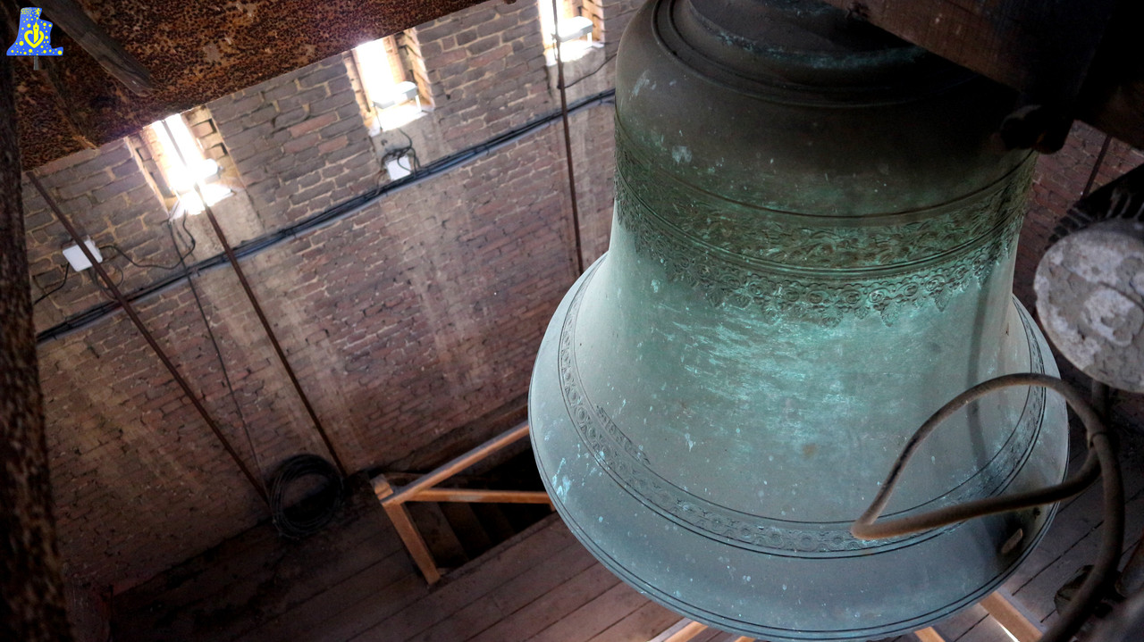 Juste après notre visite à l’église de Merville, Mr Wicart, l’employer des services techniques à la ville, me proposa d’aller voir la petite cloche de la mairie, chose que j’accepte par curiosité, c’est alors que nous entamons notre ascension jusqu’à cette cloche. De nombreux escaliers nous sont à prendre, de ceux, depuis le hall d’accueil, j’ai eu la chance de passer par des lieux que très peu de gens ont eu la chance de voir. C‘est 45 mètres plus haut que nous arrivons à cette fameuse cloche. Alors oui, la description de la cloche va être relativement rapide. Compte tenue de sa position, je n’ai pu prendre les différentes mesures afin de déterminer son poids, ça sera donc une estimation visuelle que je vais vous faire. Cette cloche fut fondue par le même fondeur que les cloches de l’église, en effet, la ville passa commande auprès de la fonderie Wauthy de Douais en 1 930, suite à l’inauguration de l’hôtel de ville, le 7 Avril 1 929. Cette cloche, dont la fonction première est de donner les heures, pèse environ 400 kg, mesure sensiblement 90 cm de diamètre, et chante le La3. Elle ne possède pas d’inscription particulière, hormis la signature et la date de la fonte de la cloche. Cette petite cloche ne dispose pas de battant, et est fixe. Nous pouvons lire sur le joug de la cloche « Merville » mais a l’envers. La chose qui est intéressante à noter, c’est la présence des anciennes accroches qui servait dans le temps, à étendre les lances des pompiers, afin de les faire sécher.