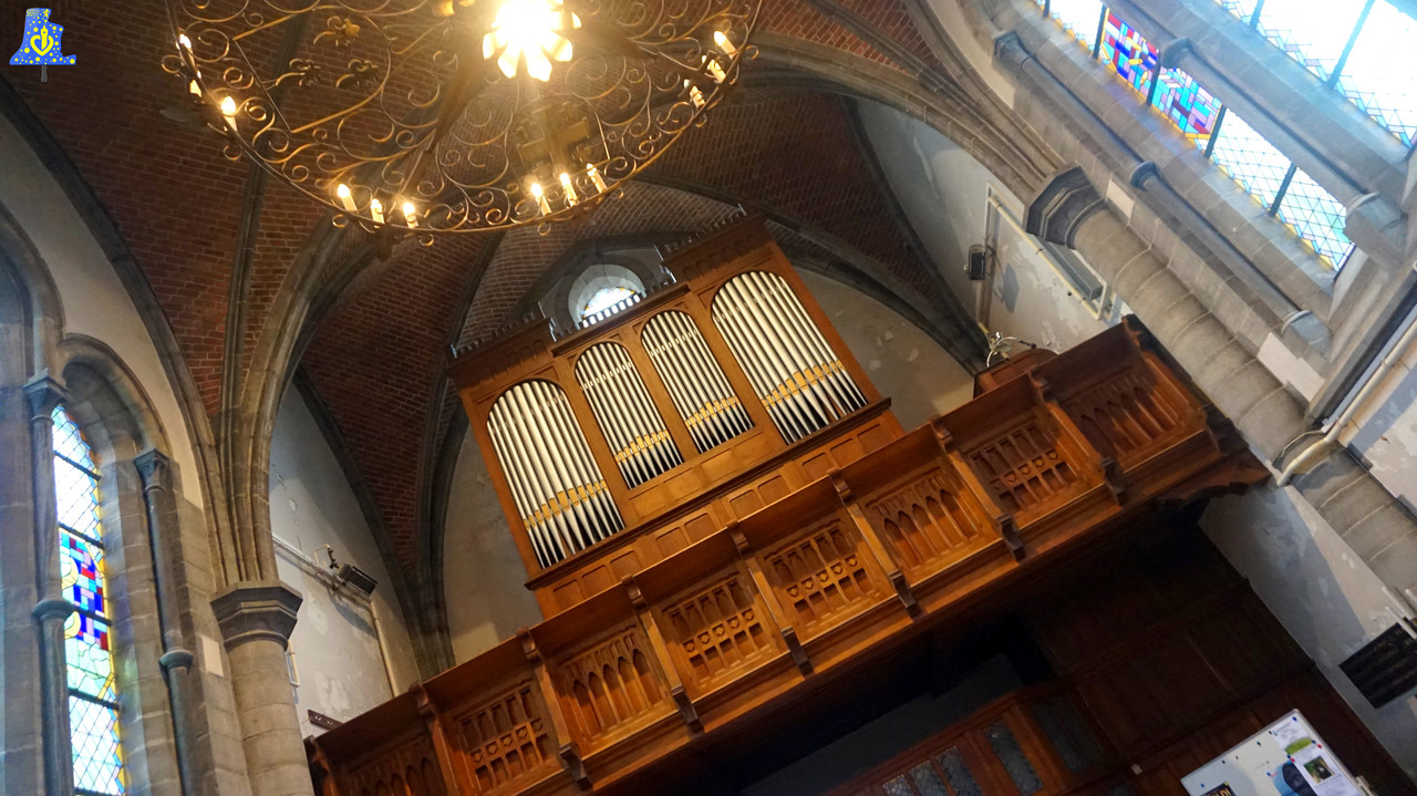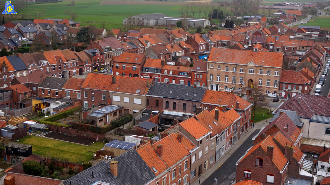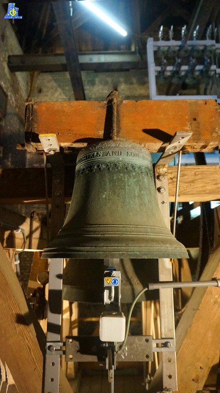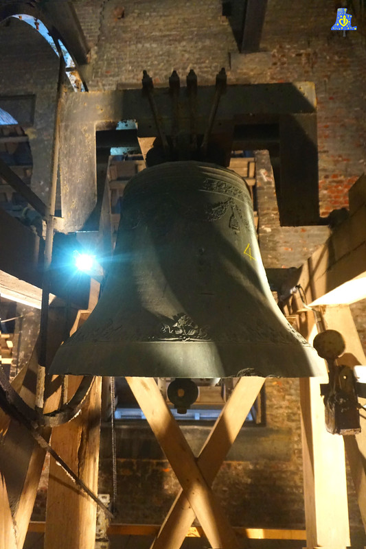 Pour cette première découverte en Belgique, je me suis rendu à Messines, Mesen en Neerlandais, dans cette belle église aux dimensions atypiques et impressionnantes, pour accéder aux nombreuses cloches de cet édifice, il nous faudra gravir plus de 200 marches, pour arriver à une hauteur de 40 mètres! A cette hauteur, se trouvent les cloches. Mais le voyage s’arrête pas là, en effet, nous sommes invités à gravir encore quelques marches, pour arriver au sommet de la tour du clocher, à plus de 50 mètres du sol.. De là, nous avons une vue époustouflante sur les envions.. Voyant les villes de Lille, Armentière et Ypres. Après cette assez longue intro, nous pouvons parler des cloches. Le nombre de cloches est pour le moins élevé, puisqu’il y pas moins de 58 cloches! Seules 3 cloches se retrouvent équipées de système de volée en mode Rétro-grade, comme dans la plupart des cloches de Belgique. Les cloches fixe du carillon ont toutes été fondues en 1 985 par la fonderie Eijsbouts de Astee, aux Pays-Bas, ces cloches sont les offrandes de plusieurs pays et villes. Vous trouvez après la présentation photo des cloches de volée, la liste généreusement fournie par Mme. Hénnion. Les cloches de volée sont aussi reliées au carillon, et sont en volée rétro-grade, elles sont toutes de même époque, 1 931 , et de même fondeur, à savoir Slegers-Causard, fondeur de Tellin (Belgique). La plus petite se nomme Nicolas, en référence au patron de cette église, elle mesure 75 cm de diamètre pour 250 kg. La moyenne, se prénomme « Joseph », elle mesure 90 cm de diamètre, pour un poids de 440 kg. Enfin, la grosse, prénommée Marie mesure 115 cm, pour un poids de 875 kg. Ce sont des cloches en profil léger, donnant les notes du Mi, Sol# et du Si, le tout, sur le 3e octave. La plus grosse cloche de l’église est fixe, elle fut offerte par plusieurs villes allemandes, elle a été livrée en 2 001, elle est donc également la plus récente. Elle mesure pas moins de 135 cm, pour un poids de 1 670 kg et donne le Ré3. La plus ancienne elle, date de 1 922 et chante le Si4.