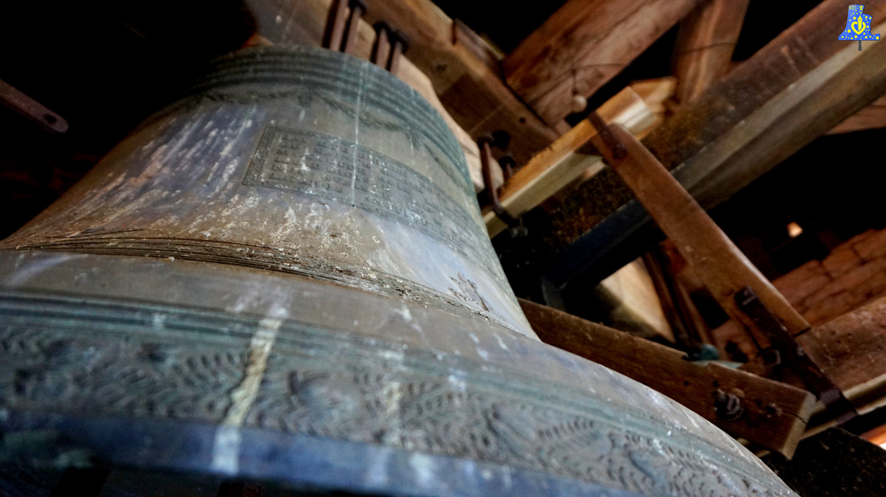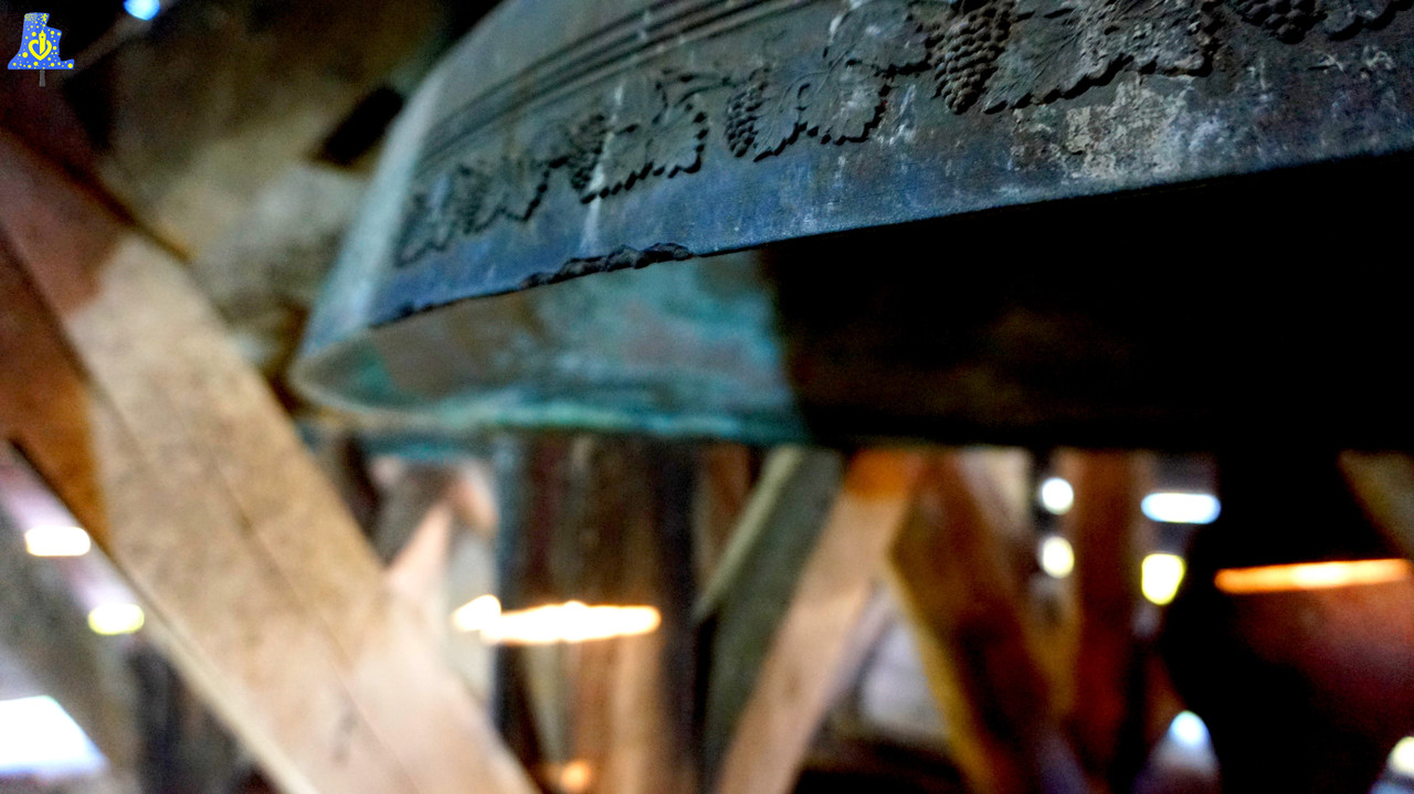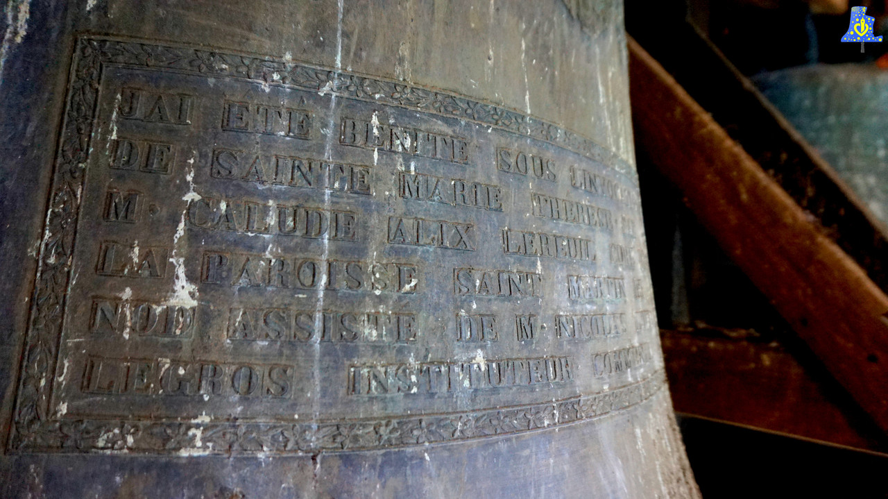Commençons notre petit voyage en Côte-D’or, et plus précisément, le Châtillonais. C‘est à Nod-Sur-Seine qui sera la première des 5 sonneries que je vais avoir la chance de vous faire partager. Avant de commencer, je tiens à remercier Yannick Baudey, qui a tout simplement organisé ce magnifique Week-End, et pour une première visite, il m’a réservé une surprise de taille, car après avoir gravi les quelque 15 mètres de diverses marches, nous pouvons contempler deux cloches vraiment imposantes, et surtout, toujours sonnées à la corde, une véritable rareté en France. Comme je le disais plus tôt, deux cloches logent dans le clocher, elles sont toutes deux de même époque et du même fondeur. Les fondeurs Paintandre de Vitry les livrèrent en 1 844, les notes sont assez proches, de l’ordre du demi-Ton, je pense qu’elles ne devaient pas avoir ces notes-ci, du moins pour l’une des cloches. La plus petite des cloches se prénomme Marie-Thérèse, elle mesure un bon 130 cm, pour un poids de 1 220 kg, sa note est le Rébémol 3. Sa grande sœur, Marie-Célestine, lui répond d’un Do relativement joli. La petite anecdote que Yannick m’a révélé vis-à-vis de l’installation électrique est la suivant. Lorsque les cloches ont été électrifiées, les personnes servant la messe se demandaient pourquoi les cloches ne sonnaient pas, pourtant un boitier de lancement des cloches avait été installé, c’est alors qu’ils montèrent au clocher afin de vérifier les équipements de volée, mais force est de constater qu’aucun système de volée n’a été mis en œuvre après travaux, mais que seul un marteau de tintement a été ajouté, permanentant de sonner les heures. Autre anecdote, l’une des baies du clocher a dû être élargie pour laisser la Grosse Cloche passer lors de son installation, c’est largement visible de l’extérieur, cliquez ici pour voir la photo :).