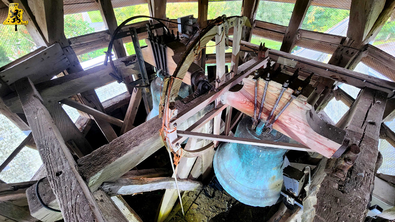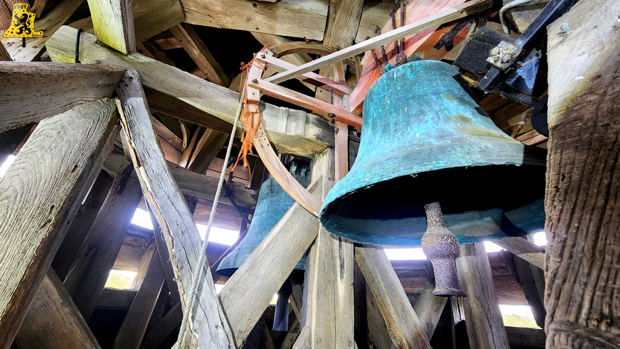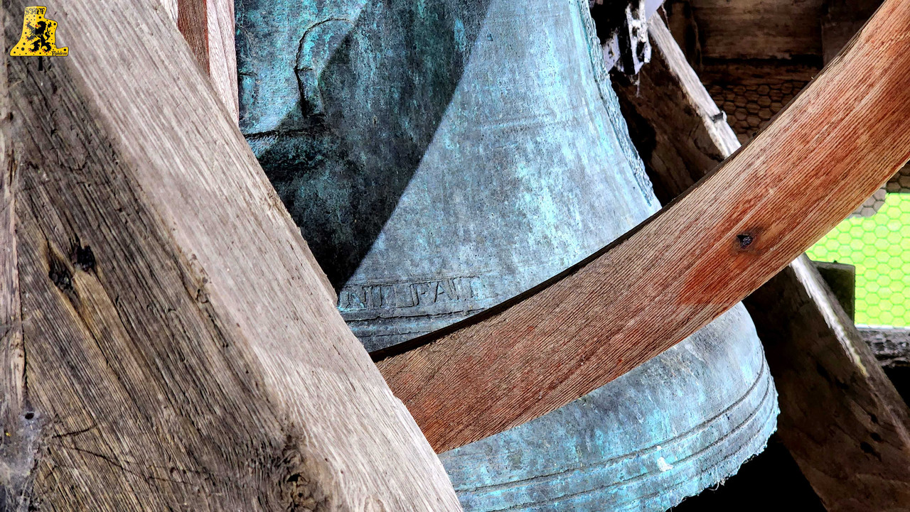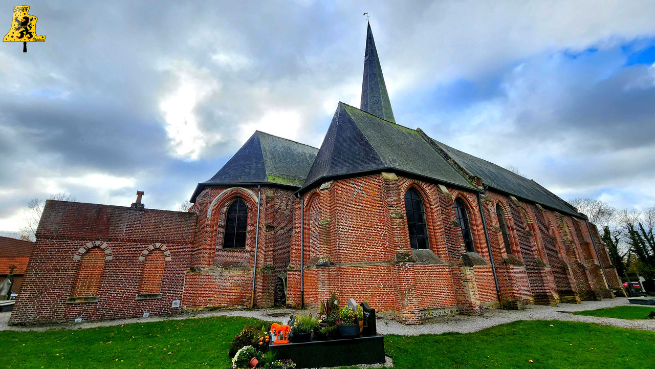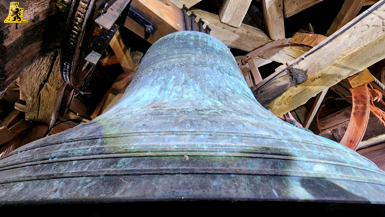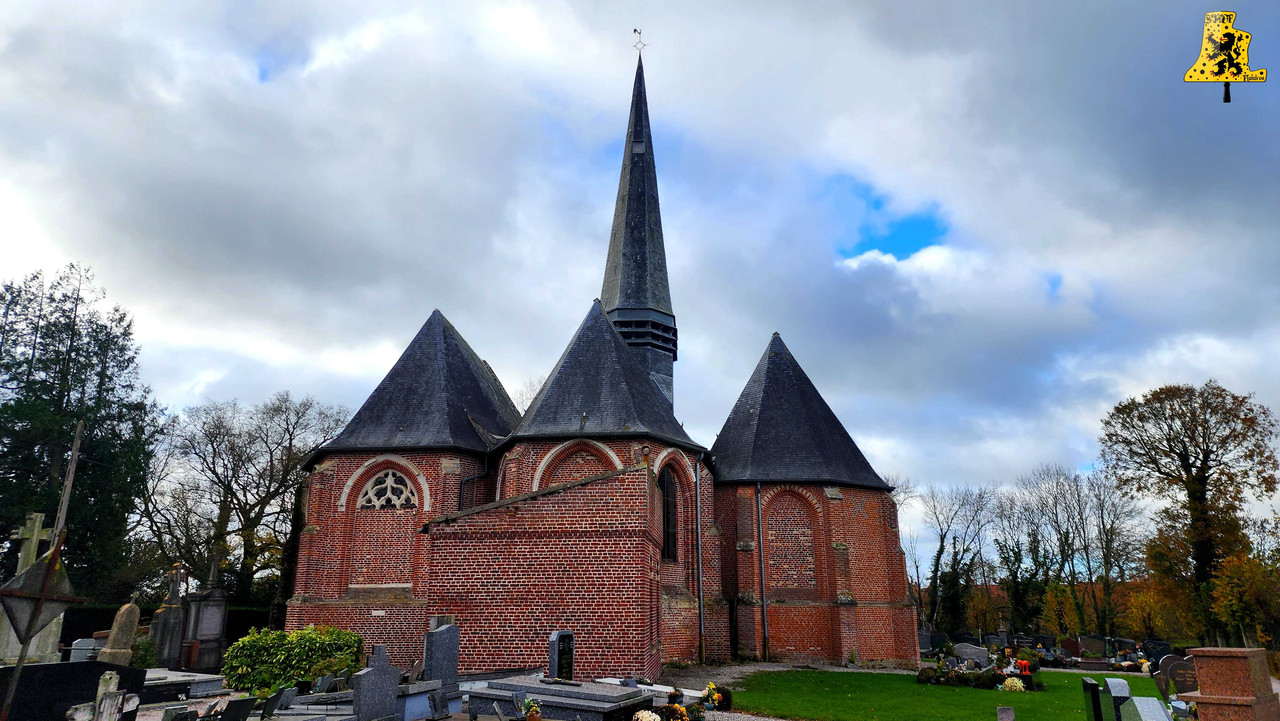 Pour cette nouvelle découverte, mon trajet change de l’ordinaire, en effet, je me rends non loin de ma commune! C‘est donc à Ochtezeele (« Oktezèle » pour la prononciation) que je vais avoir la chance de réaliser le reportage, sur le patrimoine campanaire de l’église. Avant toute chose, le village est très porté sur l’histoire Flamande, en effet, il est possible de voir un peu partout sur la commune, les panneaux bilingues Flamand/Français, ainsi que divers panneaux d’information, relatant l’histoire du village. L‘autre curiosité de la commune est la motte féodale, classée aux monuments historiques depuis les années 1 979, elle est située à environ 200m de l’église. L‘église est elle aussi classée. L‘extérieur côté entré semble modeste, mais une fois passé de l’autre côté (cimetière), c’est une toute autre église qui s’offre à nous. L‘église Hallekerque est une église flamande possédant 3 nefs, généralement, avec des plafonds en « coque de bateau retourné ». L‘intérieur de l’église est richement décoré, et pour tout vous dire, c’est l’un des plus beaux intérieurs que j’ai eu la chance de voir depuis le début de « Sonneries Hauts-De-France », rivalisant presque avec Oxelaëre! Voyez vous-même avec les photos présentes ci-dessous. L‘accès jusqu’aux cloches se fait par un premier escalier qui nous mène jusqu’à la toiture de l’église, de là, il nous faut sortir, et prendre la porte au pied du clocher. De là, il nous reste encore un petit effort à fournir, avant de toucher au but. Une fois arrivé aux cloches, nous avons la chance d’en observer deux. Je m’aperçois très vite que quelque chose cloche, la petite est dépourvue de moteur, en revanche, une corde descend tout le long, jusqu’à l’autel (J’ai fait la visite de l’intérieur après sonnerie). Nous sommes donc en présence d’une dite « Sonnerie Hybride »: Une cloche à la corde, une autre motorisée. J’ai déjà eu ce cas de figure à Montrond-Le-Château dans le Doubs, mais là, la cloche manuelle était très fortement ébréchée. C‘est un cas très rare, car outre Montrond et Ochtezeele, je n’en connais pas d’autre. La plus petite des cloches fut fondue en l’an 1 715, ce sont les fondeurs « E. & I. Du Cray, Belot & A. Bertan qui se sont vu confier la fonte de cette cloche, vraisemblablement sur place. Elle fut nommée Saint-Pierre (Sainte-Pieter), sa marraine est Issabelle Thérèse Denyse De Losegaat. Cette cloche possède la particularité d’avoir l’intégralité de ses textes en Flamand, il était donc assez compliqué pour moi, de réussir à obtenir quelques infos. Le diamètre de la cloche est de 74,4 cm, pour un poids de 250 kg. Sa grande sœur est beaucoup plus récente, puisqu’elle a été fondue en 1 901, dans les ateliers de la fonderie Wauthy à Douai. Nommée joliment « Marie Immaculée », elle possède pour diamètre, un bon 84 cm, son poids quant à lui, est de 335 kg. Son parrain est Auguste David d’Hazebrouck, et sa marraine, Dame Eugenie Isaert. Cette jolie cloche s’est vu offrir de nouveaux équipements en 2 010, lui permettant de sonner mieux qu’à l’origine. C‘est l’entreprise Bodet Campaniste, qui fut retenue pour la réalisation de ces travaux. Cependant, je regrette le faible angle de volée de cette dernière. Le son est plat et trop rapide. En tout cas, ça préservera la cloche durant des siècles.