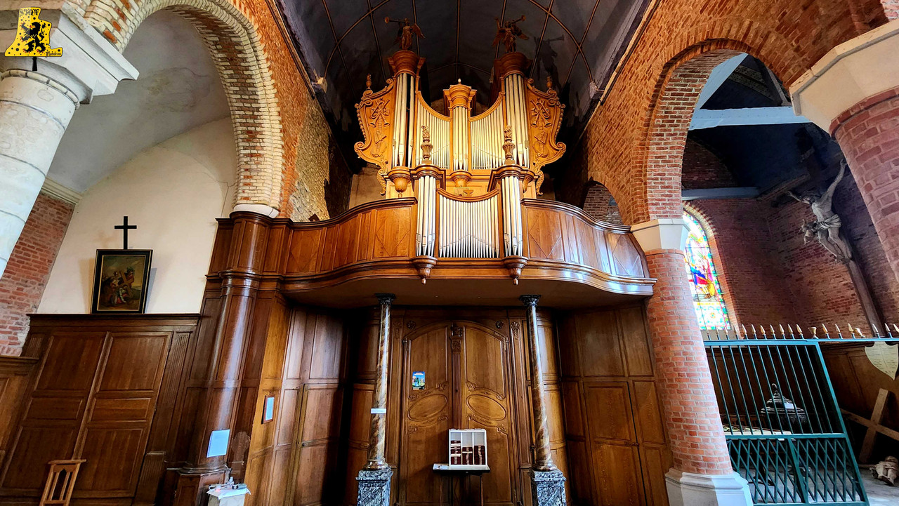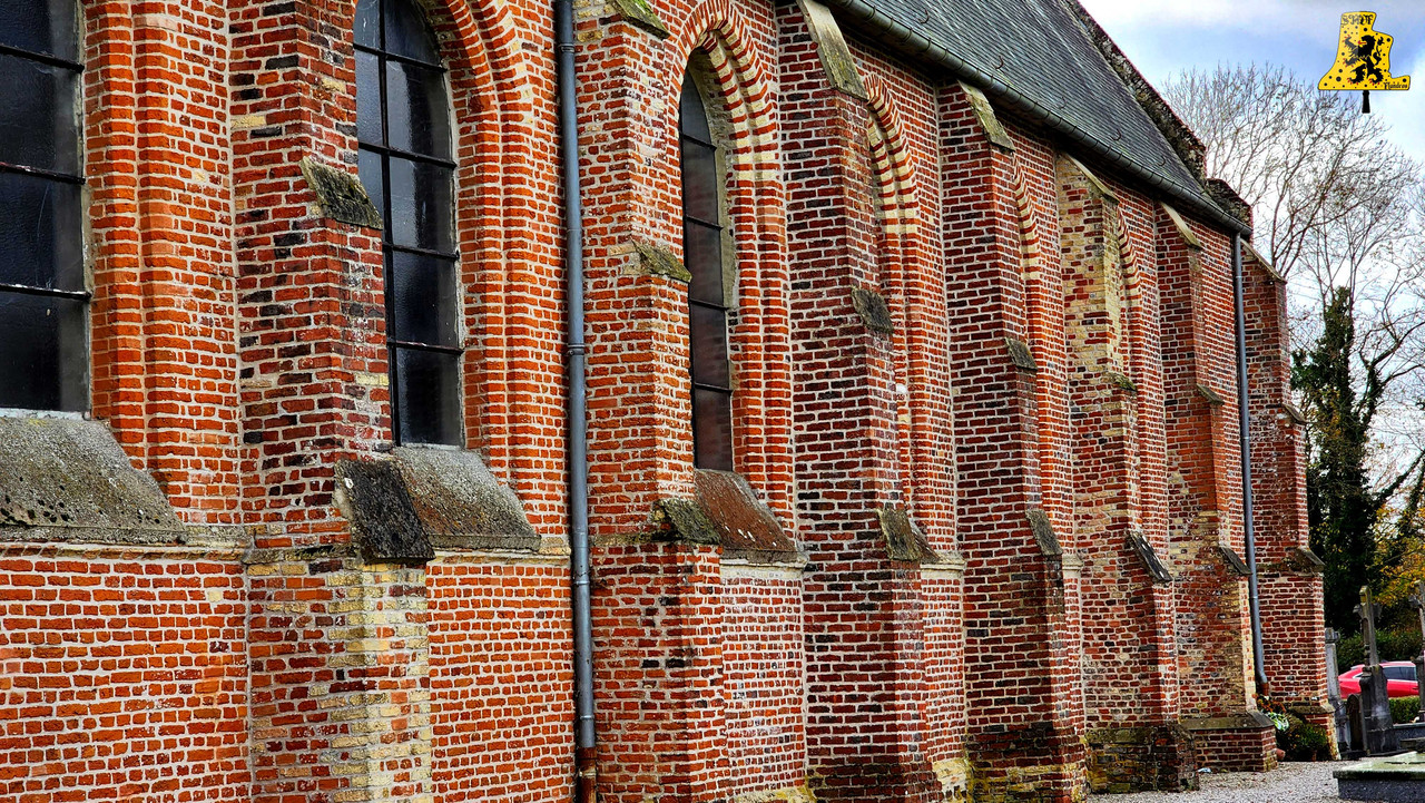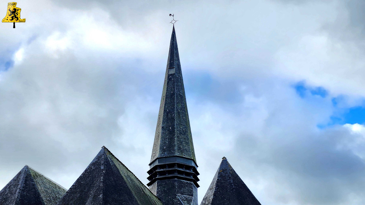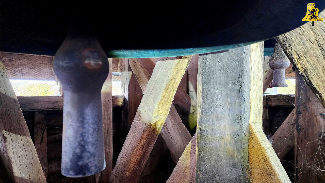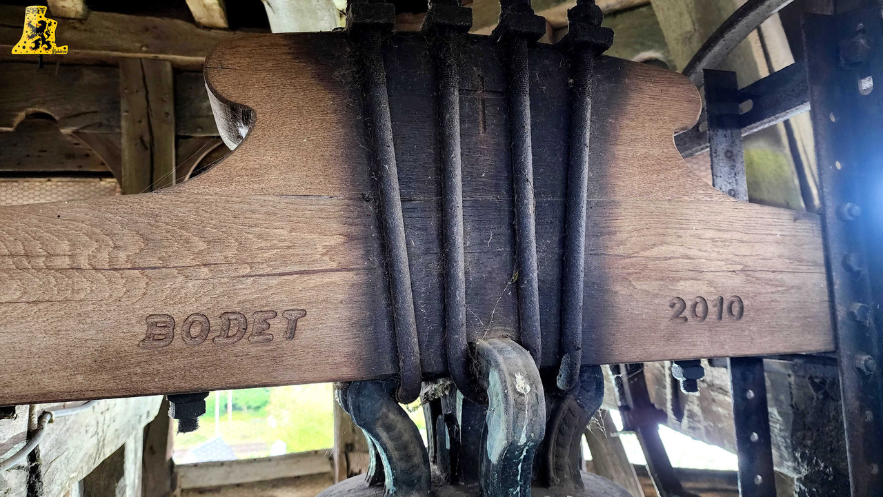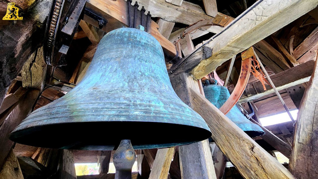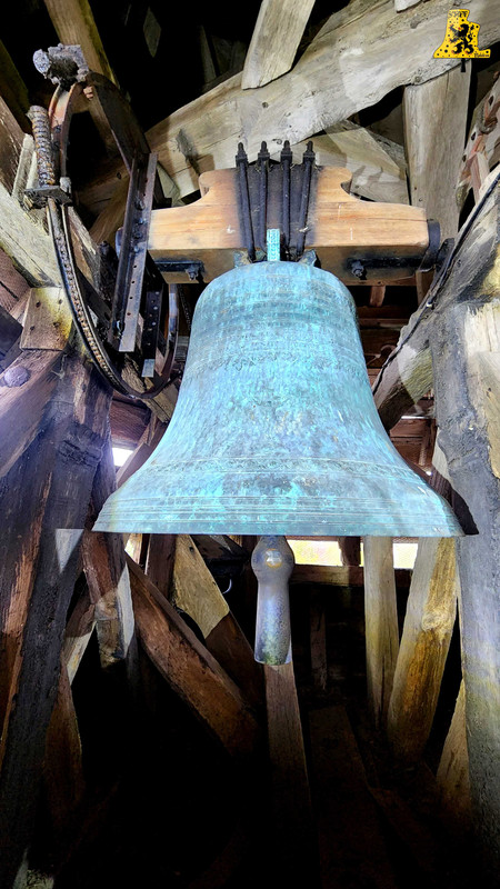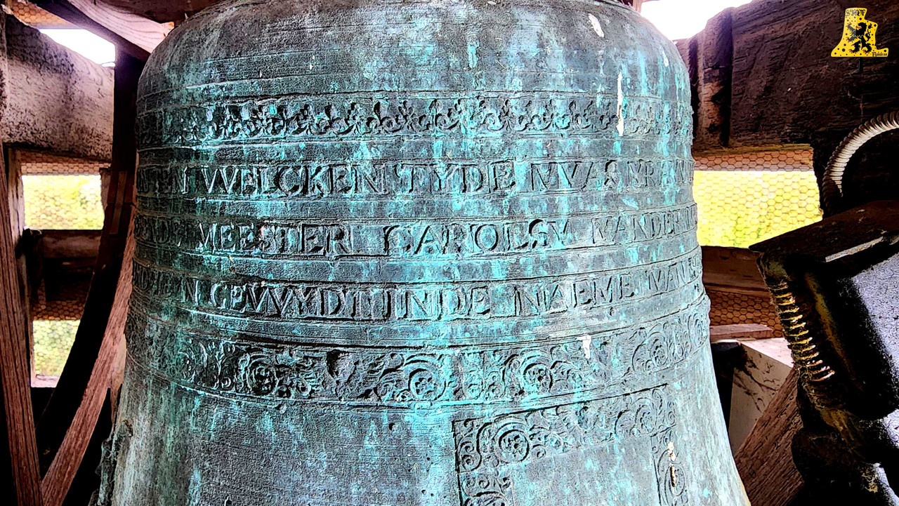 Pour cette nouvelle découverte, mon trajet change de l’ordinaire, en effet, je me rends non loin de ma commune! C‘est donc à Ochtezeele (« Oktezèle » pour la prononciation) que je vais avoir la chance de réaliser le reportage, sur le patrimoine campanaire de l’église. Avant toute chose, le village est très porté sur l’histoire Flamande, en effet, il est possible de voir un peu partout sur la commune, les panneaux bilingues Flamand/Français, ainsi que divers panneaux d’information, relatant l’histoire du village. L‘autre curiosité de la commune est la motte féodale, classée aux monuments historiques depuis les années 1 979, elle est située à environ 200m de l’église. L‘église est elle aussi classée. L‘extérieur côté entré semble modeste, mais une fois passé de l’autre côté (cimetière), c’est une toute autre église qui s’offre à nous. L‘église Hallekerque est une église flamande possédant 3 nefs, généralement, avec des plafonds en « coque de bateau retourné ». L‘intérieur de l’église est richement décoré, et pour tout vous dire, c’est l’un des plus beaux intérieurs que j’ai eu la chance de voir depuis le début de « Sonneries Hauts-De-France », rivalisant presque avec Oxelaëre! Voyez vous-même avec les photos présentes ci-dessous. L‘accès jusqu’aux cloches se fait par un premier escalier qui nous mène jusqu’à la toiture de l’église, de là, il nous faut sortir, et prendre la porte au pied du clocher. De là, il nous reste encore un petit effort à fournir, avant de toucher au but. Une fois arrivé aux cloches, nous avons la chance d’en observer deux. Je m’aperçois très vite que quelque chose cloche, la petite est dépourvue de moteur, en revanche, une corde descend tout le long, jusqu’à l’autel (J’ai fait la visite de l’intérieur après sonnerie). Nous sommes donc en présence d’une dite « Sonnerie Hybride »: Une cloche à la corde, une autre motorisée. J’ai déjà eu ce cas de figure à Montrond-Le-Château dans le Doubs, mais là, la cloche manuelle était très fortement ébréchée. C‘est un cas très rare, car outre Montrond et Ochtezeele, je n’en connais pas d’autre. La plus petite des cloches fut fondue en l’an 1 715, ce sont les fondeurs « E. & I. Du Cray, Belot & A. Bertan qui se sont vu confier la fonte de cette cloche, vraisemblablement sur place. Elle fut nommée Saint-Pierre (Sainte-Pieter), sa marraine est Issabelle Thérèse Denyse De Losegaat. Cette cloche possède la particularité d’avoir l’intégralité de ses textes en Flamand, il était donc assez compliqué pour moi, de réussir à obtenir quelques infos. Le diamètre de la cloche est de 74,4 cm, pour un poids de 250 kg. Sa grande sœur est beaucoup plus récente, puisqu’elle a été fondue en 1 901, dans les ateliers de la fonderie Wauthy à Douai. Nommée joliment « Marie Immaculée », elle possède pour diamètre, un bon 84 cm, son poids quant à lui, est de 335 kg. Son parrain est Auguste David d’Hazebrouck, et sa marraine, Dame Eugenie Isaert. Cette jolie cloche s’est vu offrir de nouveaux équipements en 2 010, lui permettant de sonner mieux qu’à l’origine. C‘est l’entreprise Bodet Campaniste, qui fut retenue pour la réalisation de ces travaux. Cependant, je regrette le faible angle de volée de cette dernière. Le son est plat et trop rapide. En tout cas, ça préservera la cloche durant des siècles.