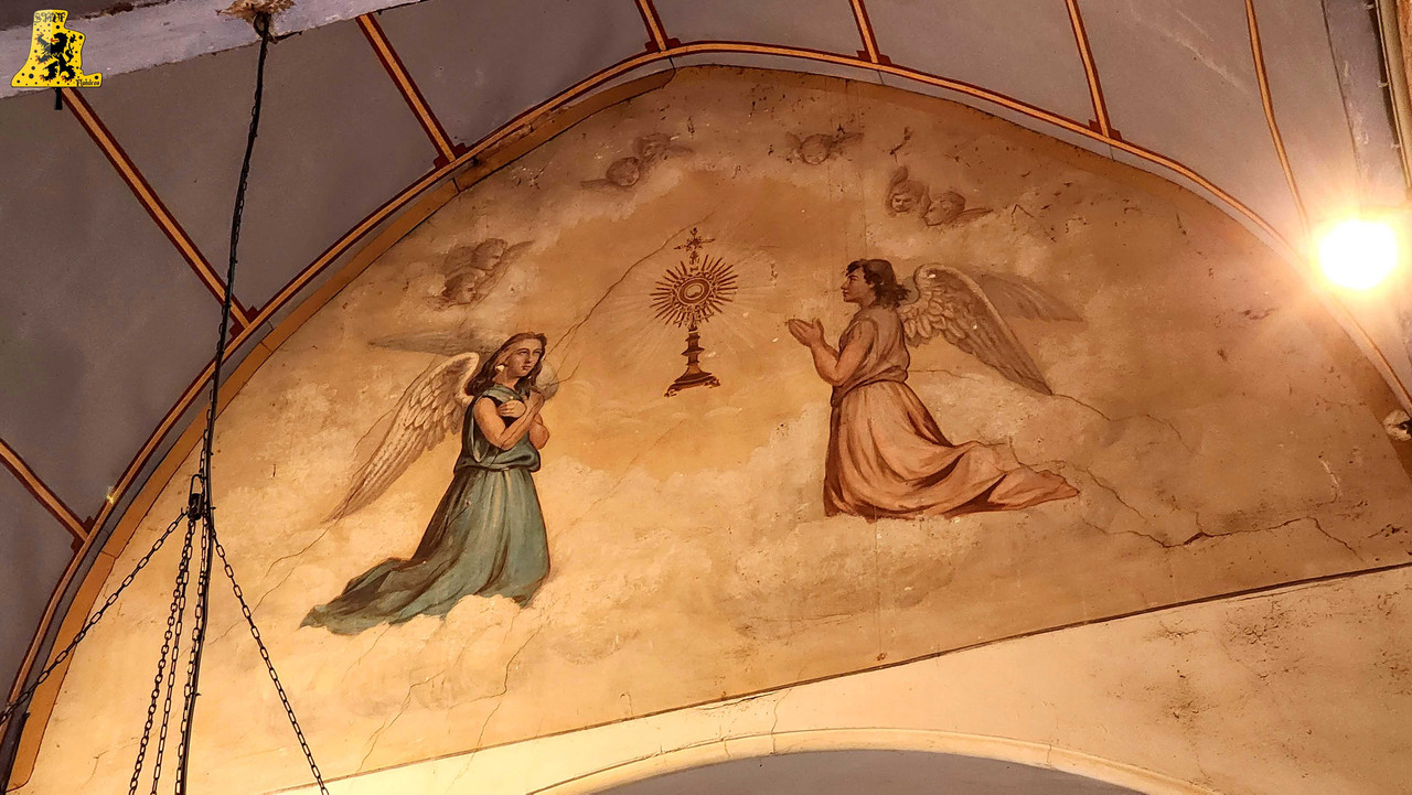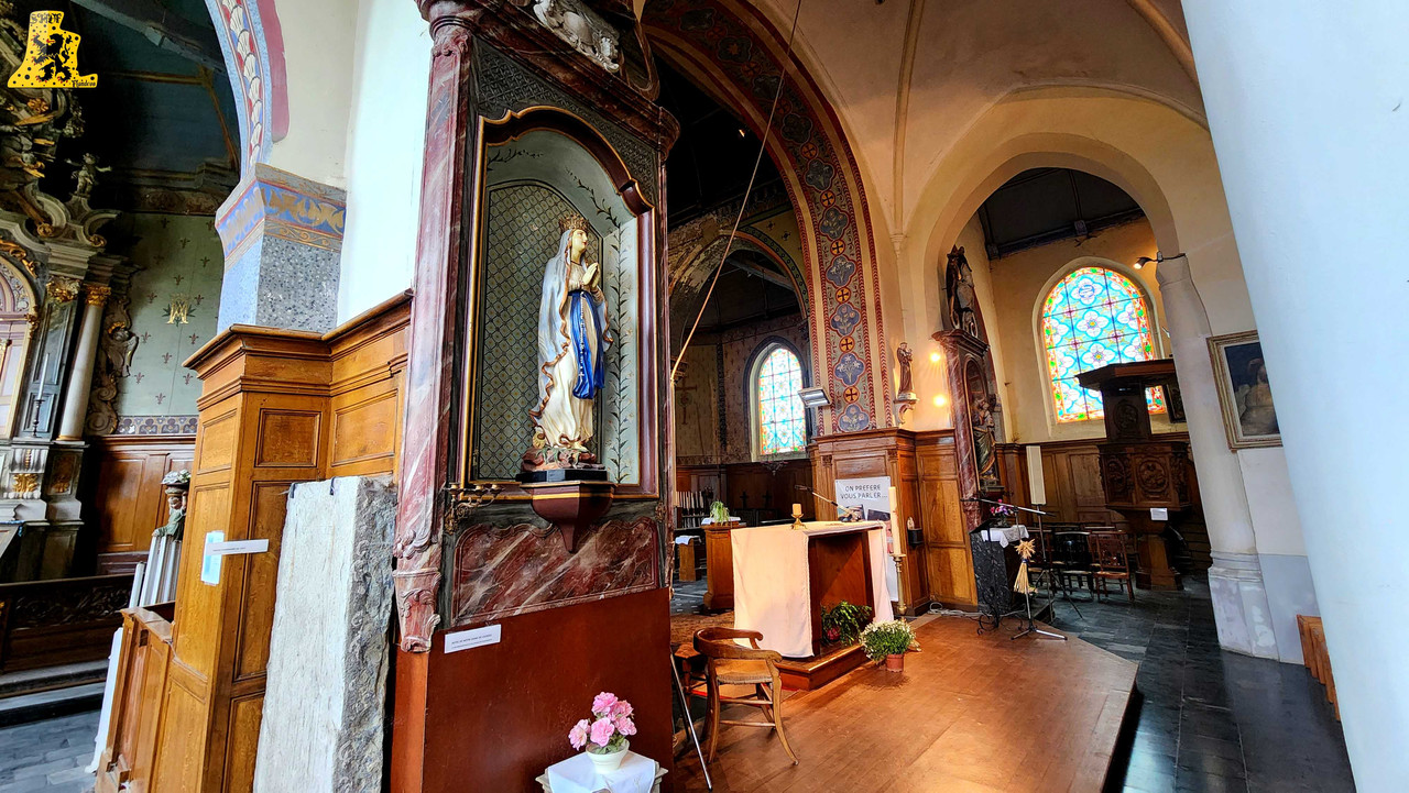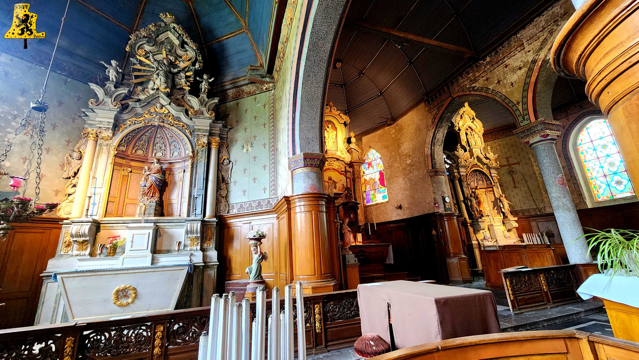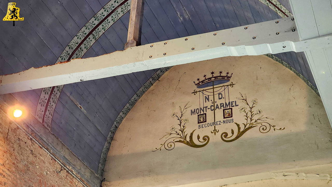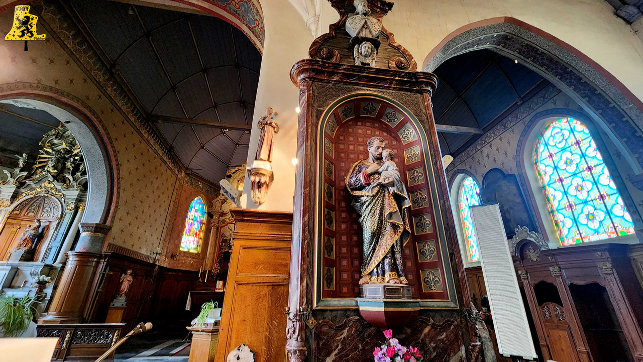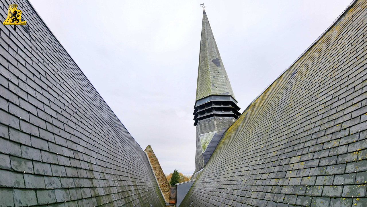Pour cette nouvelle découverte, mon trajet change de l’ordinaire, en effet, je me rends non loin de ma commune! C‘est donc à Ochtezeele (« Oktezèle » pour la prononciation) que je vais avoir la chance de réaliser le reportage, sur le patrimoine campanaire de l’église. Avant toute chose, le village est très porté sur l’histoire Flamande, en effet, il est possible de voir un peu partout sur la commune, les panneaux bilingues Flamand/Français, ainsi que divers panneaux d’information, relatant l’histoire du village. L‘autre curiosité de la commune est la motte féodale, classée aux monuments historiques depuis les années 1 979, elle est située à environ 200m de l’église. L‘église est elle aussi classée. L‘extérieur côté entré semble modeste, mais une fois passé de l’autre côté (cimetière), c’est une toute autre église qui s’offre à nous. L‘église Hallekerque est une église flamande possédant 3 nefs, généralement, avec des plafonds en « coque de bateau retourné ». L‘intérieur de l’église est richement décoré, et pour tout vous dire, c’est l’un des plus beaux intérieurs que j’ai eu la chance de voir depuis le début de « Sonneries Hauts-De-France », rivalisant presque avec Oxelaëre! Voyez vous-même avec les photos présentes ci-dessous. L‘accès jusqu’aux cloches se fait par un premier escalier qui nous mène jusqu’à la toiture de l’église, de là, il nous faut sortir, et prendre la porte au pied du clocher. De là, il nous reste encore un petit effort à fournir, avant de toucher au but. Une fois arrivé aux cloches, nous avons la chance d’en observer deux. Je m’aperçois très vite que quelque chose cloche, la petite est dépourvue de moteur, en revanche, une corde descend tout le long, jusqu’à l’autel (J’ai fait la visite de l’intérieur après sonnerie). Nous sommes donc en présence d’une dite « Sonnerie Hybride »: Une cloche à la corde, une autre motorisée. J’ai déjà eu ce cas de figure à Montrond-Le-Château dans le Doubs, mais là, la cloche manuelle était très fortement ébréchée. C‘est un cas très rare, car outre Montrond et Ochtezeele, je n’en connais pas d’autre. La plus petite des cloches fut fondue en l’an 1 715, ce sont les fondeurs « E. & I. Du Cray, Belot & A. Bertan qui se sont vu confier la fonte de cette cloche, vraisemblablement sur place. Elle fut nommée Saint-Pierre (Sainte-Pieter), sa marraine est Issabelle Thérèse Denyse De Losegaat. Cette cloche possède la particularité d’avoir l’intégralité de ses textes en Flamand, il était donc assez compliqué pour moi, de réussir à obtenir quelques infos. Le diamètre de la cloche est de 74,4 cm, pour un poids de 250 kg. Sa grande sœur est beaucoup plus récente, puisqu’elle a été fondue en 1 901, dans les ateliers de la fonderie Wauthy à Douai. Nommée joliment « Marie Immaculée », elle possède pour diamètre, un bon 84 cm, son poids quant à lui, est de 335 kg. Son parrain est Auguste David d’Hazebrouck, et sa marraine, Dame Eugenie Isaert. Cette jolie cloche s’est vu offrir de nouveaux équipements en 2 010, lui permettant de sonner mieux qu’à l’origine. C‘est l’entreprise Bodet Campaniste, qui fut retenue pour la réalisation de ces travaux. Cependant, je regrette le faible angle de volée de cette dernière. Le son est plat et trop rapide. En tout cas, ça préservera la cloche durant des siècles.