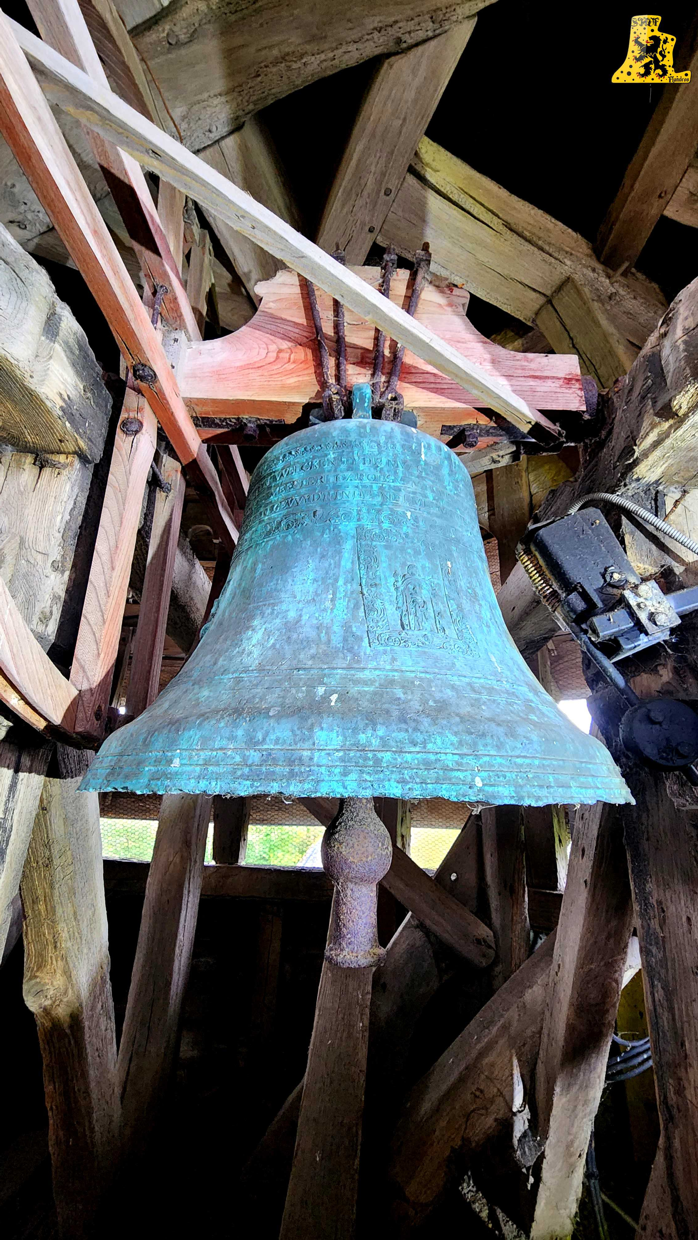 Pour cette nouvelle découverte, mon trajet change de l’ordinaire, en effet, je me rends non loin de ma commune! C‘est donc à Ochtezeele (« Oktezèle » pour la prononciation) que je vais avoir la chance de réaliser le reportage, sur le patrimoine campanaire de l’église. Avant toute chose, le village est très porté sur l’histoire Flamande, en effet, il est possible de voir un peu partout sur la commune, les panneaux bilingues Flamand/Français, ainsi que divers panneaux d’information, relatant l’histoire du village. L‘autre curiosité de la commune est la motte féodale, classée aux monuments historiques depuis les années 1 979, elle est située à environ 200m de l’église. L‘église est elle aussi classée. L‘extérieur côté entré semble modeste, mais une fois passé de l’autre côté (cimetière), c’est une toute autre église qui s’offre à nous. L‘église Hallekerque est une église flamande possédant 3 nefs, généralement, avec des plafonds en « coque de bateau retourné ». L‘intérieur de l’église est richement décoré, et pour tout vous dire, c’est l’un des plus beaux intérieurs que j’ai eu la chance de voir depuis le début de « Sonneries Hauts-De-France », rivalisant presque avec Oxelaëre! Voyez vous-même avec les photos présentes ci-dessous. L‘accès jusqu’aux cloches se fait par un premier escalier qui nous mène jusqu’à la toiture de l’église, de là, il nous faut sortir, et prendre la porte au pied du clocher. De là, il nous reste encore un petit effort à fournir, avant de toucher au but. Une fois arrivé aux cloches, nous avons la chance d’en observer deux. Je m’aperçois très vite que quelque chose cloche, la petite est dépourvue de moteur, en revanche, une corde descend tout le long, jusqu’à l’autel (J’ai fait la visite de l’intérieur après sonnerie). Nous sommes donc en présence d’une dite « Sonnerie Hybride »: Une cloche à la corde, une autre motorisée. J’ai déjà eu ce cas de figure à Montrond-Le-Château dans le Doubs, mais là, la cloche manuelle était très fortement ébréchée. C‘est un cas très rare, car outre Montrond et Ochtezeele, je n’en connais pas d’autre. La plus petite des cloches fut fondue en l’an 1 715, ce sont les fondeurs « E. & I. Du Cray, Belot & A. Bertan qui se sont vu confier la fonte de cette cloche, vraisemblablement sur place. Elle fut nommée Saint-Pierre (Sainte-Pieter), sa marraine est Issabelle Thérèse Denyse De Losegaat. Cette cloche possède la particularité d’avoir l’intégralité de ses textes en Flamand, il était donc assez compliqué pour moi, de réussir à obtenir quelques infos. Le diamètre de la cloche est de 74,4 cm, pour un poids de 250 kg. Sa grande sœur est beaucoup plus récente, puisqu’elle a été fondue en 1 901, dans les ateliers de la fonderie Wauthy à Douai. Nommée joliment « Marie Immaculée », elle possède pour diamètre, un bon 84 cm, son poids quant à lui, est de 335 kg. Son parrain est Auguste David d’Hazebrouck, et sa marraine, Dame Eugenie Isaert. Cette jolie cloche s’est vu offrir de nouveaux équipements en 2 010, lui permettant de sonner mieux qu’à l’origine. C‘est l’entreprise Bodet Campaniste, qui fut retenue pour la réalisation de ces travaux. Cependant, je regrette le faible angle de volée de cette dernière. Le son est plat et trop rapide. En tout cas, ça préservera la cloche durant des siècles.