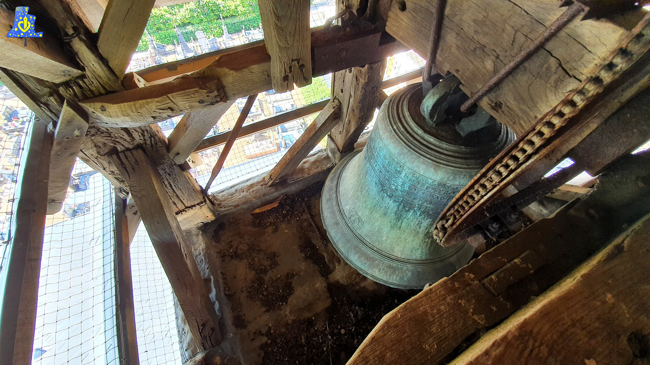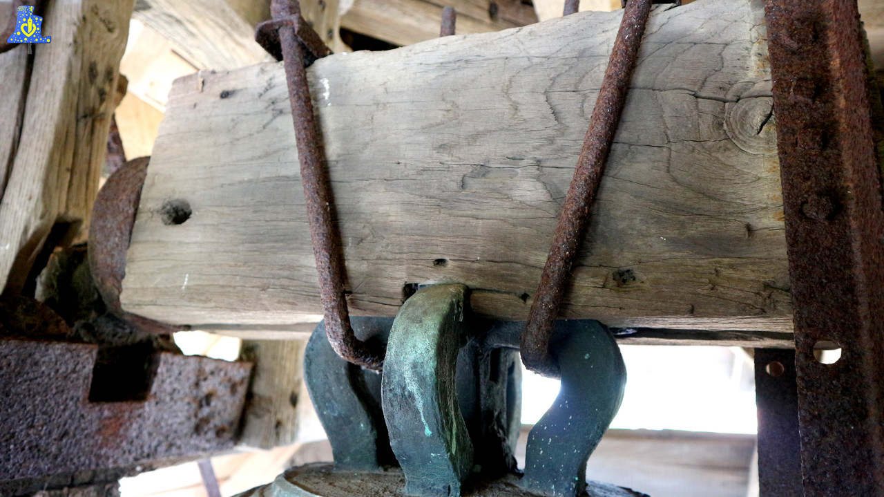 J‘ai la chance de vous faire découvrir, aujourd’hui, la cloche d’un petit village situé au pied du mont de Cassel. Il s’agit d’Oxelaëre, l’un des plus beaux villages de Flandre. La charmante petite église du village, sous le vocable de Saint-Martin, possède en son sein, de superbes décors, ainsi qu’un riche patrimoine mobilier, qui mérite une petite mise en lumière. Mr le maire a fait beaucoup pour son église, il y a quelques années, toute la toiture fut réhabilitée, le coq quant à lui, fut changé. Le projet de réhabilitation intérieure (Peintures) est également en projet. Pour accéder à la seule cloche de l’édifice, il nous faut emprunter une échelle, que Mr le maire a pris soin de me la fournir, et pour ça, je l’en remercie très chaleureusement, car sans cela , il nous ait impossible d’accéder au clocher. Puis, il nous faut user de nos bras, afin de se hisser jusqu’au cocher. Une fois arrivé au clocher, la chose qui me frappe est le manque de place, en effet, je crois qu’en 5 ans de découvertes, c’est le clocher le plus étroit que j’ai pu faire, il faut donc se servir de son corps pour parvenir à passer entre les abats son, et le beffroi en bois. La cloche nommée Saint-Martin, dont les équipements sont tous hors-service, est assez ancienne pour avoir survécu à la révolution. Elle est datée de l’an 1 723, et fut fondue par un certain Antoine Bernard, c’est le fondeur qui a fondu le Grand’Bourdon de Bruges, en Belgique, dont le poids dépasse les 4 200 kg. Mais ici, le poids est bien moindre, car le poids estimé de cette cloche dépasse de peu les 200 kg. Son diamètre lui, est de 70 cm, pour une note en Do#4. Comme vous pouvez le constater dans cette petite vidéo, les divers équipements de cette belle cloche sont défectueux, le moteur est en panne, les chaînes ne sont plus entretenues, le battant n’est plus adapté, et la bélière, est distendue. C‘est d’ailleurs pour ça que le battant frappe trop bas dans la cloche, provocant un son quelque peu étrange. Mais n’ayez crainte, encore une fois, sous l’impulsion de Mr Dieusaert, la clocher devrait être remise en état sous peu. Il est également intéressant à noter, la présence d’une cloche « Fantôme », c’est a dire, un emplacement vide, avec les traces de la présence d’une cloche, descendue sûrement pendant la révolution.