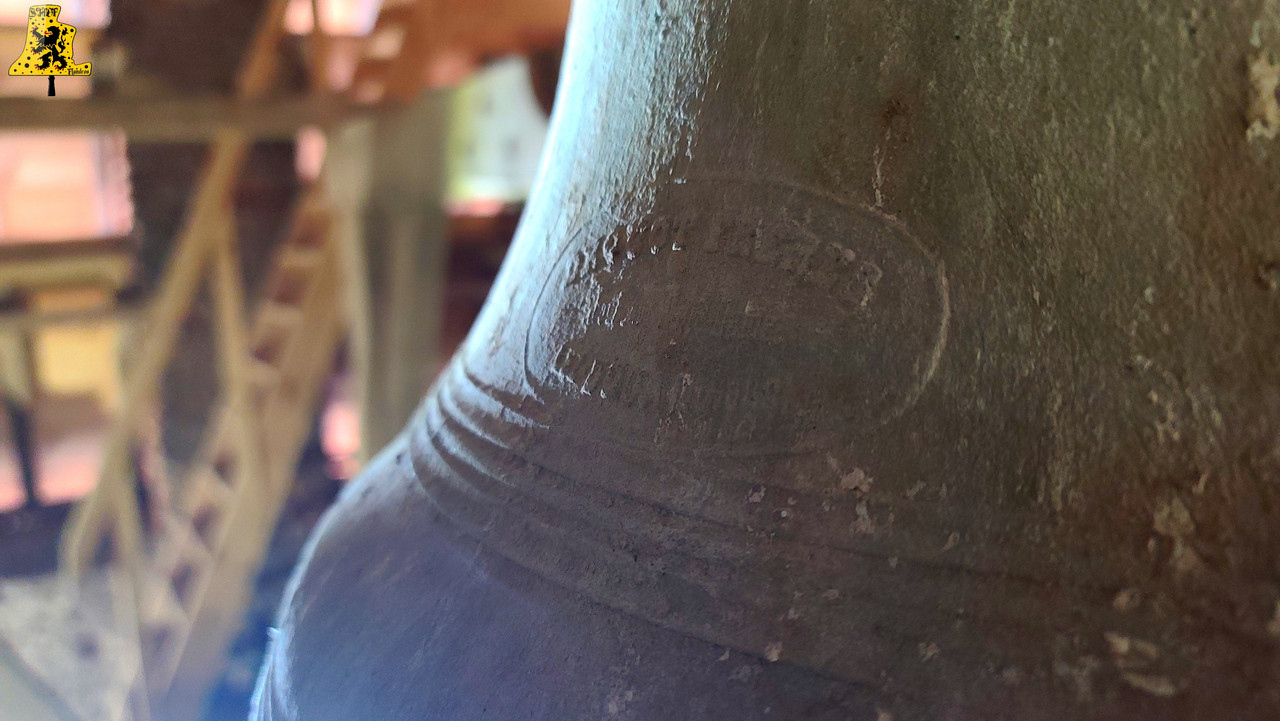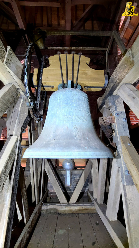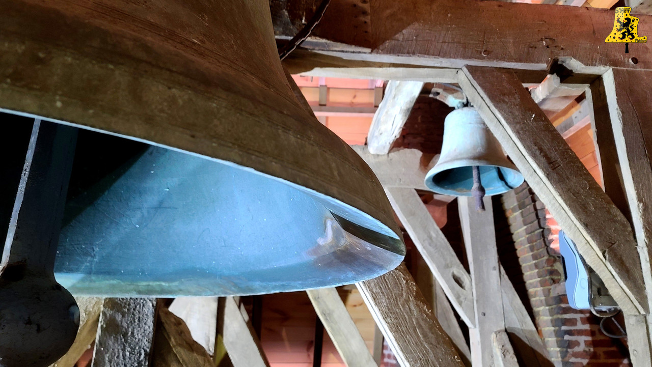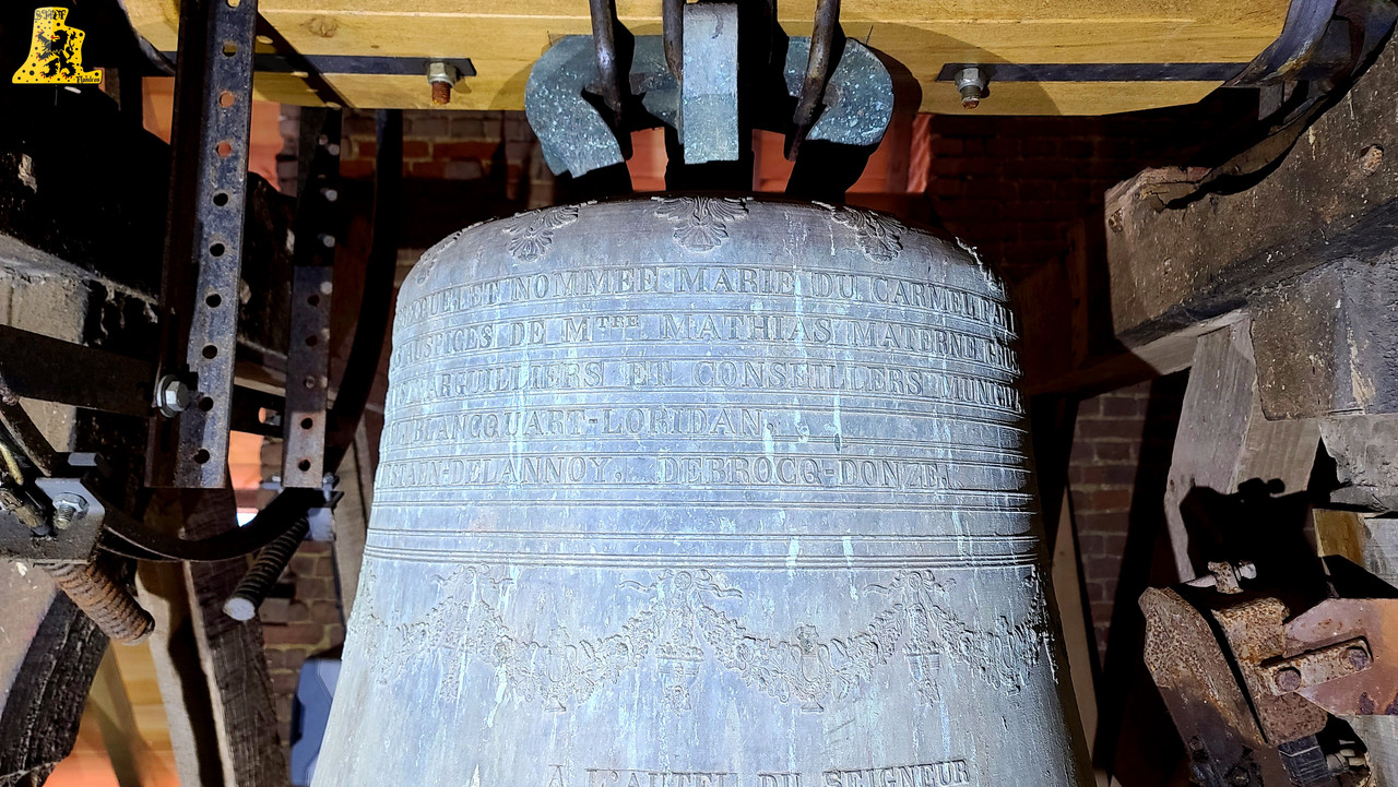 Je me rends pour cette nouvelle découverte campanaire, dans la très jolie petite commune de Pradelles, située entre Méteren et Hazebrouck. Pradelles a signée la charte « Oui Au Flamand », et a vu fleurir de nouveaux panneaux d’entrée de village au nom de Pradeels (Nom flamand de la commune), et quelques noms de rues traduites en Flamand. L‘église du village est assez atypique vis-à-vis de son histoire. La tour du clocher du 16e siècle est la partie la plus ancienne de l’église, cette tour était à la base, une tour de guet, comme ce fut le cas pour le village voisin de Borre. La nef a été ajoutée bien plus tardivement. La montée jusqu’au clocher se fait tout simplement, il nous faut emprunter une petite porte dérobée qui nous mène à un escalier en colimaçon fait de briques du nord, je trouve ça très joli! Deux paliers nous permettent de faire une pause, et d’observer une horloge mécanique hors-service, et une ancienne cheminée de l’appartement du guetteur! C‘est une petite partie d’histoire que j’adore découvrir. Les cloches se trouvent perchées à 20 mètres du sol. Elles sont au nombre de deux, posées sur un beffroi en bois daté de 1 789. Il est donc intéressant d’observer les traces d’anciennes cloches aujourd’hui disparues. Il y eut au plus fort 3 cloches simultanément, comme en témoignent les trous de passage de corde. Le clocher compte cependant, 3 cloches « Fantômes » (anciens emplacements de cloches visibles), deux d’entres elles sont sur la même trame, mais étaient espacées de seulement 15 cm environ, donc impossible que ses deux cloches étaient là à la même période. La troisième cloche fantôme se trouve sur la trame du milieu. Je n’ai cependant aucune information sur les anciennes cloches, si ce n’est sur la taille de la plus petite, qui semblait être du même acabit que la petite encore en place. De nos jours, il n’y a que deux cloches, et seule la plus grande, nous donne encore de la voix régulièrement, pour les heures, et les volées (Angélus, offices). La plus petite des cloches est aussi la plus mystérieuse, car outre la marque de son créateur, Drouot Frères, la cloche ne comporte aucune inscription, peut-être était-ce l’ancienne cloche de l’école du village? Je ne peux vous répondre avec certitude, mais je pense que cette piste est plausible. Cette cloche que l’on nomme « Cloches des vêpres », pèse une cinquantaine de kilos, son diamètre au plus large est quant à lui, de 45 cm. C‘est une très petite cloche par rapport à sa grande sœur. Lors de la sonnerie, j’ai pu la sonner délicatement, j’ai pris le temps d’effectuer un teste pour observer son comportement, car cette petite dame de bronze n’a pas sonnée depuis des décennies, les équipements ne sont pas au mieux, mais tout s’est très bien passée! La plus grosse des cloches nous vient, tout comme sa petite sœur, de la fonderie de Douai, Paul Drouot la fonda en 1 863. Elle fut bénite par « Mtre » Markant, doyen de Morbecque, sous le nom de « Marie Du Carmel ». Sur le bas de sa robe, nous pouvons y lire « A l’autel du seigneur, j’appelle le chrétien, c’est la voie du bonheur, la source de tout bien », avec juste en dessous, une vierge à l’enfant. En revanche, je n’ai trouvé ni parrain, ni marraine. Les mensurations de cette cloche sont les suivantes: 108 cm de diamètre, pour un poids affichant 720 kg. Il est intéressant à noter que la commune a investie fortement pour l’entretien de cette cloche, notamment avec l’installation d’un tout nouveau joug, de chaine et d’un battant, qui lui, est un peu plus vieux. Ces deux cloches forment un motif de sonnerie que je qualifie de « Flamand », car elle se compose de deux cloches, la plus grande est généralement dix fois plus lourde que la plus petite. Enfin pour clore ce reportage, ces deux cloches sonnent perpendiculairement entre elles, chose assez rare pour être signalée. Sur la vidéo, il s’agit d’une sonnerie montée, j’ai fait sonner les cloches une par une, pour ensuite réalisé un montage en superposant les vidéos. C‘est pour ne prendre aucun risque de faire tomber la petite cloche durant la volée de la grande, on est jamais trop prudent :).