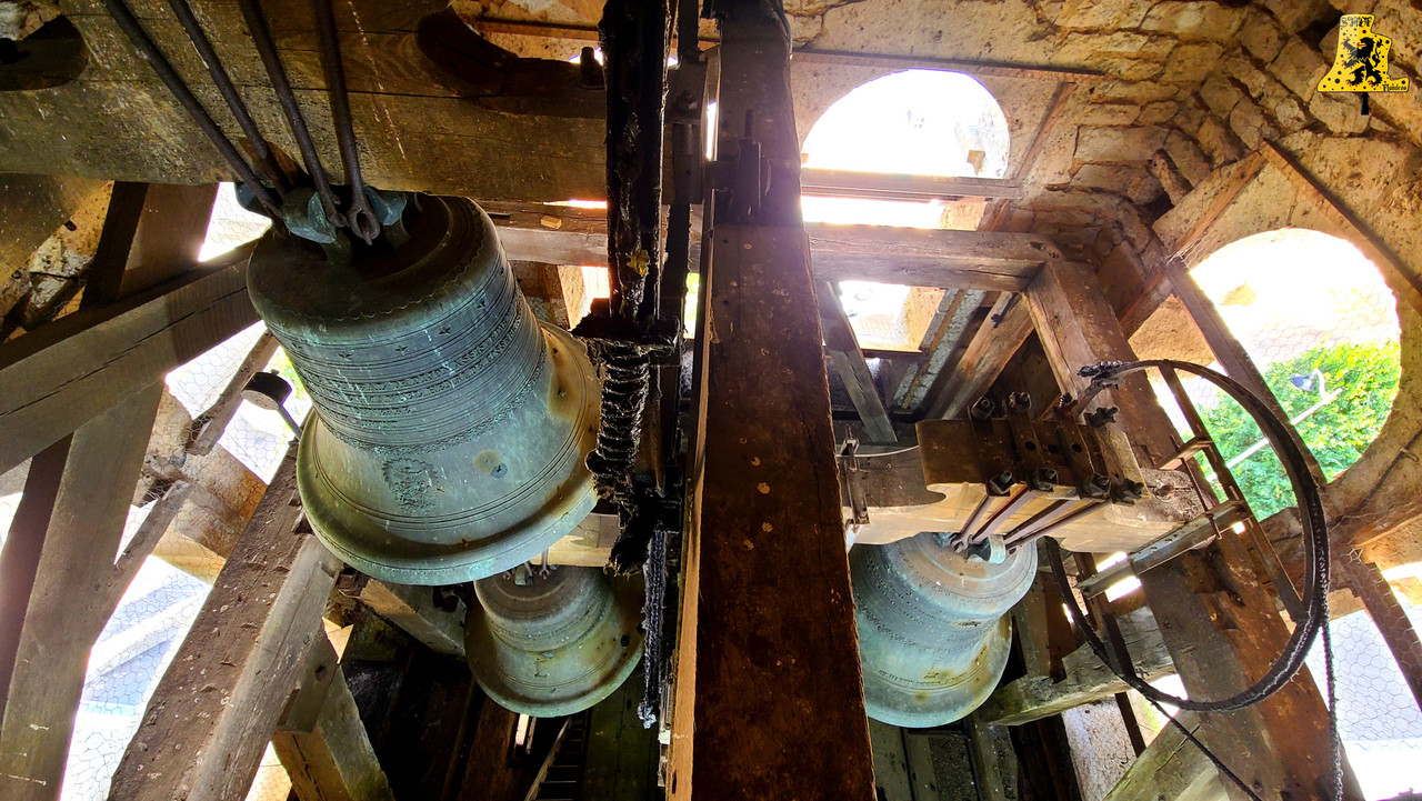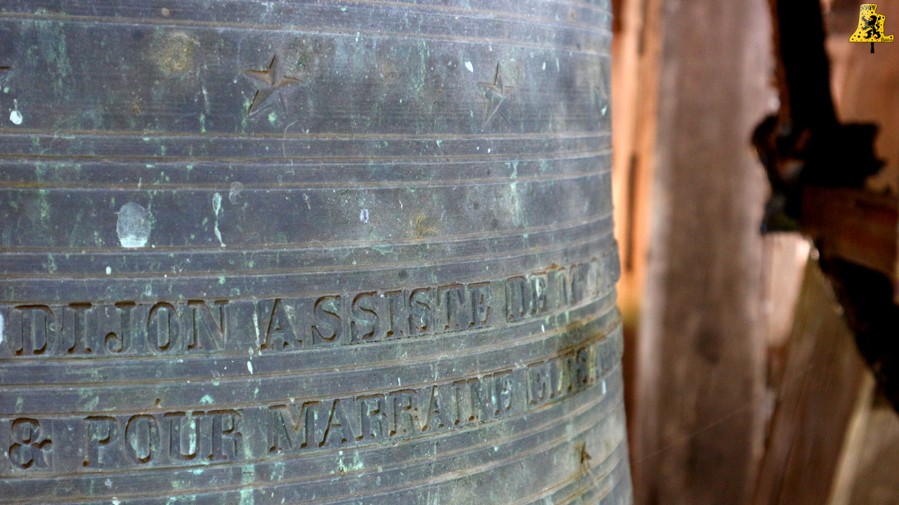 Pour ce dernier article destiné à la promotion des cloches du Châtillonnais, dont la visite a été encore une fois, organisée par Yannick, nous nous sommes rendus à Prusly, une charmante petite commune à l’est de Châtillon-Sur-Seine. La commune, bien que petite, possède une église à la richesse plutôt bien fournie. Bien que notre démarche soit la mise en valeur des cloches, Mr le maire nous attire que deux des vitraux de l’église. En effet, ceux-ci sont directement liés aux cloches, puisqu’ils ont été livrée approximativement à la même période que la livraison des cloches. Nous pouvons y lire, au pieux de ces vitraux, « Bénédiction des cloches, Juillet 1894 ». La montée jusqu’aux cloches se fait par dehors, il nous faudra gravir environ 15 mètres pour parvenir jusqu’à elles. L‘église possède une sonnerie assez étoffée, avec trois dames de bronze. Il est intéressant à noter, qu’une mélodie peut-être jouer sur celles-ci, dont j’ai eu la chance d’en faire un enregistrement de 4 minutes, mais ayant eu un souci de carte SD, j’ai malheureusement tout perdu.. Les trois cloches furent fondues à Nancy, en 1 894, par le fondeur C. Martin. La plus grande des cloches, nommé Fernande-Laurence, pèse environ 595 kg, et a comme diamètre 105 cm. La cloche moyenne quant à elle, se nomme assez étrangement « Basile-Luce », elle pèse 405 kg, et mesure 90 cm de diamètre. Enfin, pour la plus petite des cloches, elle s’appelle Henriette-Catherine. Son poids est d’un peu moins de 300 kg, pour un diamètre tournant autour des 80 cm. C‘est une très belle sonnerie joyeuse, avec un accord en Fa, Sol et La. Lors de la volée, une petite erreur de manipulation a été commise au boitier, d’où les marteaux des deux petites cloches fonctionnant alors que les cloches sont en pleine volée. Heureusement, sans conséquence sur les équipements. Voilà qui vient clore ce très bon week-end en terres chatillonnaises, riche en découverte. Encore une fois, toutes ces découvertes ont été possibles grâce à Yannick, donc j’en profite pour le remercier encore une fois! Merci Yannick!