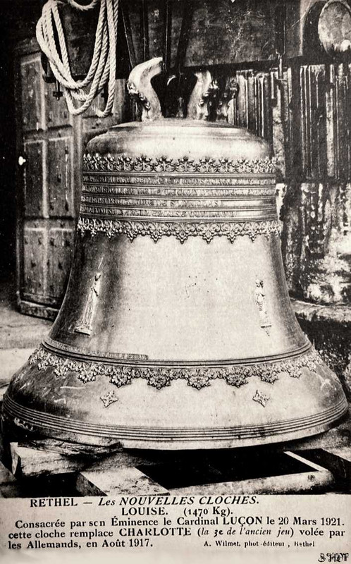La décision de faire fondre de cloches fut prise. L‘intégralité de ces 5 nouvelles cloches furent fondues par le fondeur Parisiens Armand Blanchet 1 921. Une petite dernière a été ajoutée plus tardivement dans la sonnerie, puisqu’elle ne figure pas sur l’image de l’intégralité des cloches exposées avant la montée au clocher, mais est bien présente dans les relevés de l’époque. Toujours dans l’optique d’avoir une grosse sonnerie, les notes se révèlent alors globalement un peu plus hautes, avec des notes suivantes: Sib2, Do3, Ré3, Mib3 Fa3 et le Sol3, ça devait être magnifique à écouter. La plus grosse, Anna, pesait encore une fois dans les 3 tonnes (3 120 kg), la deuxième de 2 140 kg, porta comme nom Berthe. La troisième quant à elle, nommée Louise, pesa 1 470 kg. Aimée, La quatrième cloche pesait 1 200kg, la cinquième de 800 kg se nomma Pauline. Et enfin, la petite dernière d’un poids de 600kg, répondait au nom de Marie-Agnès. Malheureusement, les cloches furent emportées avec les bombardements de 1 940. De cette sonnerie, ne subsistes que quelques photos.