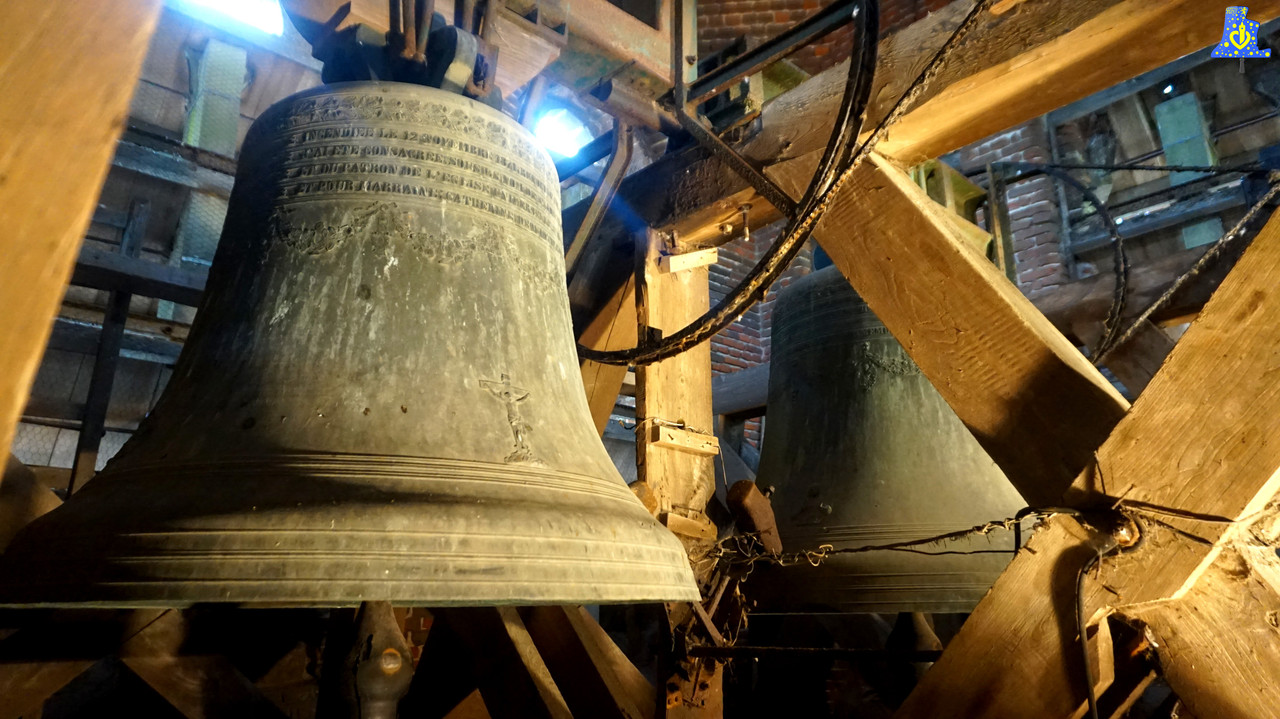 C‘est à Sainte-Marie-Cappel, dans cette jolie église sous le vocable de Notre-Dame, que je m’apprête à vous faire découvrir les cloches. C‘est après une longue montée, ponctuée d’un petit arrêt afin d’admirer l’ancienne horloge, que nous pouvons admirer deux cloches. D‘après l’ouvrage sobrement appelé « Sainte-Marie-Cappel », de Patrice DENEUX, a l’origine, il y avait trois cloches, celles-ci ont été malheureusement détruites durant l’incendie de l’église le 12 Novembre 1 871. Il fallut attendre 5 ans, avant que l’église retrouve sa voix, tout du moins une bonne partie, car de trois cloches, nous passons aujourd’hui à deux. Les cloches actuelles sont placées sur un beffroi assez imposant, fait de bois. Les divers équipements sont entretenus de façon régulière, et avec intention, comme par exemple, le remplacement d’un électro-tinteur hors-service. Les moteurs sont récents, ainsi que les battants, d’ailleurs, sur ces derniers, nous pouvons voir l’année de fabrication gravée (2 000). Enfin, au niveau des graissages, je dois dire que c’est parfait! Parlons un peu plus des cloches elles-mêmes. La grosse est dédiée au saint-patron de l’église, elle porte donc le nom de « Sainte-Marie », elle fut refondue en 1 876 par Paul Drouot, fondeur dont les ateliers étaient basés à Douai. Elle pèse pas moins de 1 200 kg, et chante le Ré du 3e octave. Enfin, son diamètre est d’un peu moins de 130 cm. La « Ptiote », également du même fondeur et de même époque, porte le nom de « Saint-Joseph », elle est bien plus petite et plus légère, puisqu’elle ne pèse « que » 610 kg. Son diamètre avoine quant à lui, les 100 cm. Enfin, elle répond à sa grande sœur d’un assez beau fa dièse du 3e octave. La cloche est montée en mode de lancée dit « Super-Lancé », c’est-à-dire que les anses sont bien plus bas que l’axe des roulements à billes (ou paliers pour certains). Avant d’avoir un joug (ou Mouton) de type « IPN » (Métallique), elle possédait un joug en Bois, seule la partie servant à rabaisser la cloche à été conservée, c’est assez étrange a voir. Vous trouverez les inscriptions fournies par la mairie sous la rapide présentation des cloches avec leurs photos!