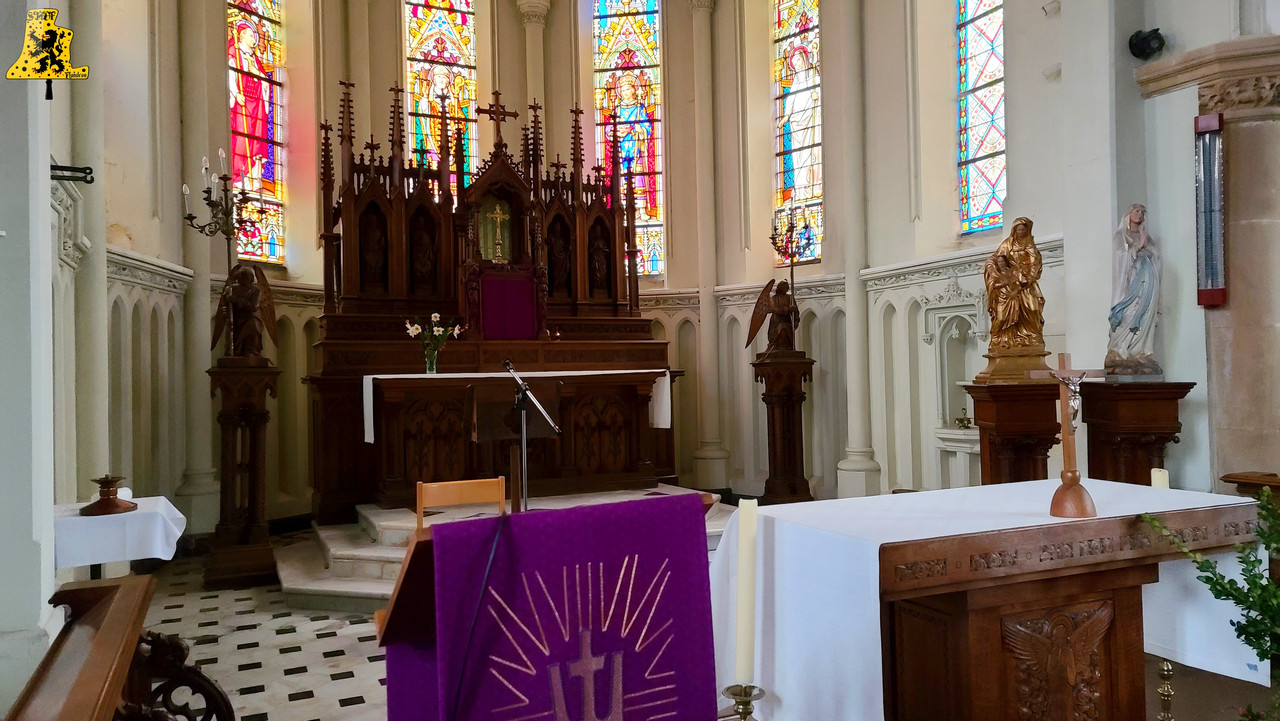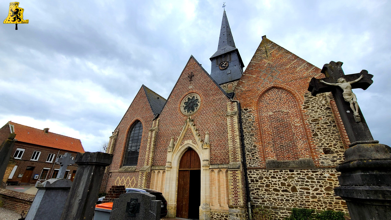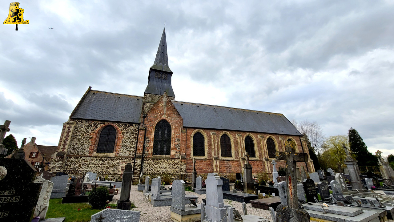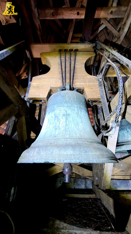 Bienvenue à Terdeghem, charmant village de quelque 500 âmes, profitant d’un calme des plus ravissants des Flandres. Au centre de ce beau village, trône l’église gothique de type Halkerque, dont les premières pierres sont du XVIe siècle. Les églises Halkerque, typiques des Flandres, se démarquent de par ses trois nefs, il se peut que certaines églises n’en possèdent que deux. Dans le petit clocher, située au cœur des nefs, se trouve, à ma grande surprise, trois cloches, celles-ci sont de plus, dans un état assez remarquable. Les cloches ont subi en 2004, une belle restauration. Tous leurs système ont été changée, ce qui comprend les battants, roues de volée, chaînes, ressort, ferrures et leurs jougs. Ces trois cloches ont un joug relativement conséquent, surtout pour la Grand’cloche, de ce fait, l’effort sur la structure du clocher, et du beffroi est bien moindre qu’une cloche sonnant de façon « classique ». Ce genre de joug agit comme un contrepoids, ralentissant ainsi le rythme d’oscillation de la cloche. Ces trois cloches sont toutes issues de la même fonderie, mais nous n’avons cependant, aucune mention sur les inscriptions. Les seules indications qui nous ont été données, sont qu’elles ont été fondues à Péronne, dans la Somme, en l’année 1 821. Leurs inscriptions sont assez compliquées à déchiffrer, mais j’ai eu la chance de trouver les noms de ces cloches. La plus grosse des cloches se prénomme « Marie-Vierge », ne pèse pas moins de 640 kg, pour un diamètre de 105 cm environ. Marie-Cléopha quant à elle, pèse 470 kg, pour un diamètre un peu en dessous des 95 cm. Pour finir, Marie-Salomé possède un diamètre de 345 kg, avec un diamètre de 85 cm. Les notes sont les suivantes: Fa#3, Sol#3 et le La#3. Nous avons là l’accord du Pater-Noster. Les cloches possèdent de fins décors: La croix du Christ, magnifiquement détaillée, entourée de 8 feuilles aux détails assez saisissants, le tout surplombé par les inscriptions, prises en sandwich entre deux belles frises.