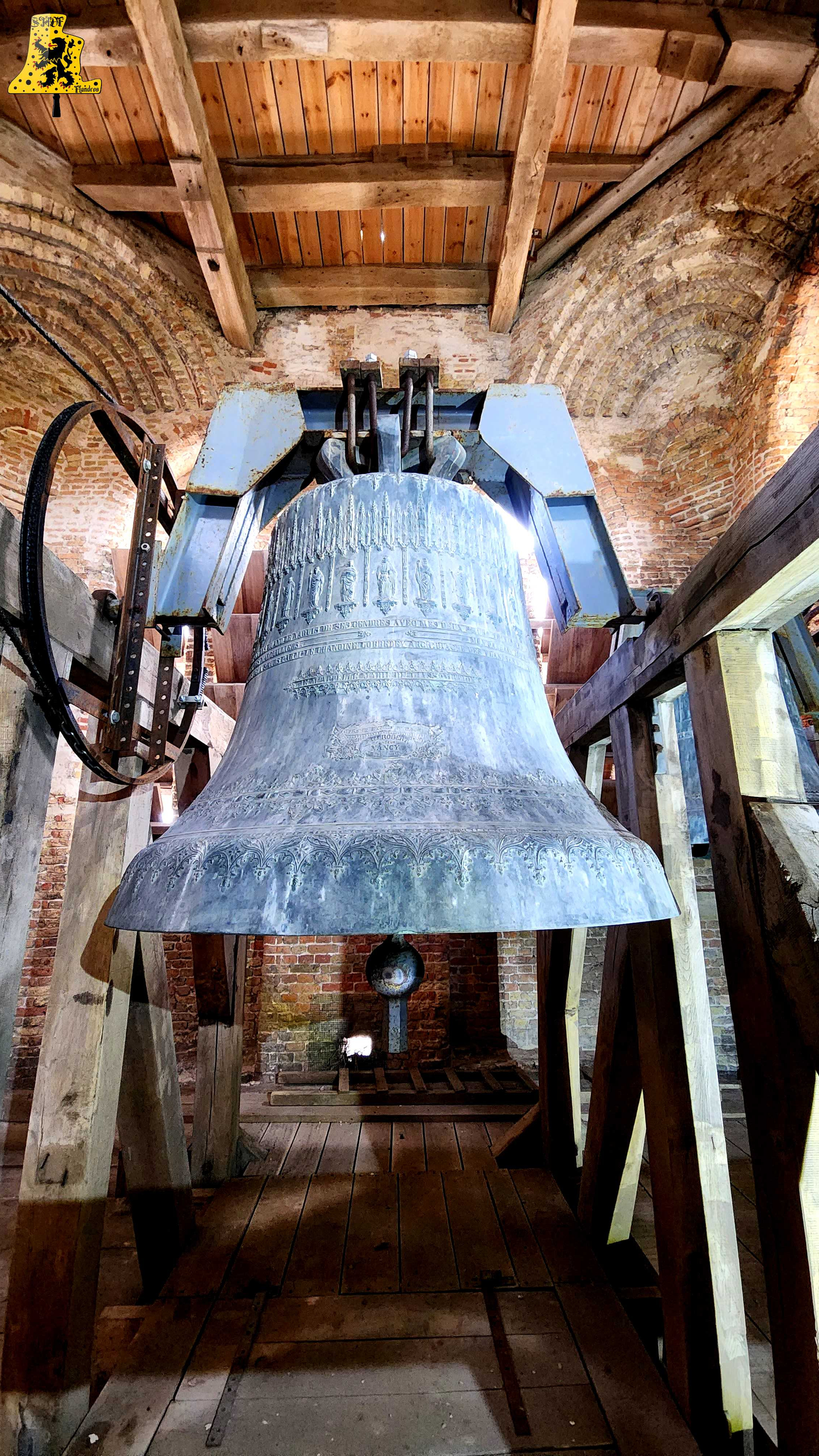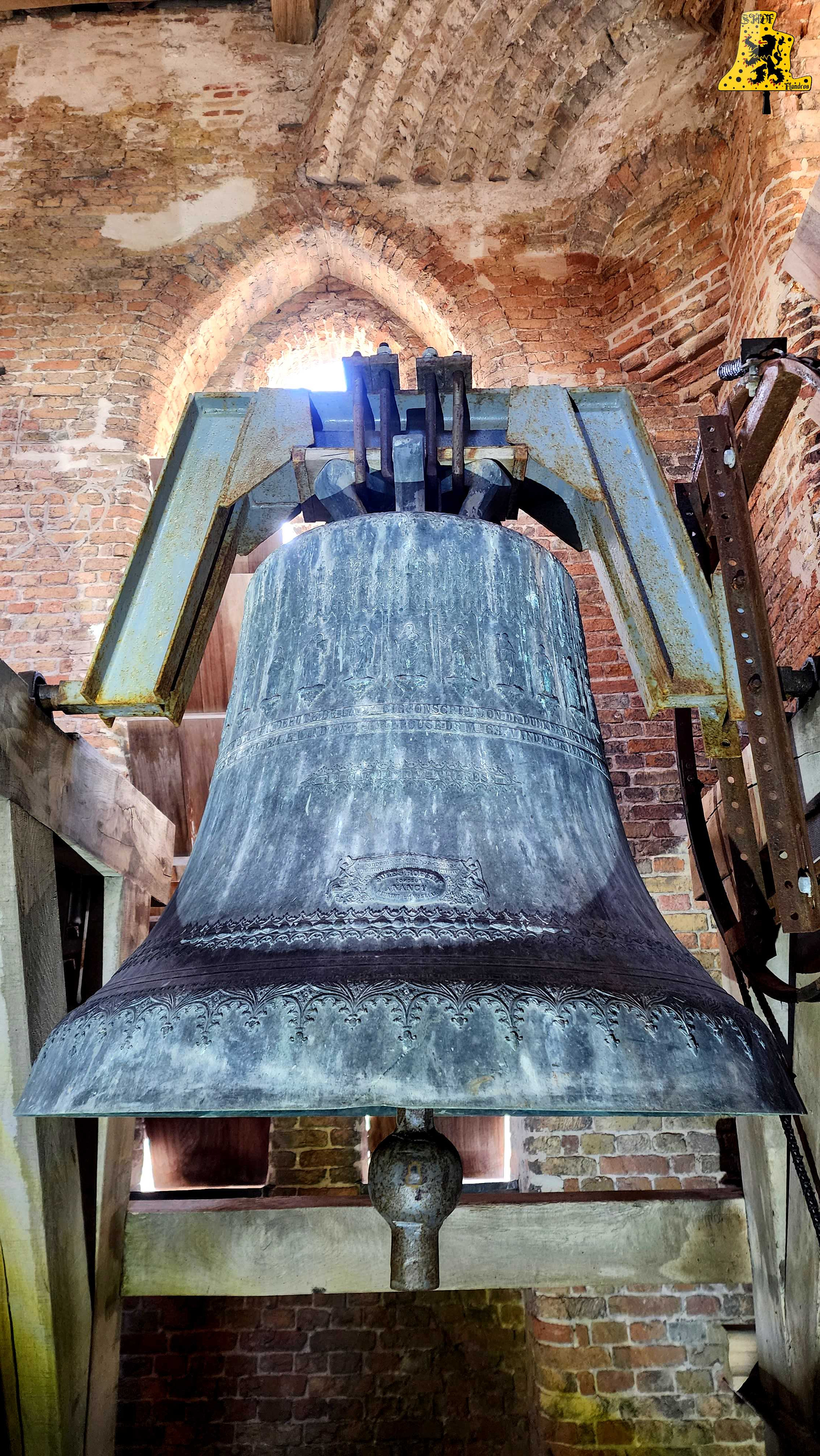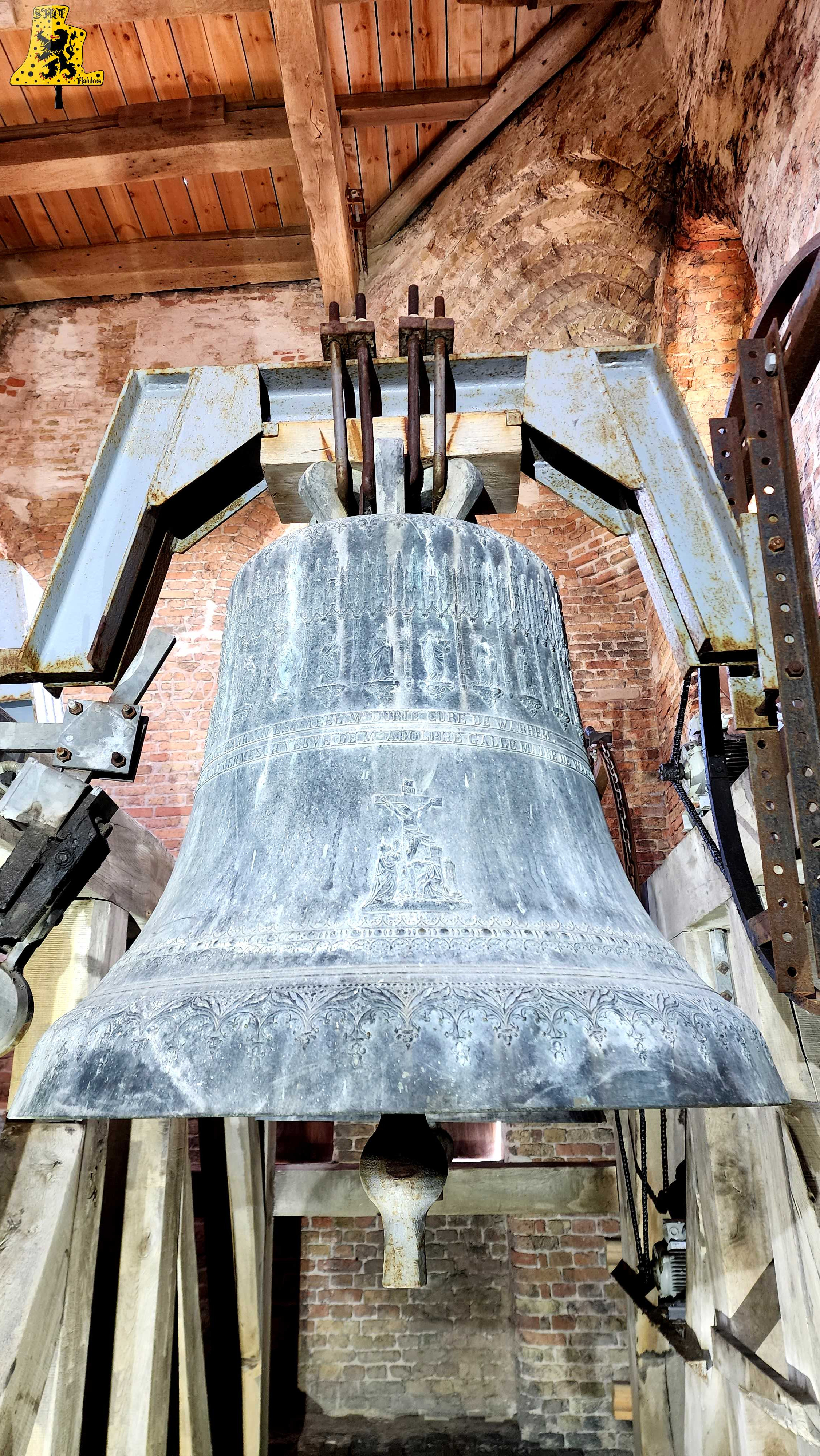 Pour cette 112e découverte campanaire à travers nos campagnes de France, c’est à Warhem que je vais avoir la grande chance de vous y raconter l’histoire des cloches, et de l’église. Lors de cette visite, j’étais accompagné de Mr Seidel, le sacristain de l’édifice, qui m’a permis d’en apprendre davantage sur l’histoire des cloches, à travers la fourniture de précieux documents. Avant toute chose, le village de Warhem se trouve à quelques kilomètres de Dunkerque, peuplé de 2 000 habitants, c’est un village où il y fait bon vivre. Ici, comme partout ailleurs dans l’extrême nord de la France, le patrimoine Flamand y est bien présent, et surtout, conservé, à l’image de son église, fraîchement restaurée. Les origines de l’église de Warhem remontent à l’an 1 208, là où les premiers offices eurent lieu. Elle subit un profond remaniement en 1 650, avec la création de deux nefs latérales, typique de la Flandre, ce style d’église est aussi appelée « Hallekerque. Pour plus d’informations sur l’histoire du lieu, je vous renvoie volontiers sur le site de la commune, qui a rédigée un article très complet à ce sujet. L‘intérieur de l’église vaut largement le détour, notamment par ses retables et son orgue de toute beauté, voyez par vous-même via les photos ci-dessous. Il nous faudra tout de même gravir 97 marches, afin d’arriver au niveaux des cloches, mais l’effort en vaut vraiment le coup. L’histoire des cloches connues, débute avant la révolution. Warhem possédait alors 3 cloches au sein de son clocher. Ces trois cloches furent descendues durant la révolution. Le clocher rasta de ce fait silencieux jusqu’en 1 814. C‘est cette année qu’une cloche fut fondue pour l’église, la fonte au lieu alors au cimetière, par les fondeurs de la fonderie Drouot. D‘après les archives communales, nos ancêtre disait qu’elle sonnait le Fa#. Cette cloche fut bénite le père De-Meyer, et était nommée « Marie-Louise ». En 1 832, le conseil de fabrique voulait acquérir une 2e cloche, pour d’une part, avoir une plus grande variété de sonneries, et d’autre part, pour appeler de plus loin les fidèles, car la petite cloche avait du mal à se faire entendre des paroissiens. C‘est alors qu’une occasion en or se présente. En effet, une des cloches du village de Wyldre (actuellement Wylder) , de taille trop conséquente pour son église et sa tour fraichement reconstruite, était alors en vente, je vous parlerais plus bas, du « Pourquoi une cloche de Wylder à Warhem? », il y a matière à en parler assez longuement. D‘un poids dit par les anciens, de 1 600 kg, il s’avéra qu’au final, en la pensant, cette cloche ne faisait « Que » 1 100 kg, mais cette cloche répondait à toutes les attentes. Elle fut vendue à Warhem pour la somme de 3 400 francs de l’époque. Cette cloche, était un véritable trésor pour nous autres, campanophiles du XXIe siècle, puisqu’elle fut fondue par Ignace de Cock, en Septembre 1 699. Catherine De Zegers-Cappel, de son nom, appartenait donc à ses tous débuts, aux paroissiens de Zergerscappel, tout ça nous le savons, grâce à l’intégralité de ses inscriptions, rédigés en Flamand. Et cela fait sens, de par la présence d’une petite cloche à Zergerscappel, fondue en 1 716, par Ignace De Cock, dont j’ai eu la chance de découvrir il y a voilà maintenant 4 ans. Elle fut choisie par le village de Wylder à la suite de la destruction de ses 3 cloches, lors de l’incendie de l’église, survenu en 1 795. Wylder avait le droit de choisir une cloche parmi tant d’autres, appartenant aux villages des environs. Ils choisirent naturellement, la plus belle des cloches, celle de Zegers’. Mais voyant que la nouvelle tour ne pouvais pas supporter la cloche, de par son poids et sa taille, la décision fut prise à contrecœur, de la vendre. Elle sonna de nombreuses années, mais en 1900, les habitants se rendirent compte que la cloche avait perdu de sa superbe, le consta est sans appel, la cloche possède une fêlure, qui ne cesse de grandir. C‘est alors que la décision fut prise de la réparer, avec l’approbation des habitants. C‘est le fondeur Jules Robert, de Nancy, qui fut choisi. C‘était une chance incroyable pour lui, de pouvoir essayer de se faire connaître en pays Flamand. Le projet de base voulait que seule la grosse soit refondue, mais lors de son expertise, Jules Robert constata que la cloche était de mauvaise qualité et usée. La décision fut donc de refondre les deux, pour former 3 cloches. Ce sont donc au total 2 850 kg de bronze qui ont été coulé, soit, 950 kg de plus que la refonte intégrale des deux cloches, comme le prévoyait le projet initial. Marie-De-L’Assomption est la plus grosse des cloches, d’un poids de 1 600 kg, cette cloche possède un diamètre de 135 cm environ. Elle a pour parrain Mr Heervader-Edouard Vandaele-Vermersh, et pour marraine, dame Octavie Clément. Pour la moyenne, pesant 800 kg, c’est Mr Henry Cochin, député de la 2e circonscription de Dunkerque, et maire de Saint-Pierre-Brouck. Sa marraine est Mme Euphémie Vendewéghe, épouse du maire de Warhem, Mr Ch. Vandeale. Cette belle cloche porte le nom de Thérèse. La petite cloche, portant les noms de Louise-Sebastien-Winoc, pèse 450 kg, son diamètre est d’environ 90 cm. Son parrain est Mr Abel Durie, abbé de Warhem, et sa marraine, Mme Louise Vermersch. Les cloches sont montées sur un très beau beffroi en bois, bien que leur type de sonnerie à la volée soit le lancé rétro-grade, leur rythme est bon, et la pureté du son est indéniable! Et que dire de leurs décors absolument somptueux! La finesse des moulures, le choix des décors, tout y est absolument majestueux! C’est un quasi sans-faute !