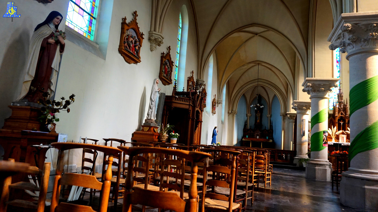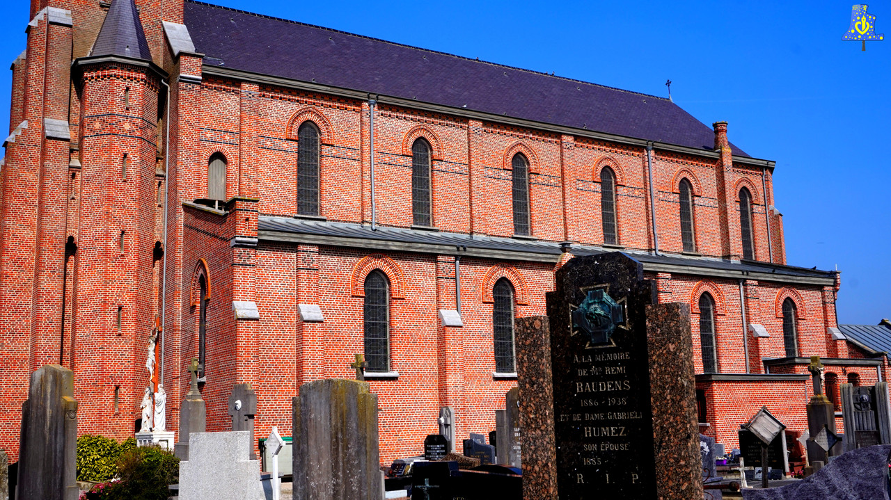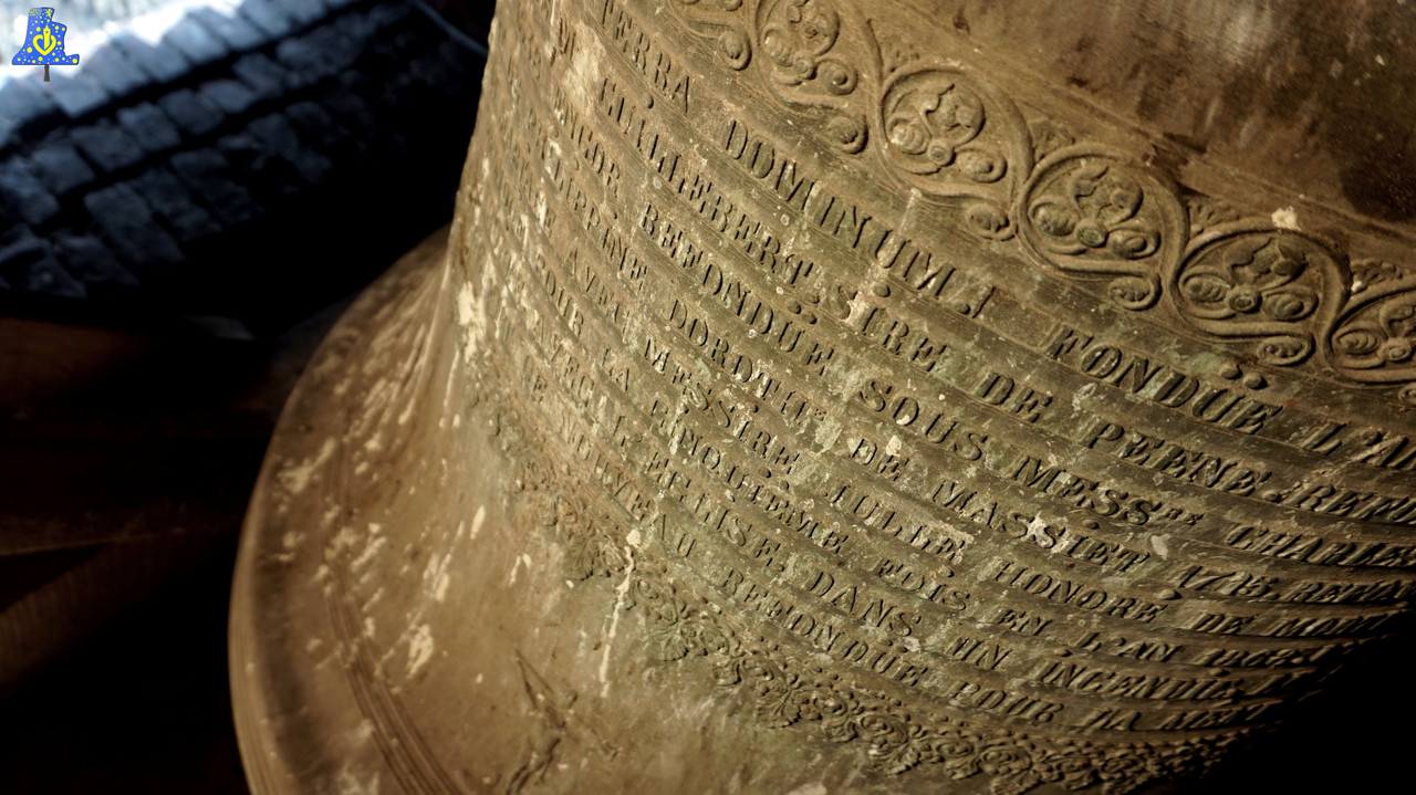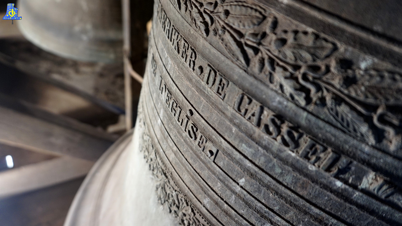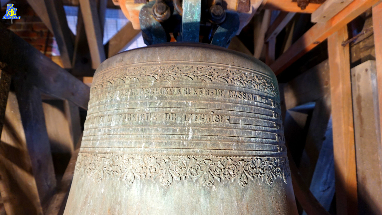 C‘est avec un soleil radieux que je me suis rendu à Zuytpeene, qui est la dernière commune de France de l’ordre alphabétique. Après avoir gravi les environs 80 marches, il nous est permis de voir les deux cloches de l’église. La plus petite n’est plus en état de marche, du moins, pour la volée, puisqu’elle tinte les heures, la roue de volée est pris dans l’échelle qui mène sous la charpente du clocher, un devis est cependant sur la table, mais ce n’est pas pour tout de suite. Cette cloche a été fondue par P. & C. Drouot, à Douai, en 1 889. Elle donne la note du Sol3 et pèse près de 600 kg. Elle porte le nom de Marie-Louise-Julie-Prudence. Nous pouvons aisément dire qu’il s’agit d’une refonte d’une cloche de 1 868, détruite durant l’incendie de l’église. Sa grande sœur, de même époque et de même fondeur, porte le nom de « Waast-Roch-Justine-Caroline. Ses nombreux décors et inscriptions nous dictent une grande, très grande partie de son histoire mouvementée. En 4 ans de découvertes campanaires, c’est la première fois que de telles informations sont lisibles sur des inscriptions! La Cloche fut fondue à la base en l’an 1 362, et était en place très certainement dans la chapelle Notre-Dame, chapelle édifiée au village en 1 306. Cette cloche a été par la suite, refondue en 1 638. Cette même cloche nous dit de par ses inscriptions, qu’elle fut refondue une 3e fois en 1 715… Puis, 50 ans plus tard, en 1 766, elle est encore une fois refondue! C‘est fini? Non pas encore! Puisque pour la 5e fois, cette cloche va naître, c’est en l’an 1 868, mais hélas, comme sa petite sœur, elle se brisa durant l’incendie, et fut refondue pour la dernière fois en 1 889. C‘est vraiment une découverte exceptionnelle de par ses inscriptions qui nous retracent l’histoire de cette cloche depuis plus de 650 ans! C’est pas une grosse sonnerie, ni une sonnerie avec un gros nombre de cloches, mais peu importe, j’ai pris un réel plaisir qu’à monter dans ce clocher pour le moins effilé.